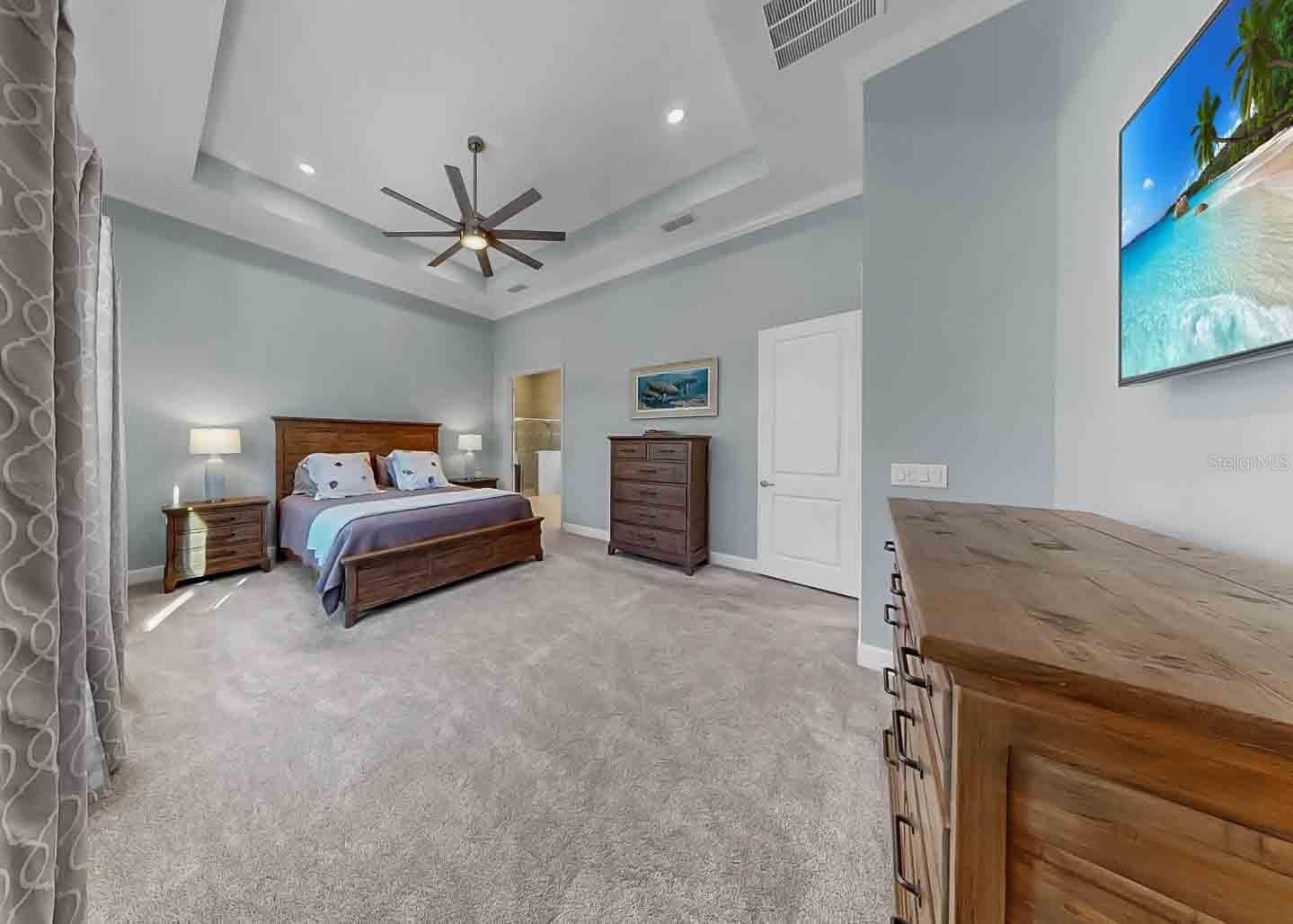 - Ceiling Fan(s), Crown Molding, Eat-in Kitchen, High Ceilings, Kitchen/Family Room Combo, Open Floorplan, Main Level Primary, Smart Home, Solid-Wood Cabinets, Stone Counters, Thermostat, Walk-In Closet(s)