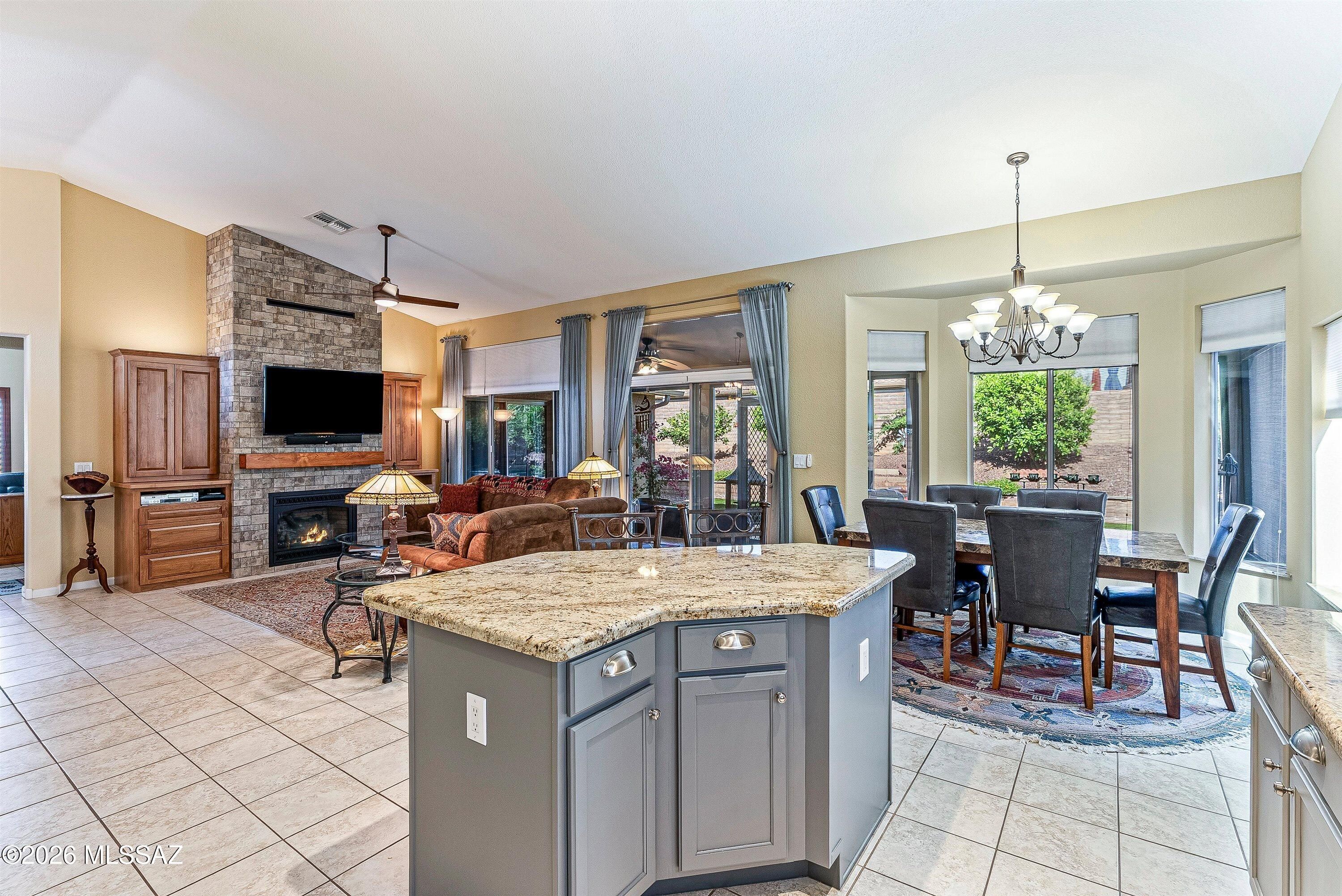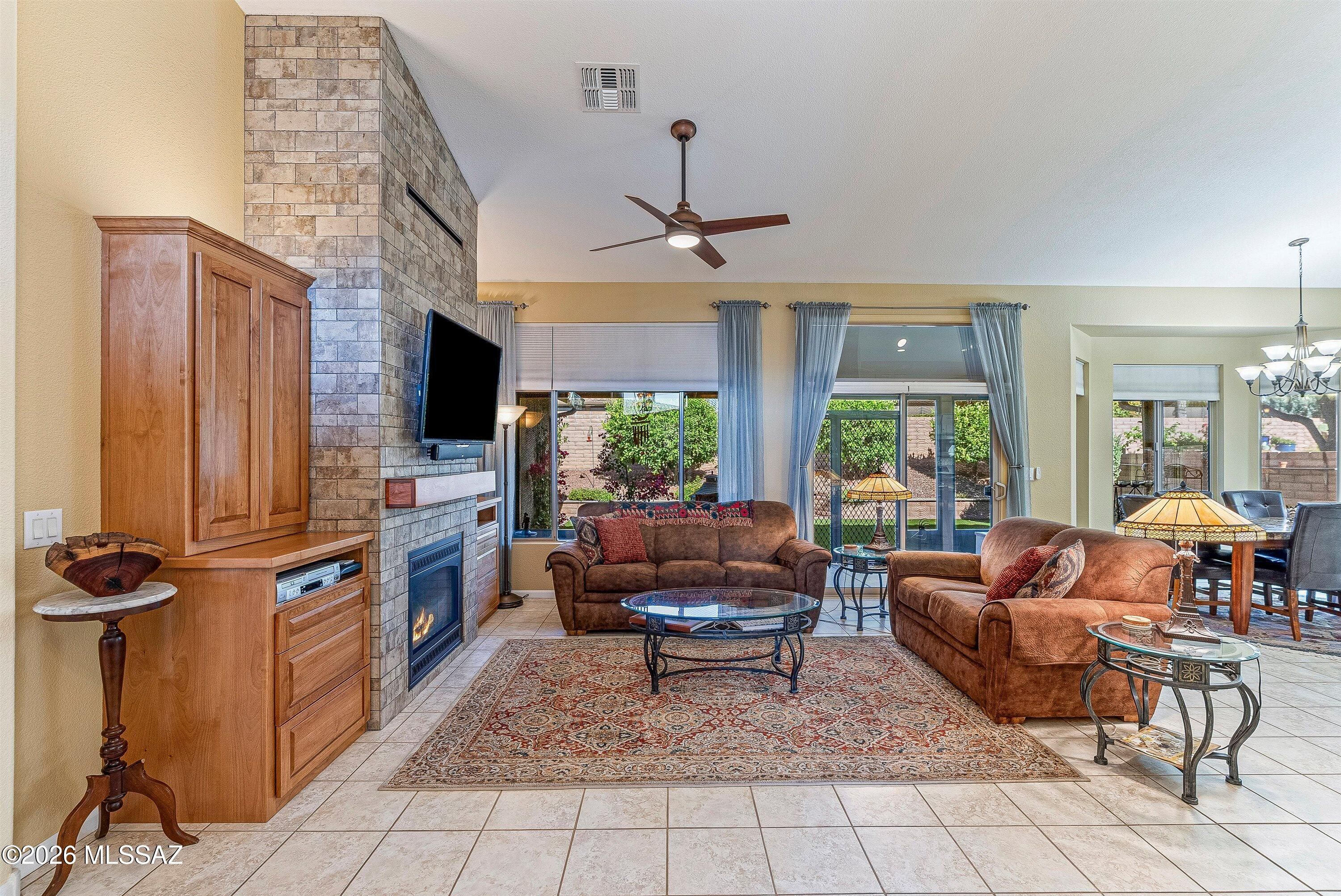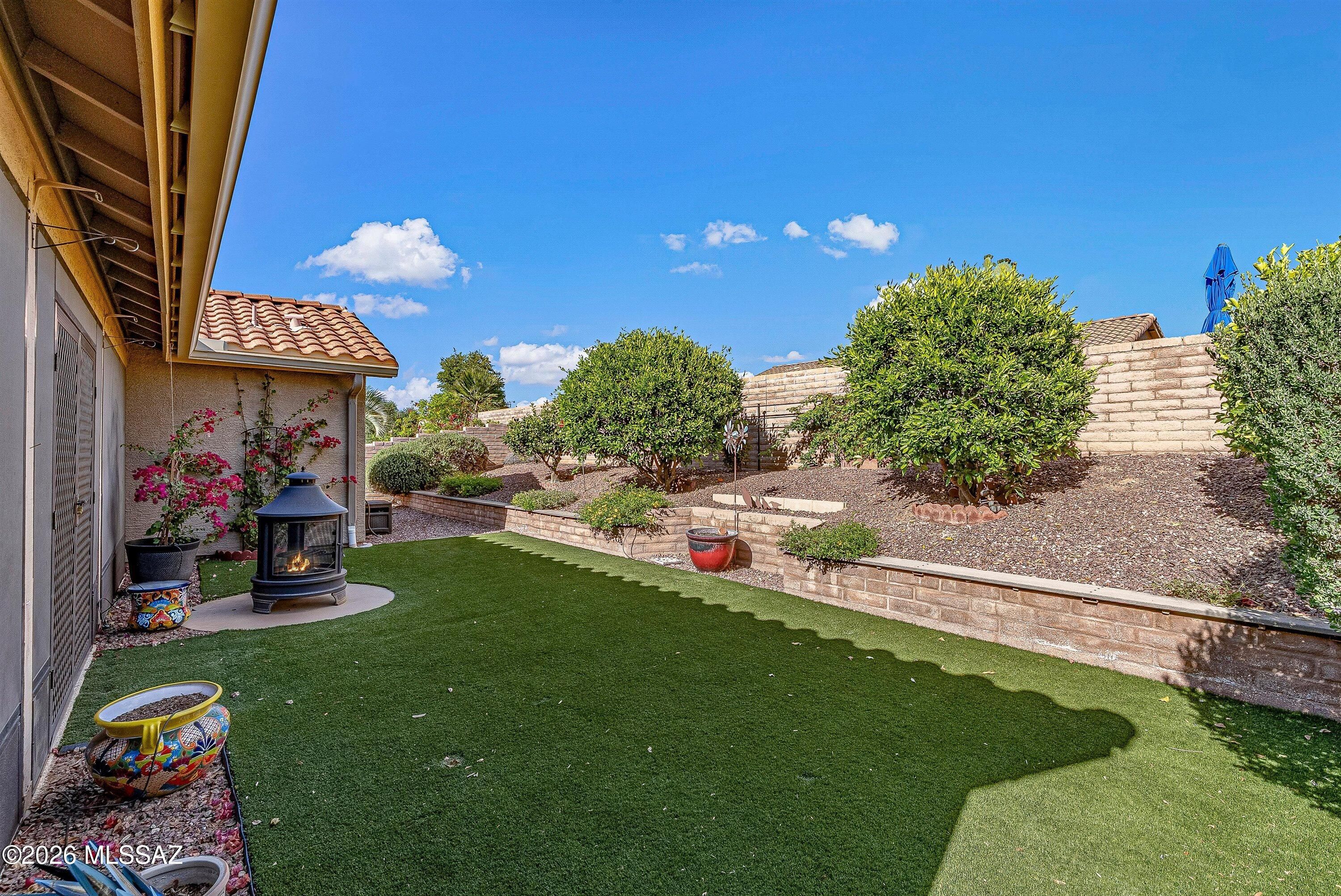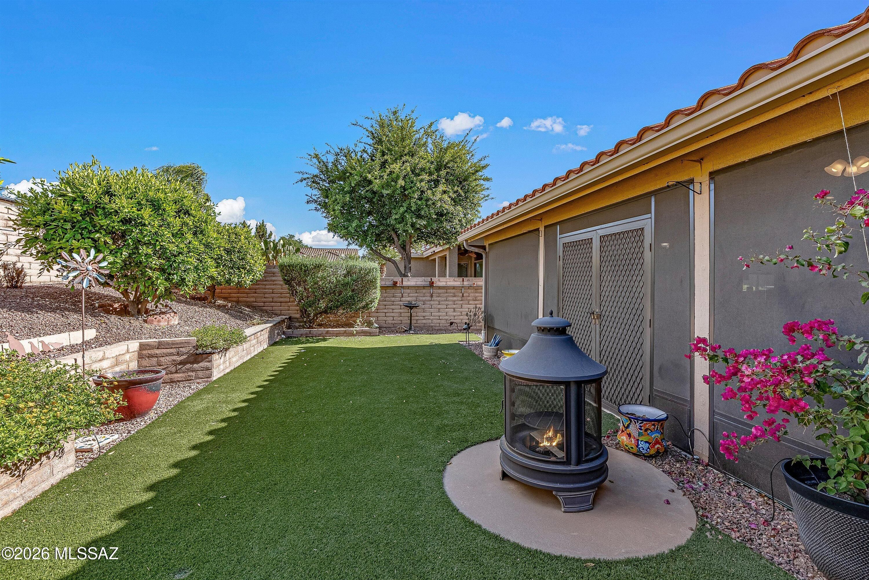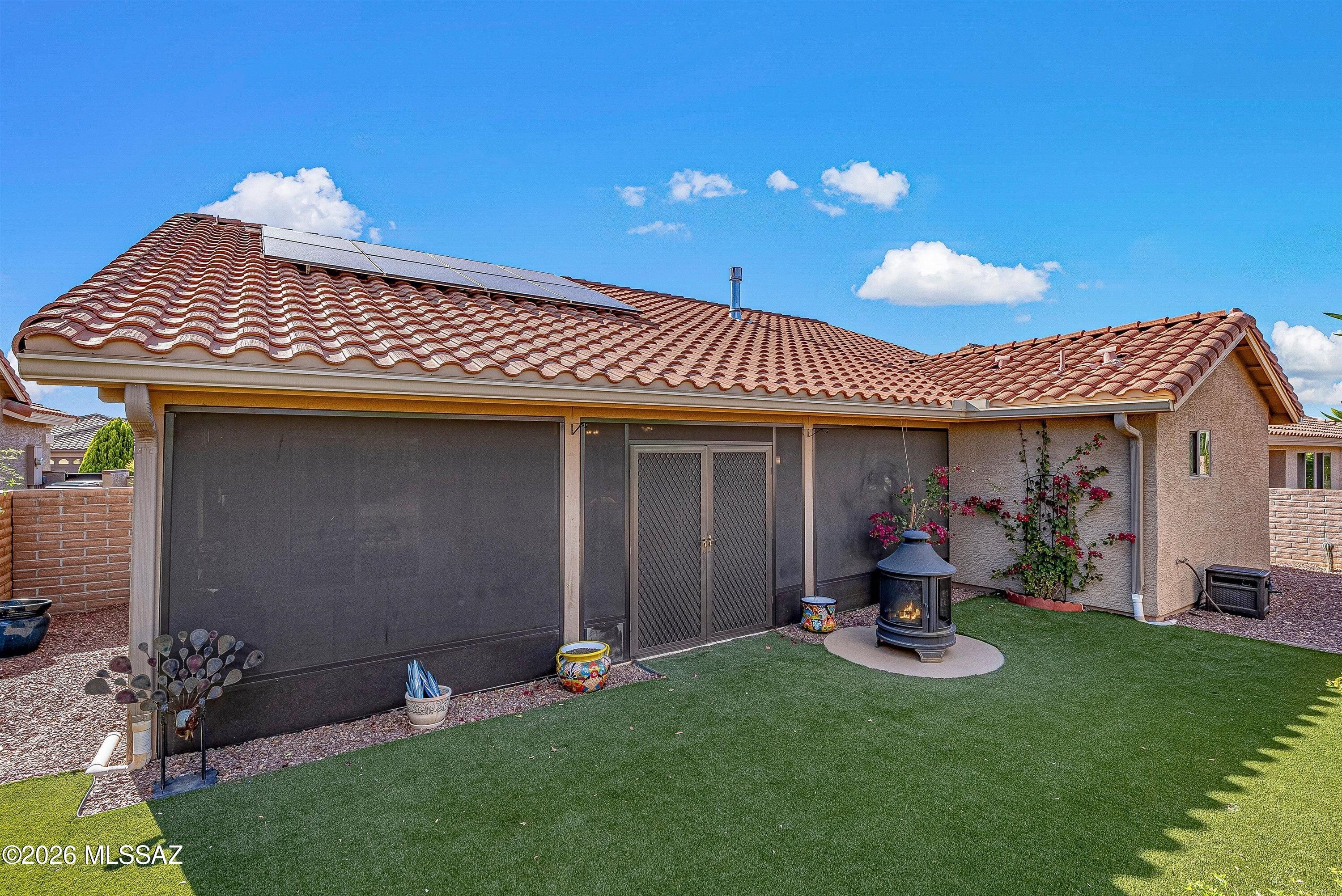 Beautifully maintained single-story in Quail Creek, Green Valley's premier 55+ active adult community. Vaulted ceilings and an open great room centered on a stacked-stone fireplace with custom built-ins. Updated kitchen features granite counters, stainless appliances, gas range, tile backsplash, and island seating. Expansive screened patio extends your living space year-round, overlooking a low-maintenance backyard with artificial turf, outdoor fireplace, mature fruit trees and blooming bougainvillea. Solar keeps utility costs low. Enjoy Quail Creek's resort-style amenities: two golf courses, clubhouses, pools, fitness center, pickleball, tennis, and endless social clubs. Move-in ready and waiting for your next move!