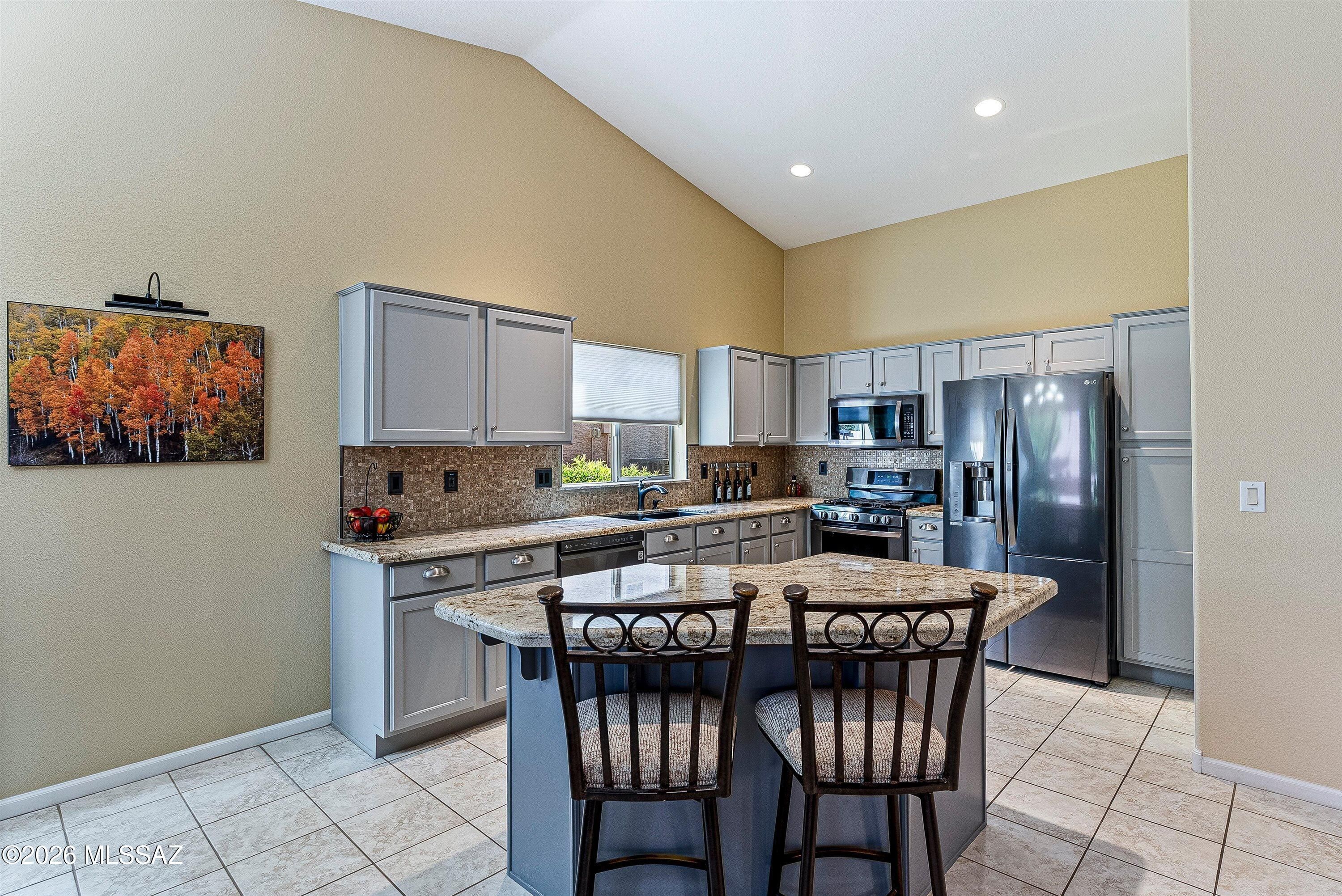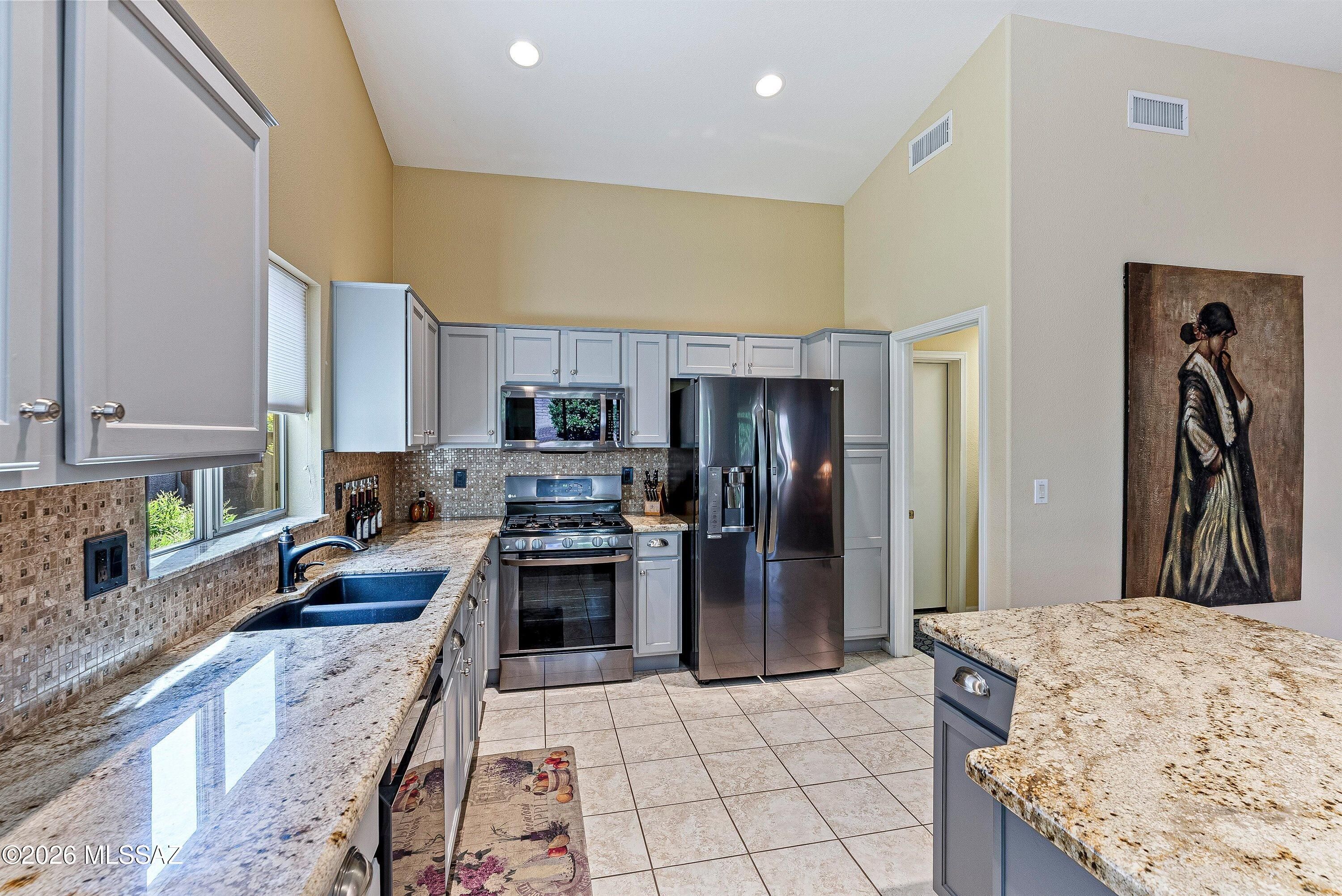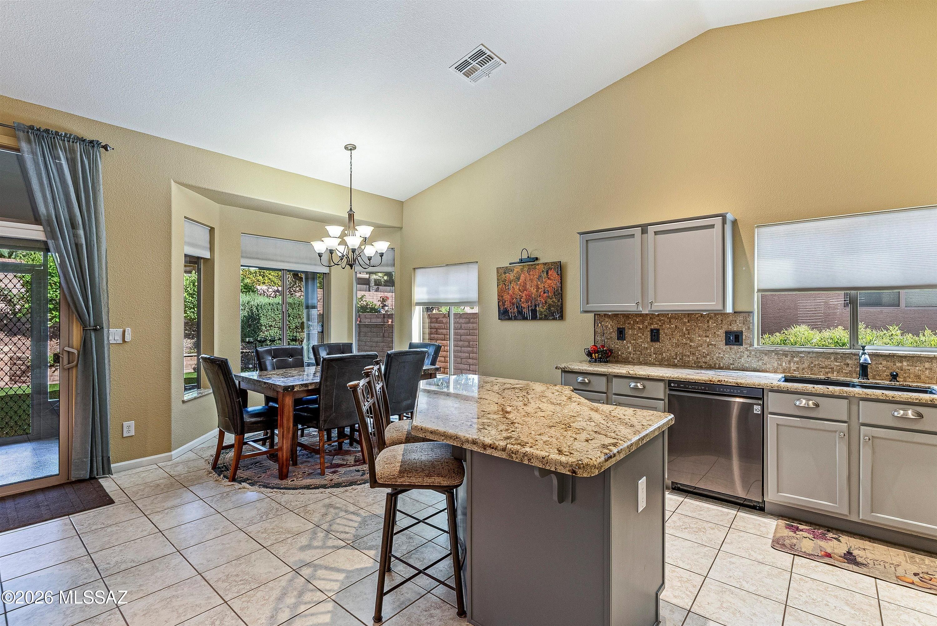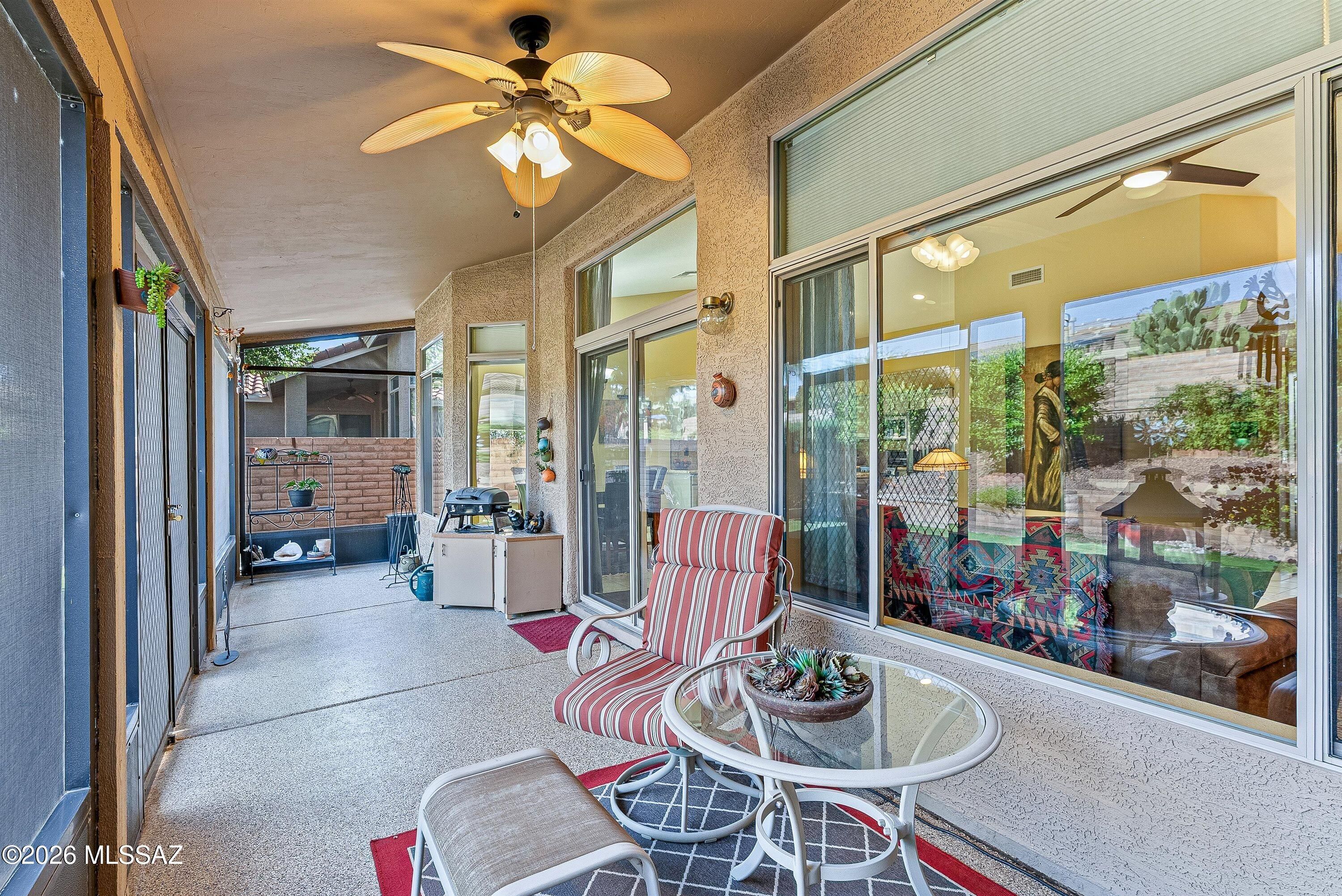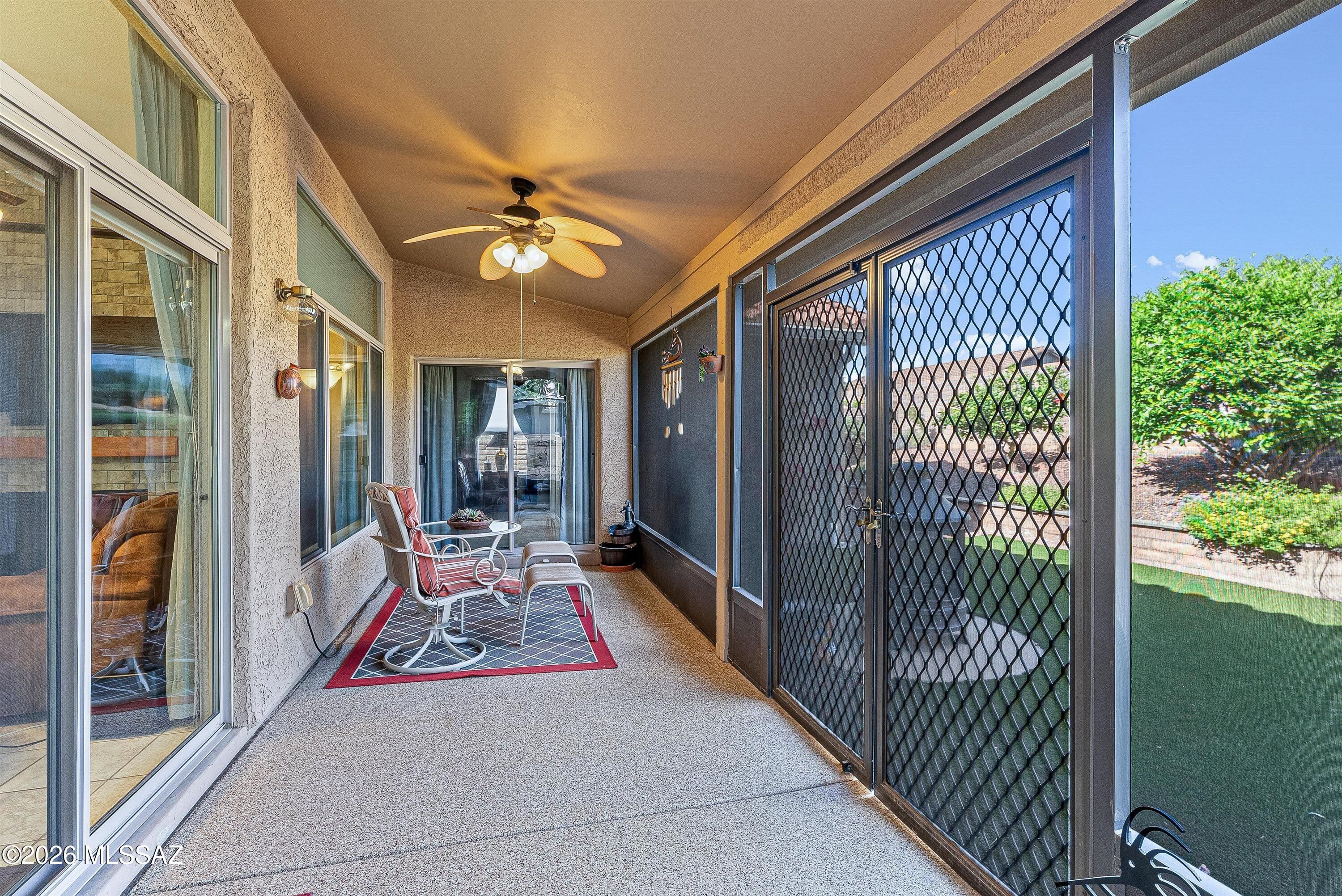 Beautifully maintained single-story in Quail Creek, Green Valley's premier 55+ active adult community. Vaulted ceilings and an open great room centered on a stacked-stone fireplace with custom built-ins. Updated kitchen features granite counters, stainless appliances, gas range, tile backsplash, and island seating. Expansive screened patio extends your living space year-round, overlooking a low-maintenance backyard with artificial turf, outdoor fireplace, mature fruit trees and blooming bougainvillea. Solar keeps utility costs low. Enjoy Quail Creek's resort-style amenities: two golf courses, clubhouses, pools, fitness center, pickleball, tennis, and endless social clubs. Move-in ready and waiting for your next move!
