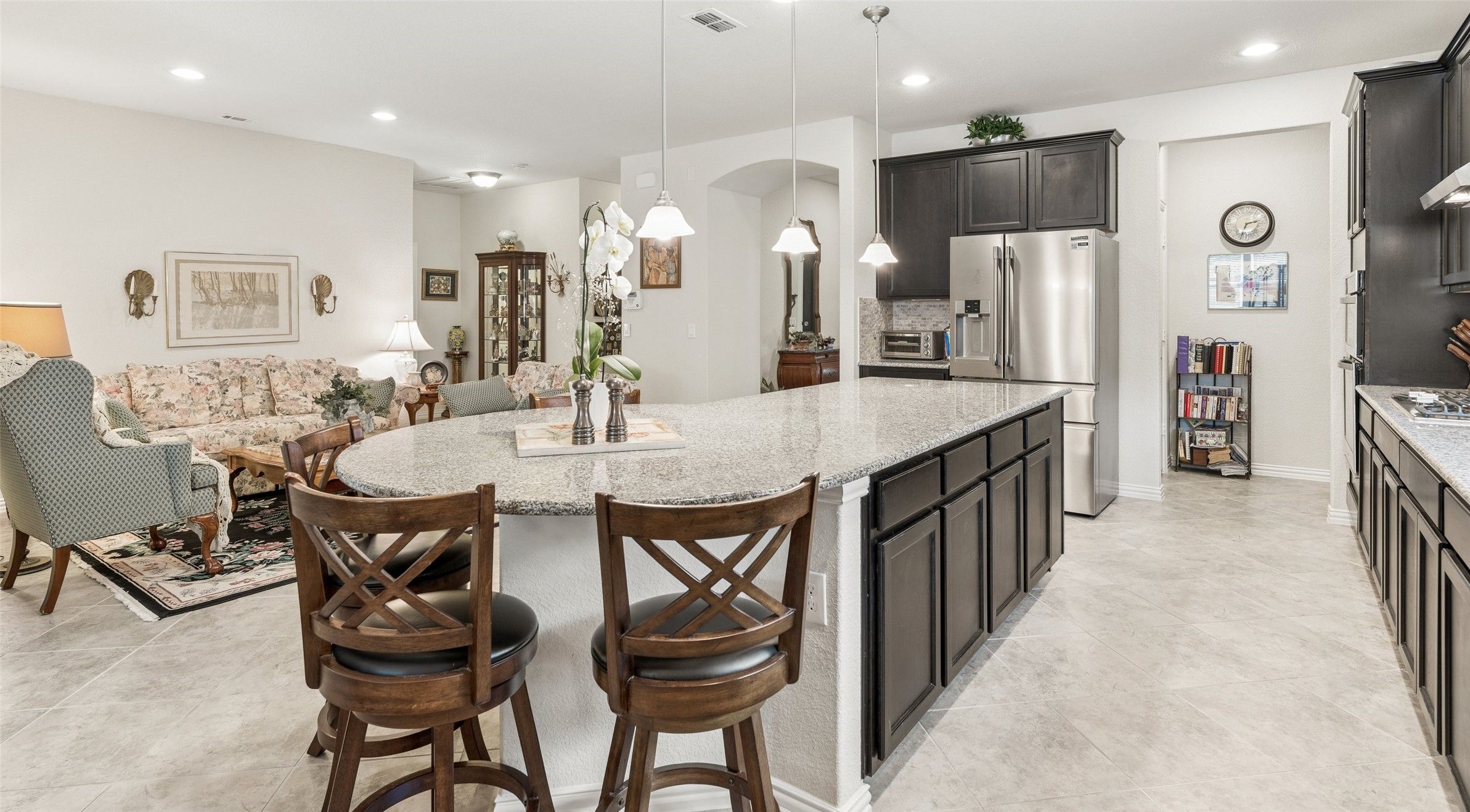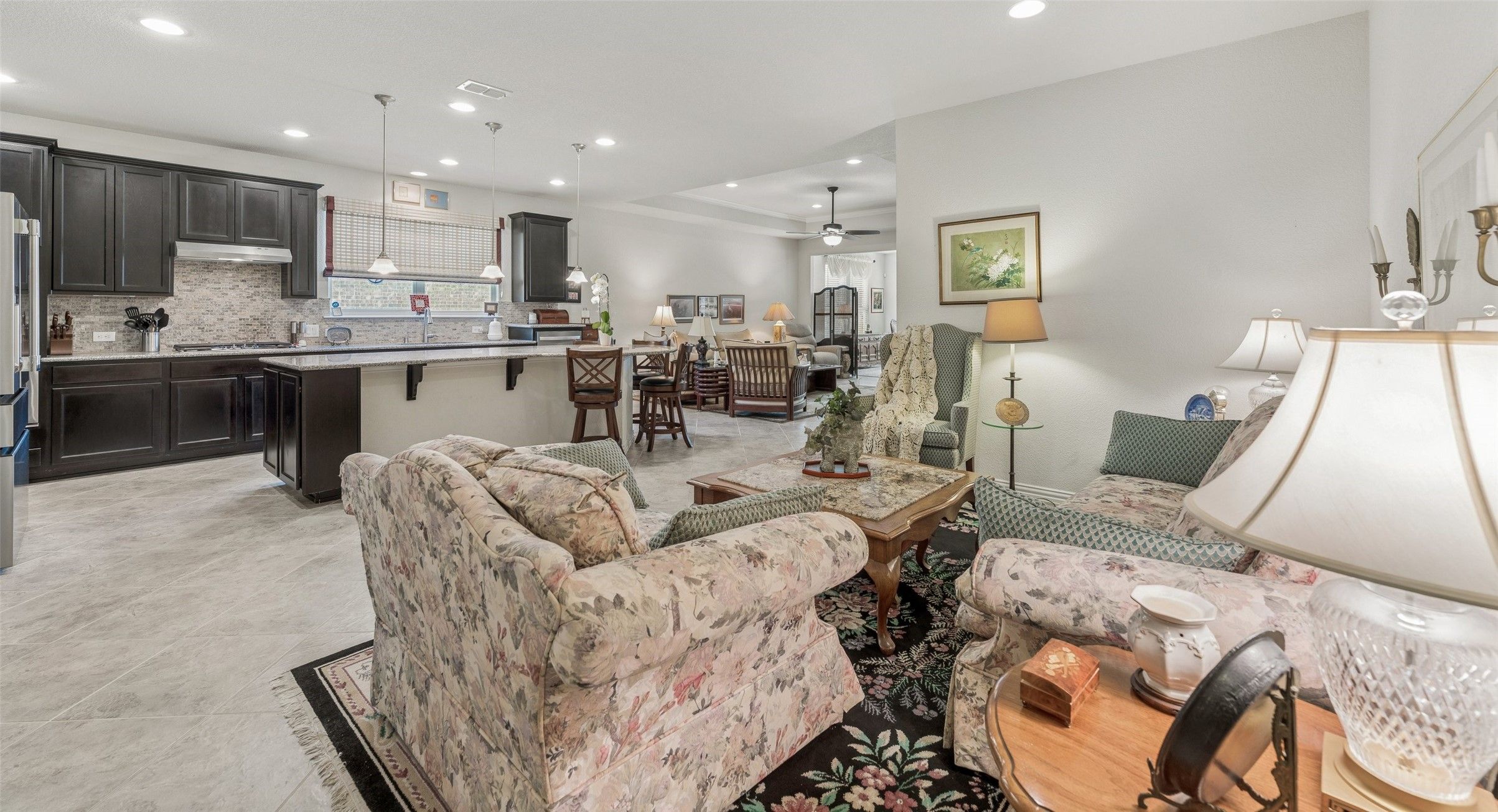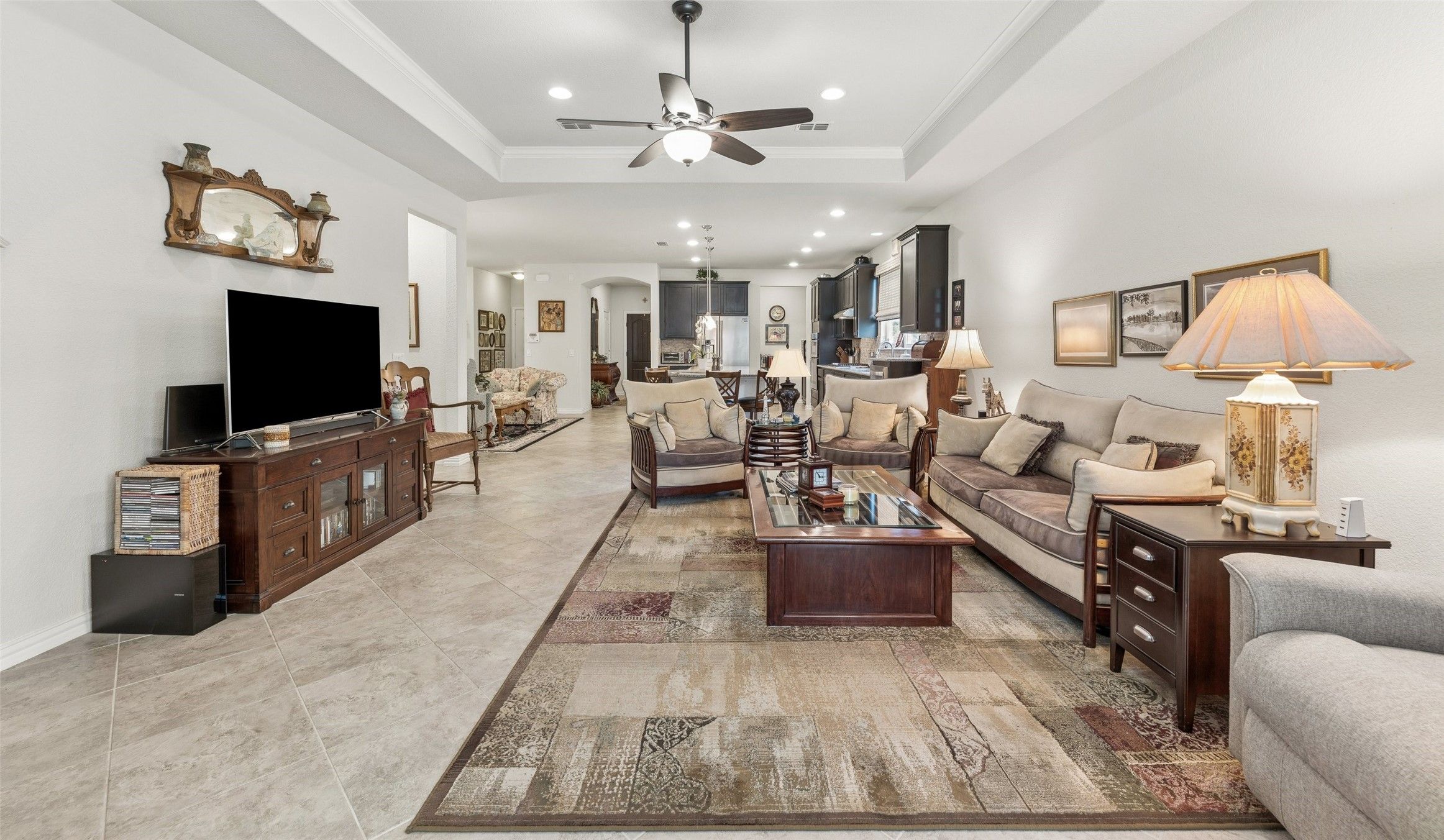 Welcome to this beautifully maintained 2-bedroom home in the highly sought-after Frisco Lakes by Del Webb 55+ community, where comfort, style, and an active lifestyle come together. As you arrive, you’re greeted by an inviting front patio with beautiful landscaping—perfect for enjoying your morning coffee or relaxing in the evenings. Inside, tile flooring flows throughout the main living areas, creating a clean, cohesive look. The spacious living room features a striking tray ceiling and cozy fireplace, along with a flexible sitting area ideal for reading, entertaining, or hobbies. Just off the living room, the kitchen is both functional and stylish, offering granite countertops, a gas cooktop, pantry, and a large island with rounded seating—perfect for casual dining or gathering with guests. The home is also equipped with a whole-home water filtration system, providing clean, great-tasting water throughout—no more bottled water needed. Just beyond, an extended space currently used as the dining area provides an excellent setting for hosting and everyday meals. A dedicated office offers a quiet workspace or flex room. The primary suite is a relaxing retreat with a tray ceiling and fan, while the en-suite bathroom features dual sinks, a linen closet, and an oversized walk-in shower. Enjoy the outdoors year-round from the screened-in patio complete with two ceiling fans—ideal for relaxing without the Texas bugs. Residents of Frisco Lakes enjoy exceptional amenities, including a stunning clubhouse, outdoor pools, golf course, pickleball courts, bocce ball, ping pong, and a full calendar of social activities. This home offers a wonderful blend of comfort, flexibility, and vibrant community living—schedule your showing today!