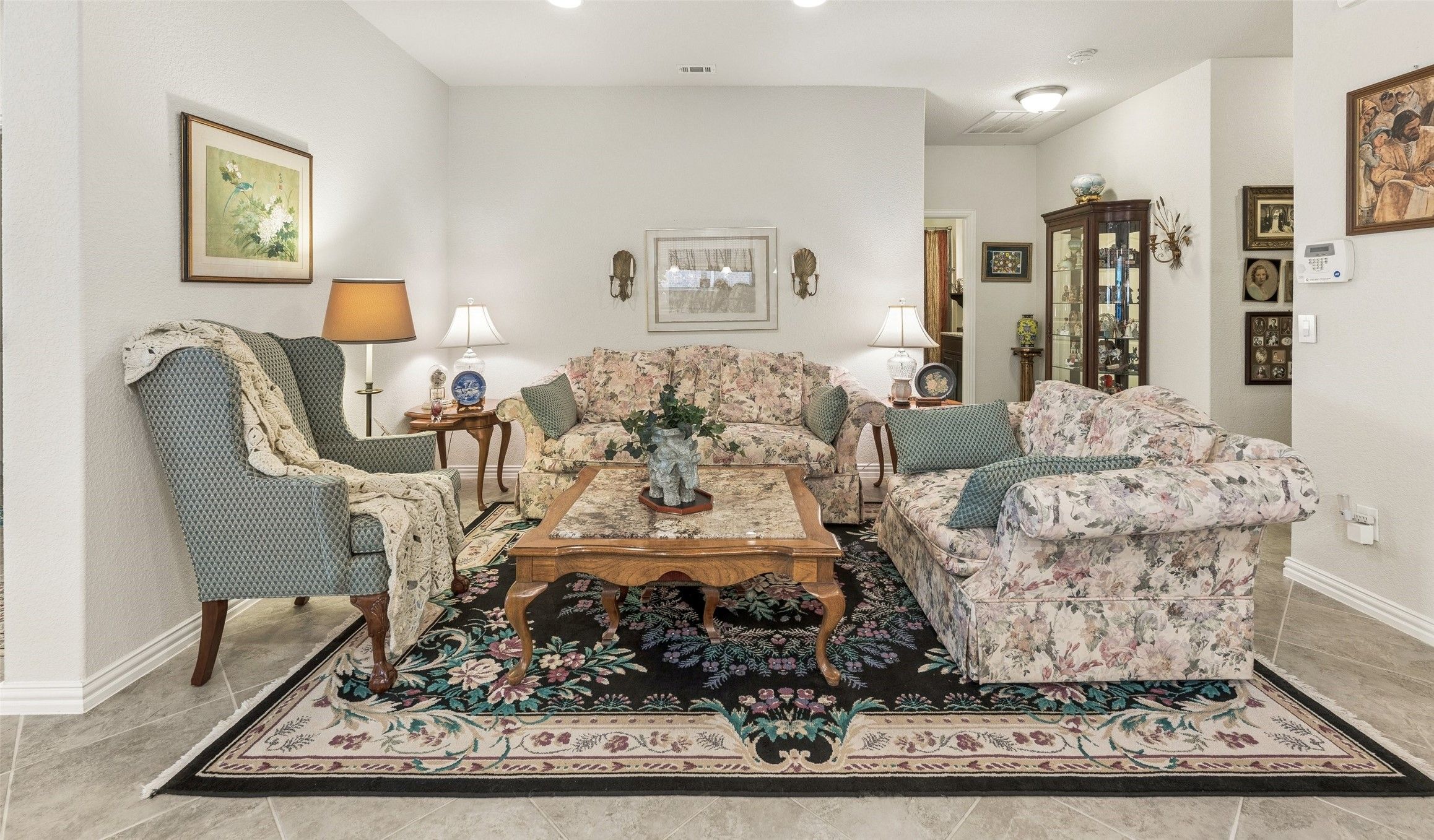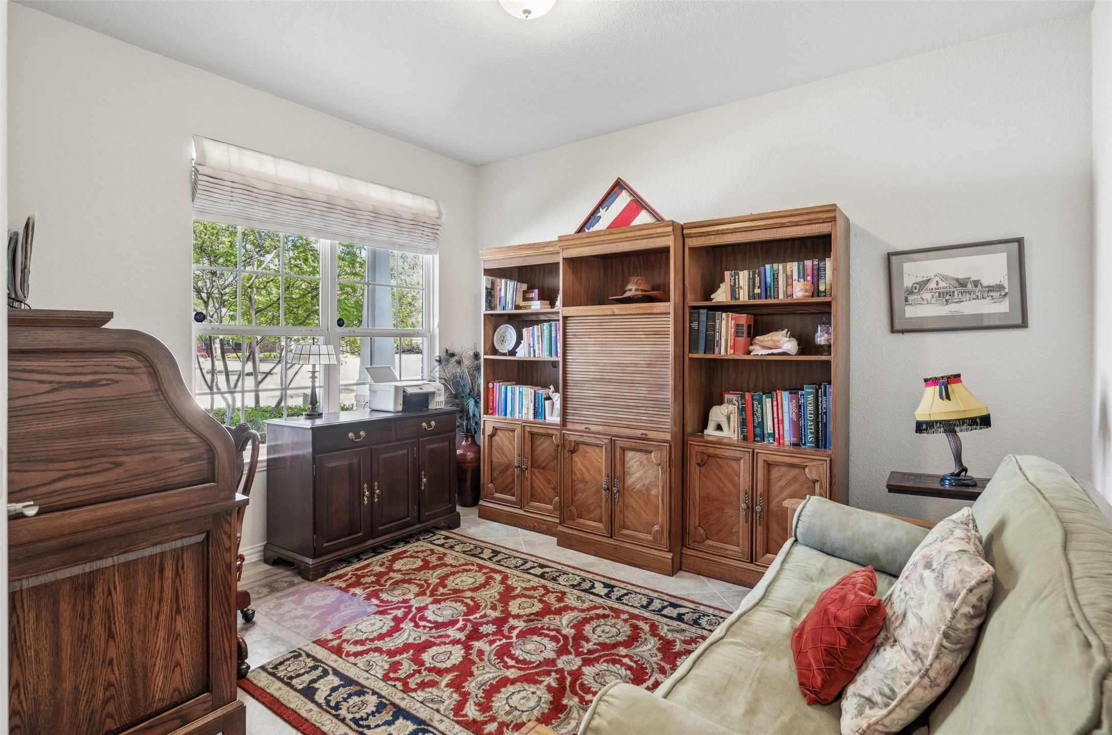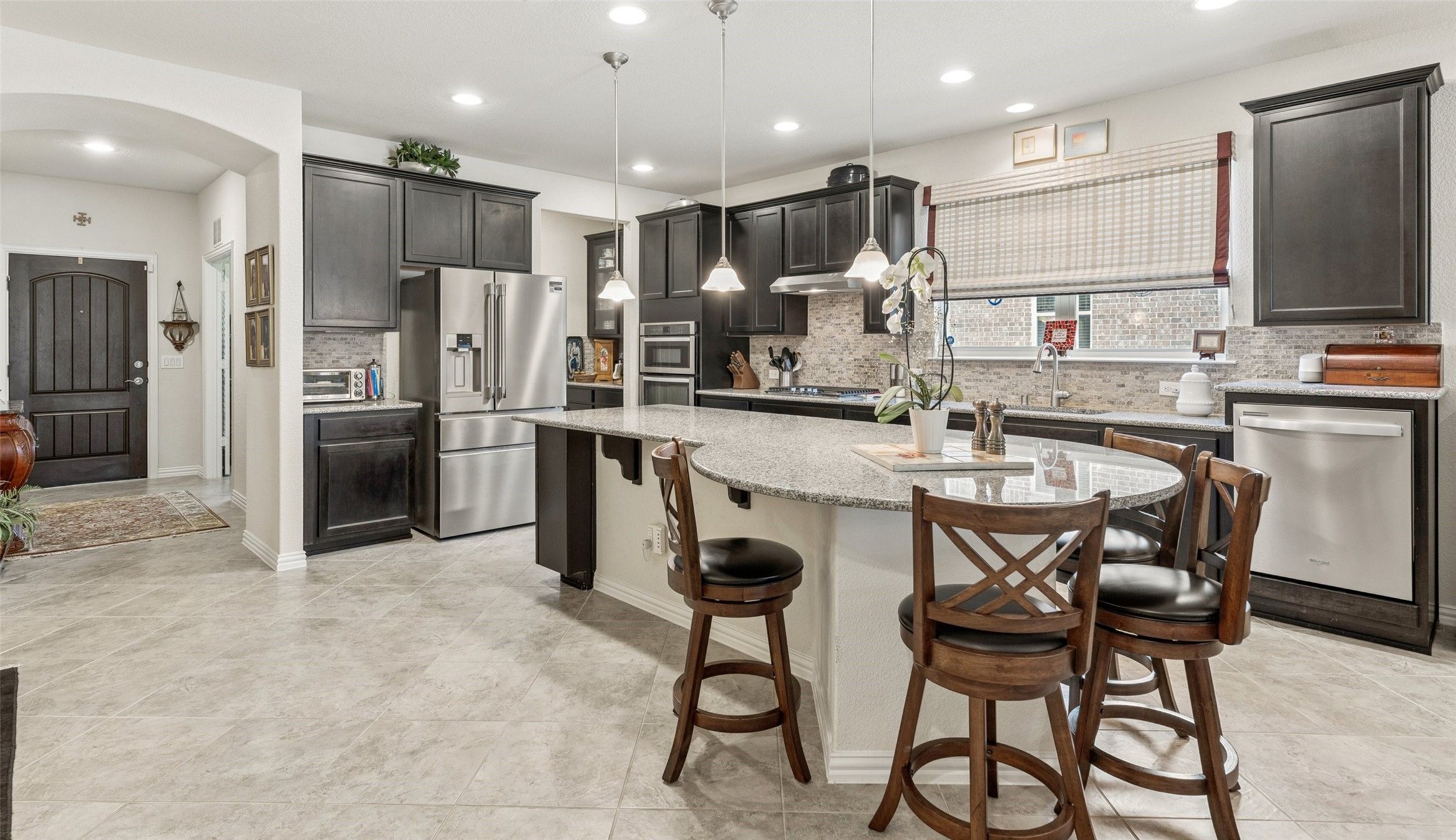 Welcome to this beautifully maintained 2-bedroom home in the highly sought-after Frisco Lakes by Del Webb 55+ community, where comfort, style, and an active lifestyle come together. As you arrive, you’re greeted by an inviting front patio with beautiful landscaping—perfect for enjoying your morning coffee or relaxing in the evenings. Inside, tile flooring flows throughout the main living areas, creating a clean, cohesive look. The spacious living room features a striking tray ceiling and cozy fireplace, along with a flexible sitting area ideal for reading, entertaining, or hobbies. Just off the living room, the kitchen is both functional and stylish, offering granite countertops, a gas cooktop, pantry, and a large island with rounded seating—perfect for casual dining or gathering with guests. The home is also equipped with a whole-home water filtration system, providing clean, great-tasting water throughout—no more bottled water needed. Just beyond, an extended space currently used as the dining area provides an excellent setting for hosting and everyday meals. A dedicated office offers a quiet workspace or flex room. The primary suite is a relaxing retreat with a tray ceiling and fan, while the en-suite bathroom features dual sinks, a linen closet, and an oversized walk-in shower. Enjoy the outdoors year-round from the screened-in patio complete with two ceiling fans—ideal for relaxing without the Texas bugs. Residents of Frisco Lakes enjoy exceptional amenities, including a stunning clubhouse, outdoor pools, golf course, pickleball courts, bocce ball, ping pong, and a full calendar of social activities. This home offers a wonderful blend of comfort, flexibility, and vibrant community living—schedule your showing today!