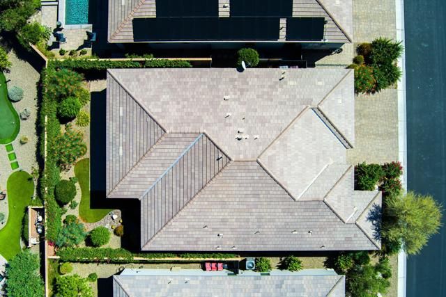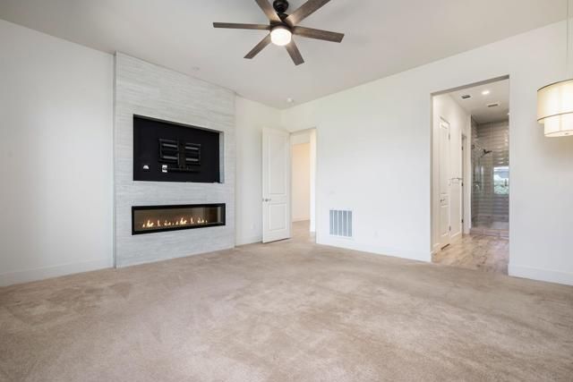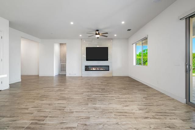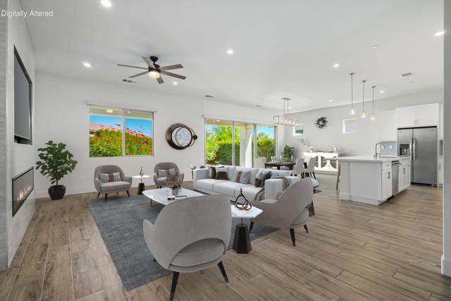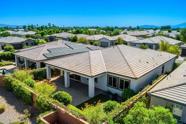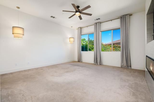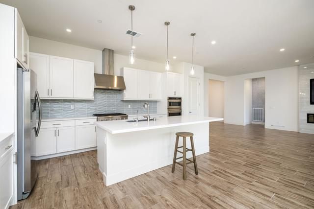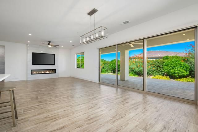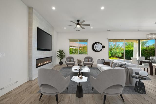 This beautifully appointed Liberty plan, located within the prestigious gated Trilogy Polo Club by Shea Homes, offers 2,367 square feet of refined single-level living with 3 bedrooms, 3 bathrooms, and a versatile den/office enhanced by elegant glass barn doors. The entry welcomes you through a custom front door into an inviting foyer with tile plank flooring and upgraded baseboards, leading into the expansive great room showcasing an open-concept design centered around two separate floor-to-ceiling tiled decorative fireplaces and a TV niche. The chef's kitchen is a true centerpiece, featuring quartz countertops, shaker cabinetry with brushed nickel hardware, a spacious prep island with seating and pendant lighting, subway tile backsplash, stainless steel appliances, built-in ovens, and a 6-burner gas cooktop with custom hood. Additional enhancements include under-cabinet motion-detecting lighting and rechargeable mounted lights thoughtfully placed throughout the home for added ambiance and convenience. Guest accommodations provide comfort and privacy, with two of the three full bathrooms offering en suite access and two bedrooms featuring walk-in closets. The luxurious primary retreat includes one of the fireplaces and offers an en suite bath with quartz countertops, dual vanities, a beautifully tiled shower, and a walk-in closet with custom organizers. The home's window treatments combine elegance and ease with a mix of decorative hanging drapes and remote-controlled shades. Outdoor living is equally impressive with a serene covered paver patio, professional landscaping with accent lighting, and ample space to relax or entertain. Additional highlights include a custom-designed garage with epoxy flooring, built-in cabinetry, and a separate golf cart garage. The property also features a premium 5-ton Lennox Signature Collection gas heating and cooling system with UV sterilization and a single, whole-house attic air filter replaced annually--eliminating the need for multiple filter changes and ensuring superior indoor air quality. This home is truly a must-see for those seeking style, function, and sophistication in one of the desert's premier lifestyle communities.