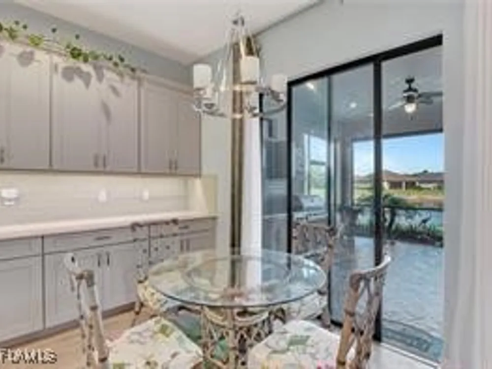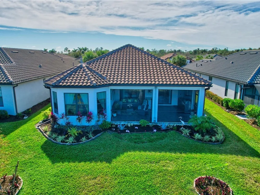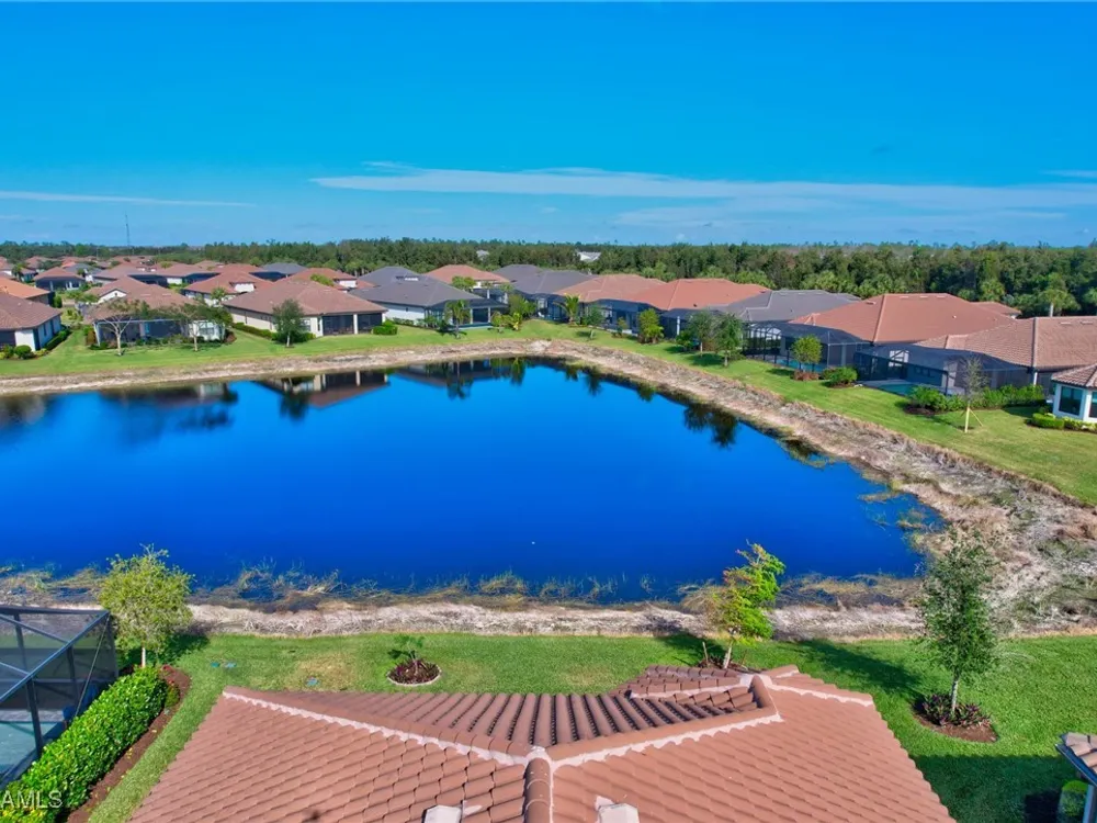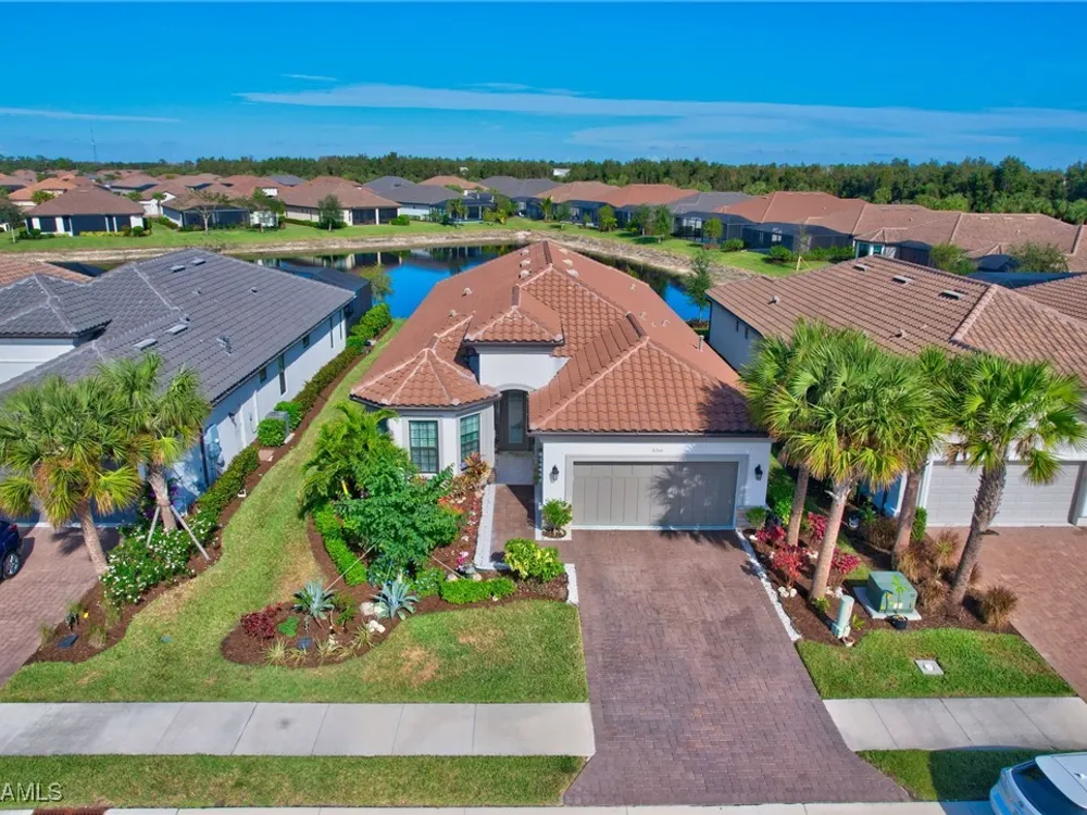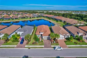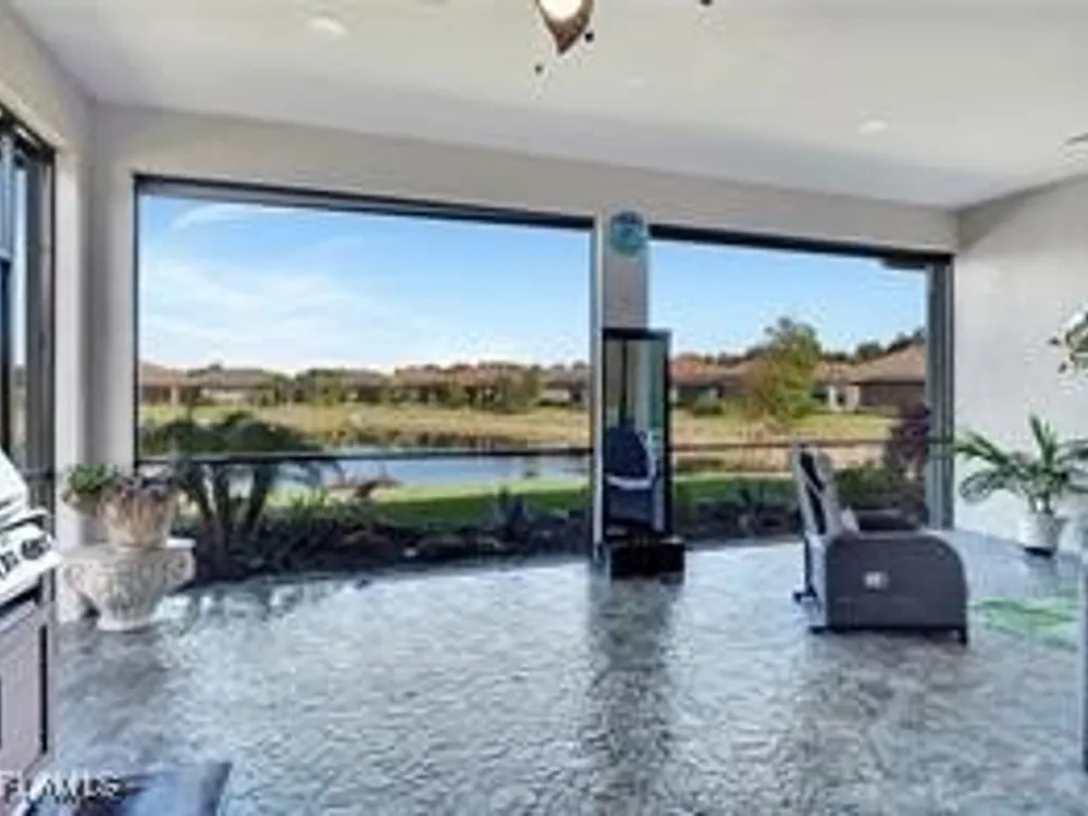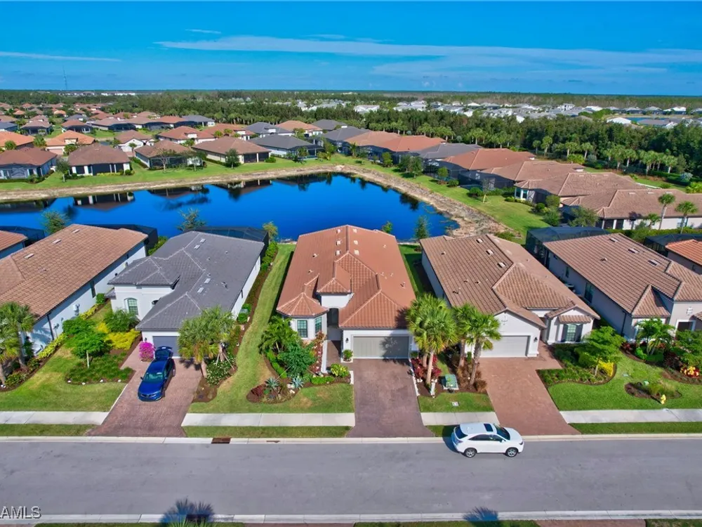 Discover an exquisite lakefront retreat, completed in December 2021, surrounded by beautiful landscaped front and rear grounds. This 2,373 sq. ft. single-family home embodies the coveted Lazio open-floor plan, featuring 3 expansive bedrooms, 3 full bathrooms, a versatile den, and a delightful covered lanai. Encompassing 2,884 sq. ft., the property includes a lanai and patio enhanced by a built-in outdoor kitchen (gas). Notable features include premium lanai storm/hurricane protection screens, rich hardwood flooring throughout, elegant bay windows in the master and guest bedrooms, a substantial walk-in closet, refined tray ceilings, and stylish recessed lighting. Nestled in a secure, gated, resort-style community, residents enjoy an impressive suite of amenities: a cutting-edge fitness center, welcoming community room, ping pong and pool tables, dedicated game and yoga rooms, a serene spa, a heated pool, a resistance lap pool, a charming poolside cabana, lounge chairs, umbrella tables, and abundant seating. Outdoor offerings shine with a warm fire pit, tennis courts, illuminated pickleball courts, bocce ball courts, a dog park, and a playground. Perfectly positioned near shopping, dining, medical facilities, entertainment, and pristine beaches. Only 2 miles from Publix grocery, 3 miles from a 24-hour Medical Center, and 1 mile from Gallery Hacienda Lakes—a premier full-service senior assisted living and memory care center. Explore nearby treasures such as the Naples Zoo and Botanical Gardens, Rookery Bay, and NGALA Wildlife Preserve.