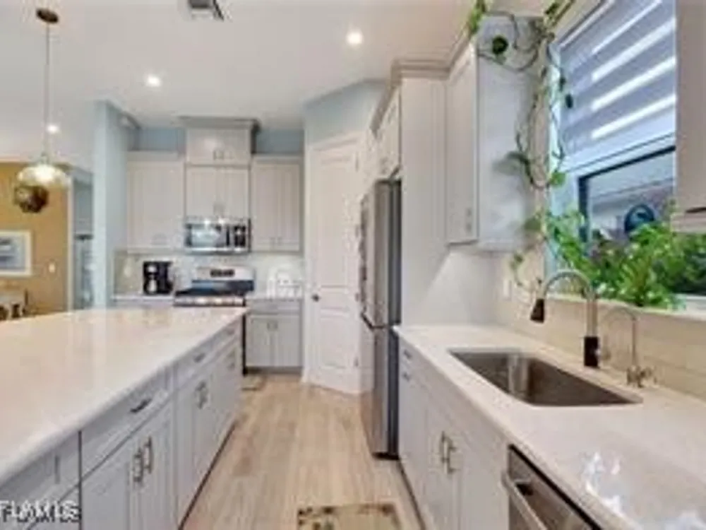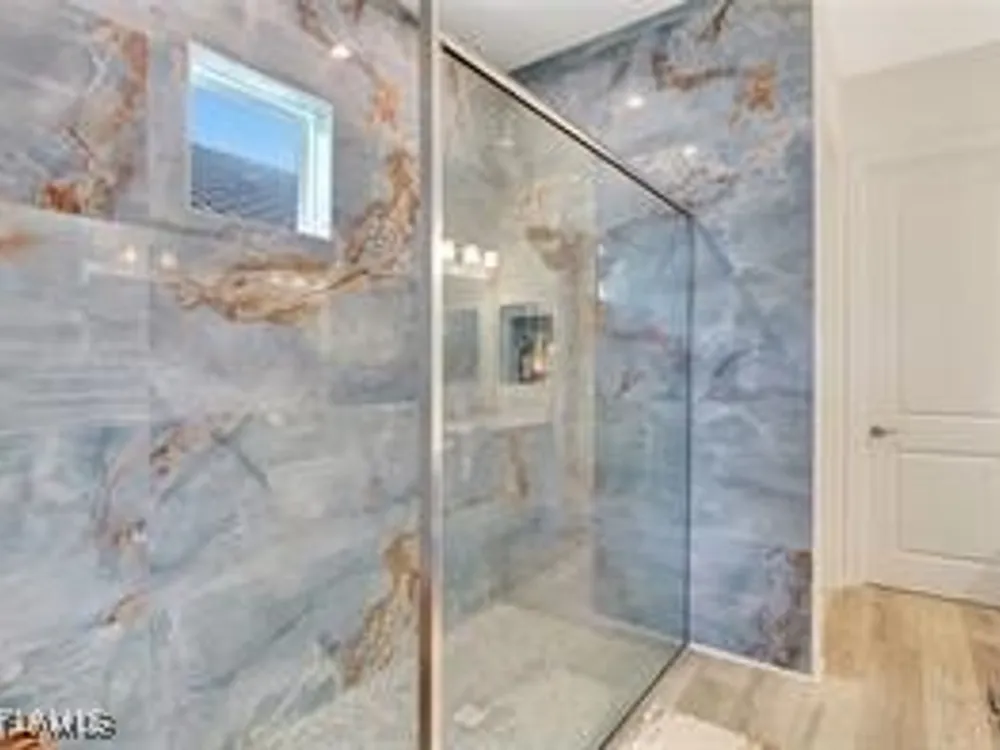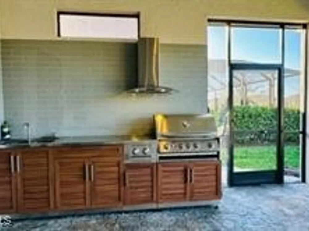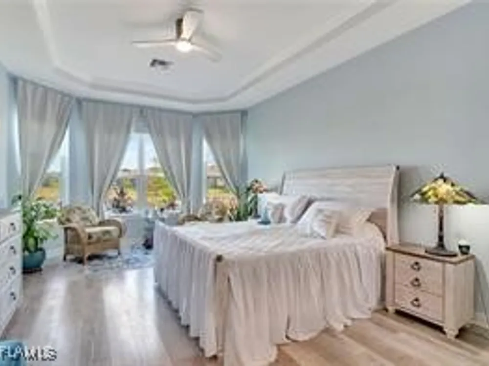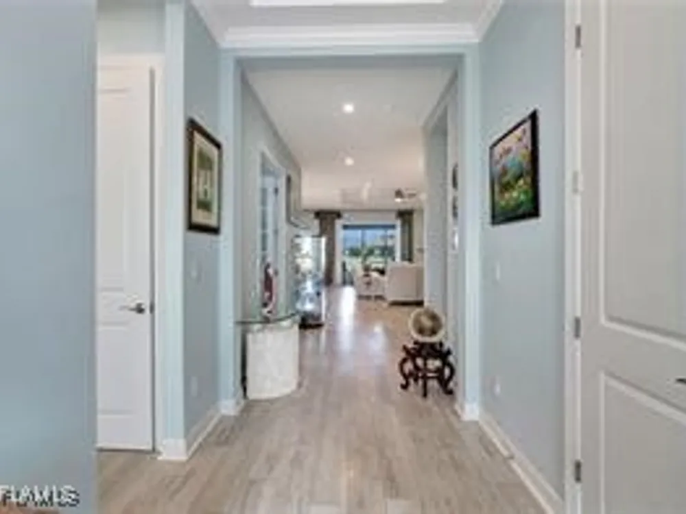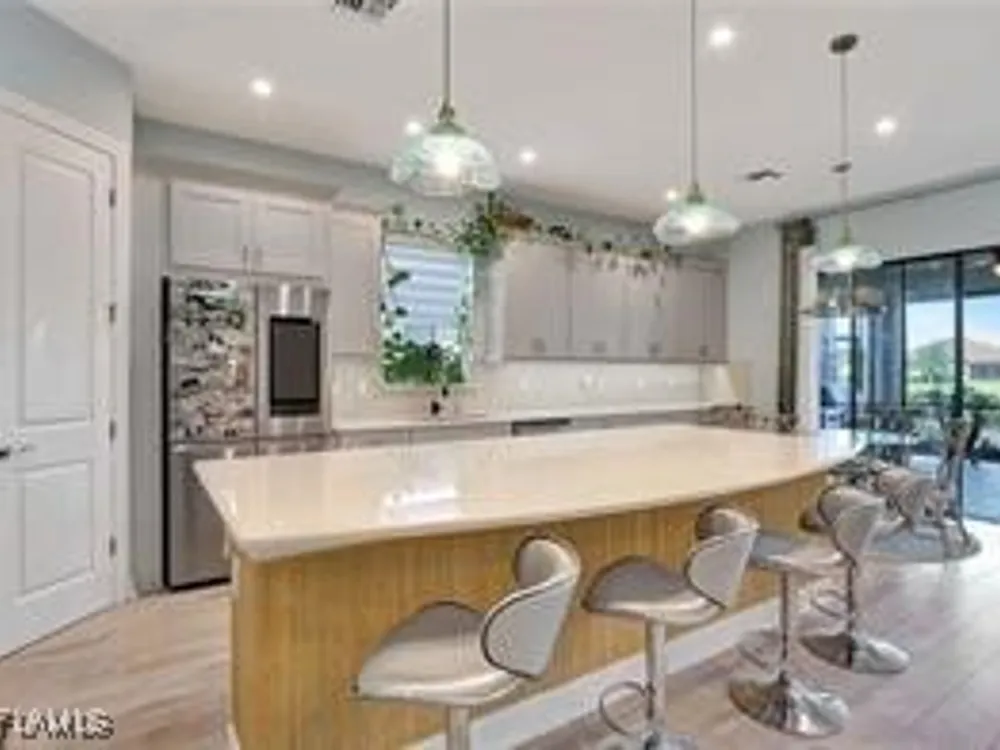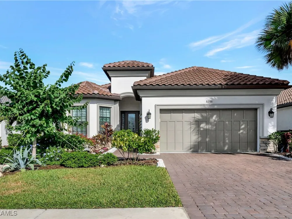 Discover an exquisite lakefront retreat, completed in December 2021, surrounded by beautiful landscaped front and rear grounds. This 2,373 sq. ft. single-family home embodies the coveted Lazio open-floor plan, featuring 3 expansive bedrooms, 3 full bathrooms, a versatile den, and a delightful covered lanai. Encompassing 2,884 sq. ft., the property includes a lanai and patio enhanced by a built-in outdoor kitchen (gas). Notable features include premium lanai storm/hurricane protection screens, rich hardwood flooring throughout, elegant bay windows in the master and guest bedrooms, a substantial walk-in closet, refined tray ceilings, and stylish recessed lighting. Nestled in a secure, gated, resort-style community, residents enjoy an impressive suite of amenities: a cutting-edge fitness center, welcoming community room, ping pong and pool tables, dedicated game and yoga rooms, a serene spa, a heated pool, a resistance lap pool, a charming poolside cabana, lounge chairs, umbrella tables, and abundant seating. Outdoor offerings shine with a warm fire pit, tennis courts, illuminated pickleball courts, bocce ball courts, a dog park, and a playground. Perfectly positioned near shopping, dining, medical facilities, entertainment, and pristine beaches. Only 2 miles from Publix grocery, 3 miles from a 24-hour Medical Center, and 1 mile from Gallery Hacienda Lakes—a premier full-service senior assisted living and memory care center. Explore nearby treasures such as the Naples Zoo and Botanical Gardens, Rookery Bay, and NGALA Wildlife Preserve.
