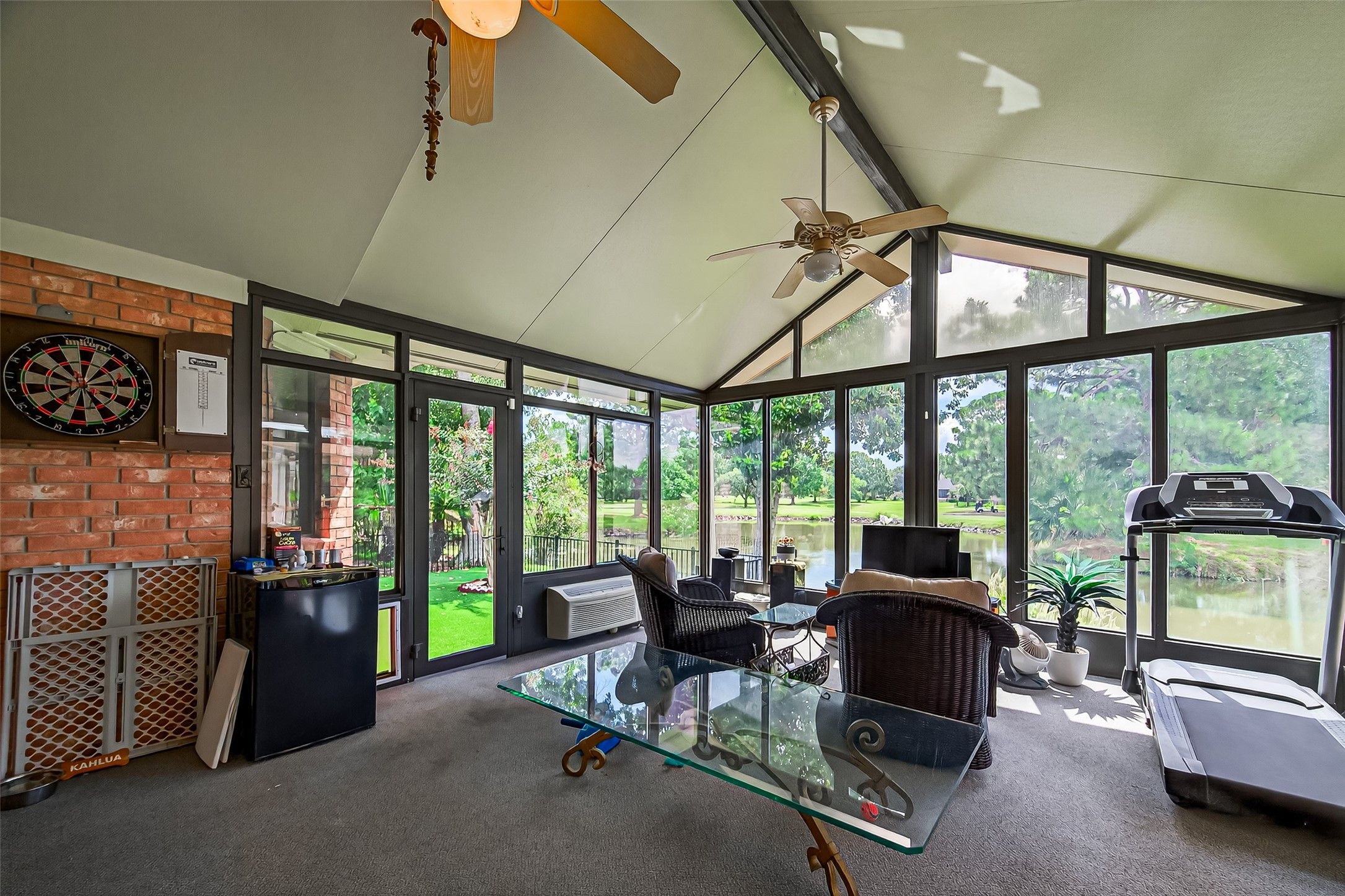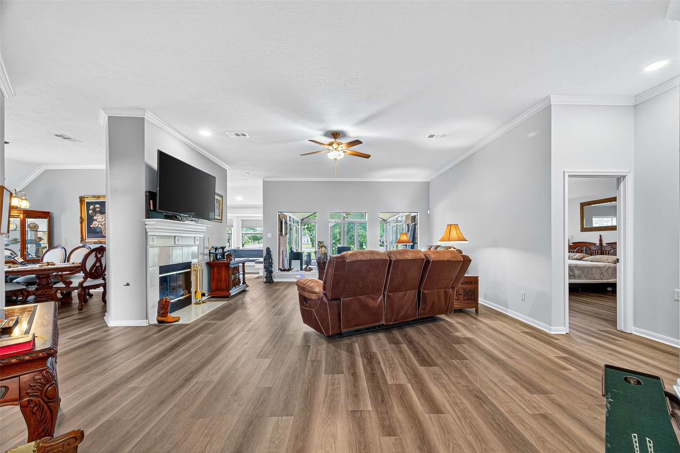 Wonderful home in one of the best 55+ communities! This fantastic property offers views of the Pearland golf course from your glassed in sunroom, pond and wildlife sightings included! For outdoor living there is a spacious wood deck with seating and roll out awning. Features inside the house include luxury vinyl flooring throughout, built in bench seating in the breakfast nook, gas log fireplace in living area, formal dining room, office with additional storage, full house Kohler generator, solar panels, sunroom has impact resistant windows and AC/heat, jetted garden tub in primary bath, oversize garage with attic access that has flooring for storage and so much more! Countryplace amenities include the Carriage House offering fitness room, billiard room, library, social hall for events, huge swimming pool/hot tub and sports courts. Close to shopping, restaurants and medical facilites. Come make this your new home!