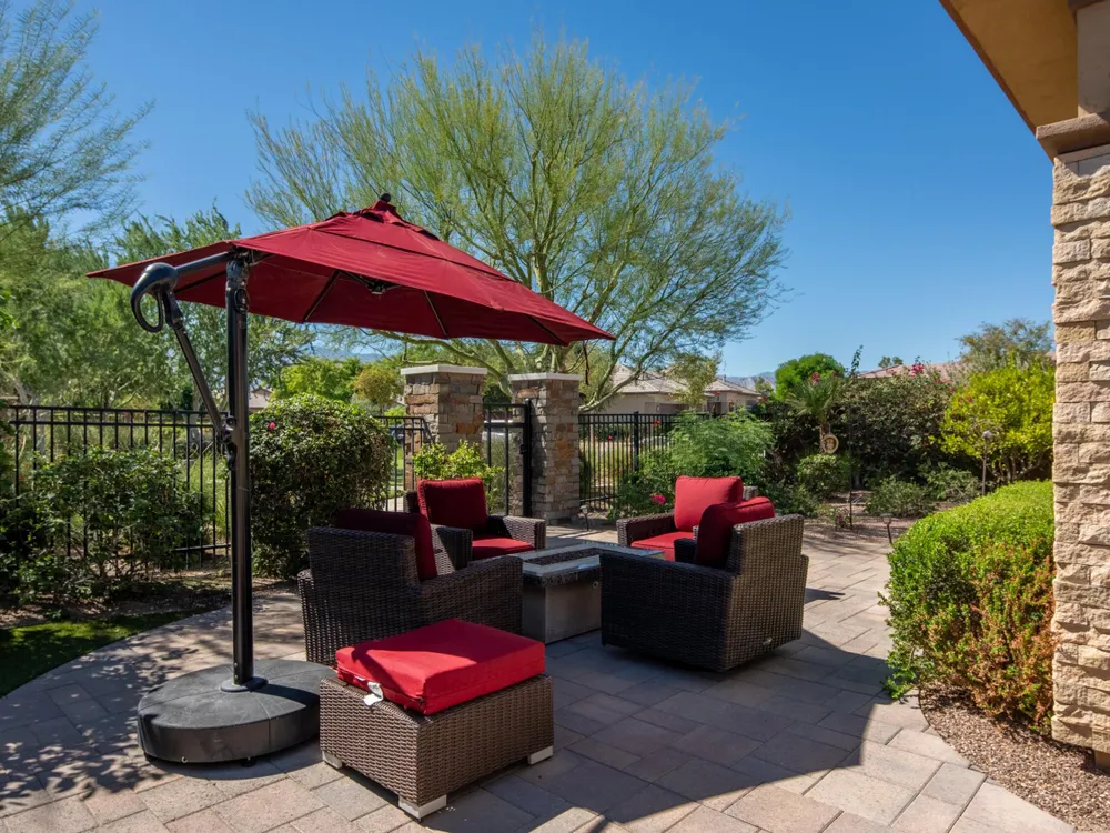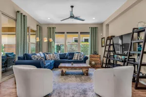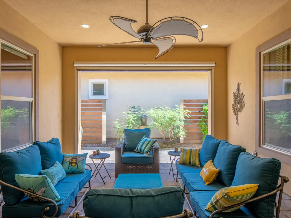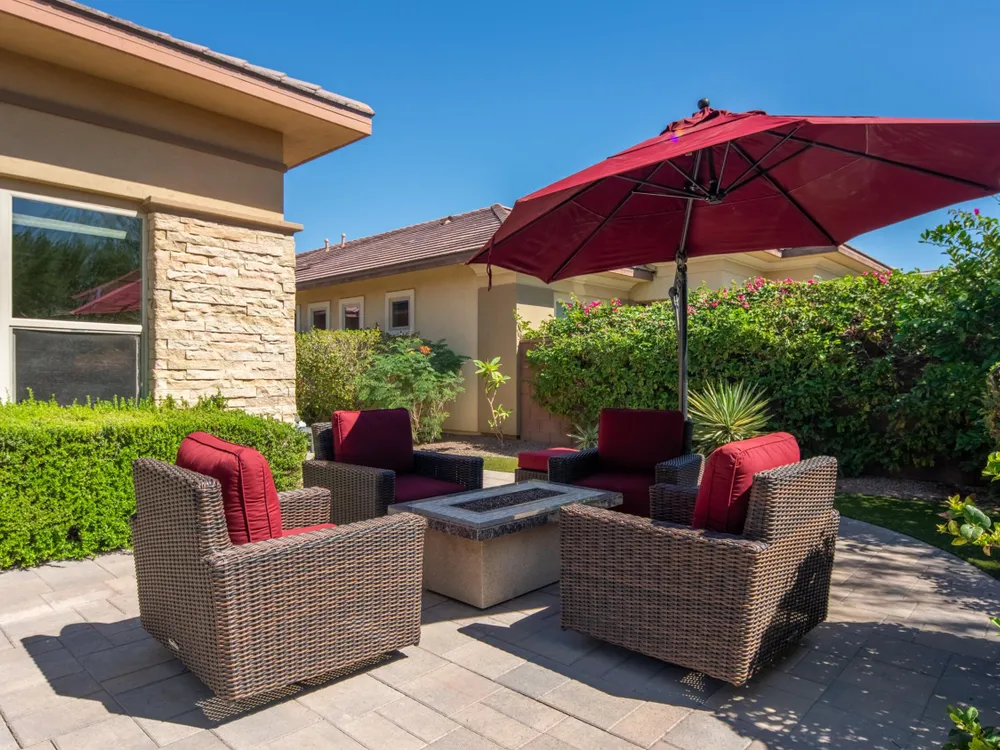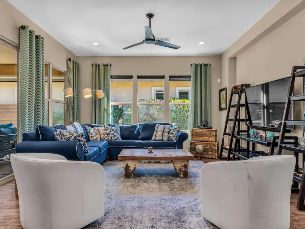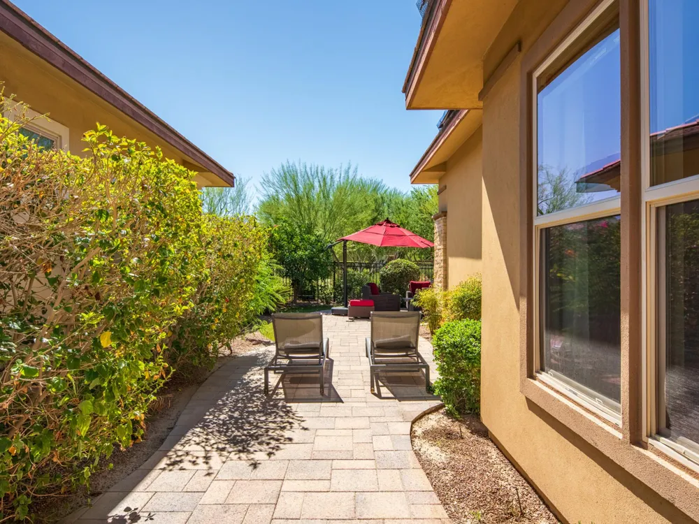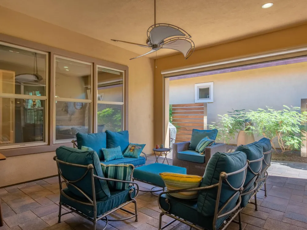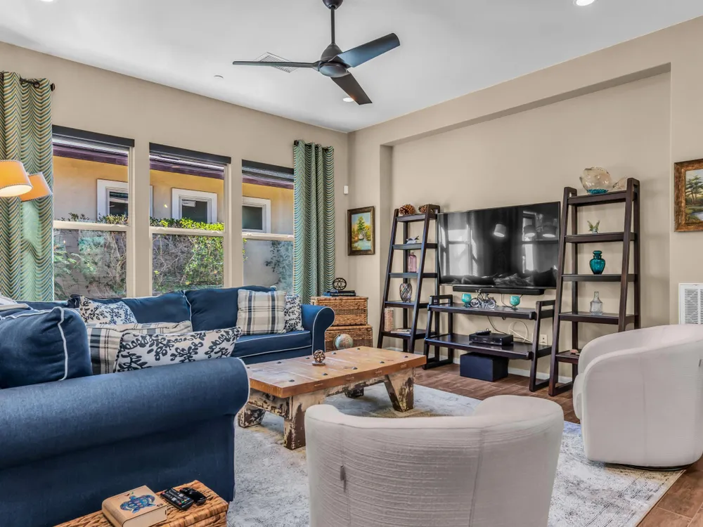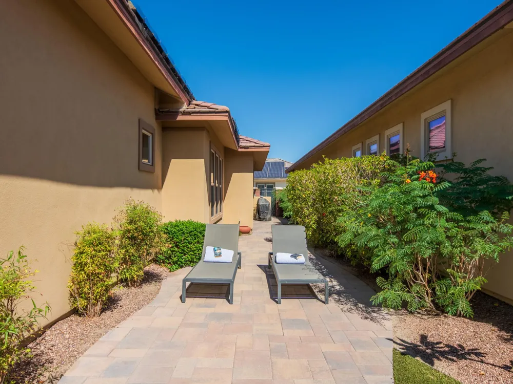Welcome to your fully furnished desert getaway in the sought after All Ages section of Trilogy Polo Club where resort living meets everyday convenience. This beautifully maintained 2 bedroom plus den, 2 bath home sits on a desirable corner lot with lush greenspace right out front, offering privacy and serene views the moment you arrive. Enter inside to a bright and open great room concept, perfect for entertaining or relaxing in style. The modern chef's kitchen features a spacious breakfast bar, sleek finishes, and seamless flow to the living and dining areas. A rolling wall (glass pocket sliding doors) leads from kitchen to the private covered patio where you can relax in all seasons with the electric roll-down drop shade. Whether you're working remotely or hosting guests, the flexible den/workspace offers the versatility you need — ideal for a home office, media room, or guest overflow. A prepaid solar lease means affordable utility costs. The attached 2 car garage has a mini split for cooling, epoxy flooring - could be the perfect work-out area or hobby/DIY space. The laundry room is spacious and features a built-in workspace. Offered turnkey furnished, this home is ready for immediate enjoyment — just bring your suitcase! Enjoy ALL benefits of the Trilogy Clubhouse by purchasing the optional Club Membership Transfer at $1,875 and $210/mo dues - for a lifestyle including: resort-style amenities, pools, fitness, tennis, pickleball, dining, and a vibrant social calendar — all just minutes from the Empire Polo Grounds, La Quinta shopping, and world-class golf. Lock and leave home perfect for Second Home or Vacation Buyers, resort style living without the age restrictions, upsize or downsize with ease as this home is already perfectly furnished. Don't miss your chance to own in one of the desert's most flexible and stylish resort communities. This home checks all the boxes — location, lifestyle, and livability.