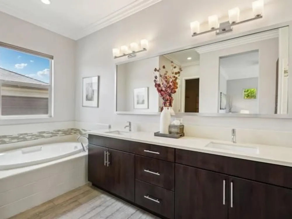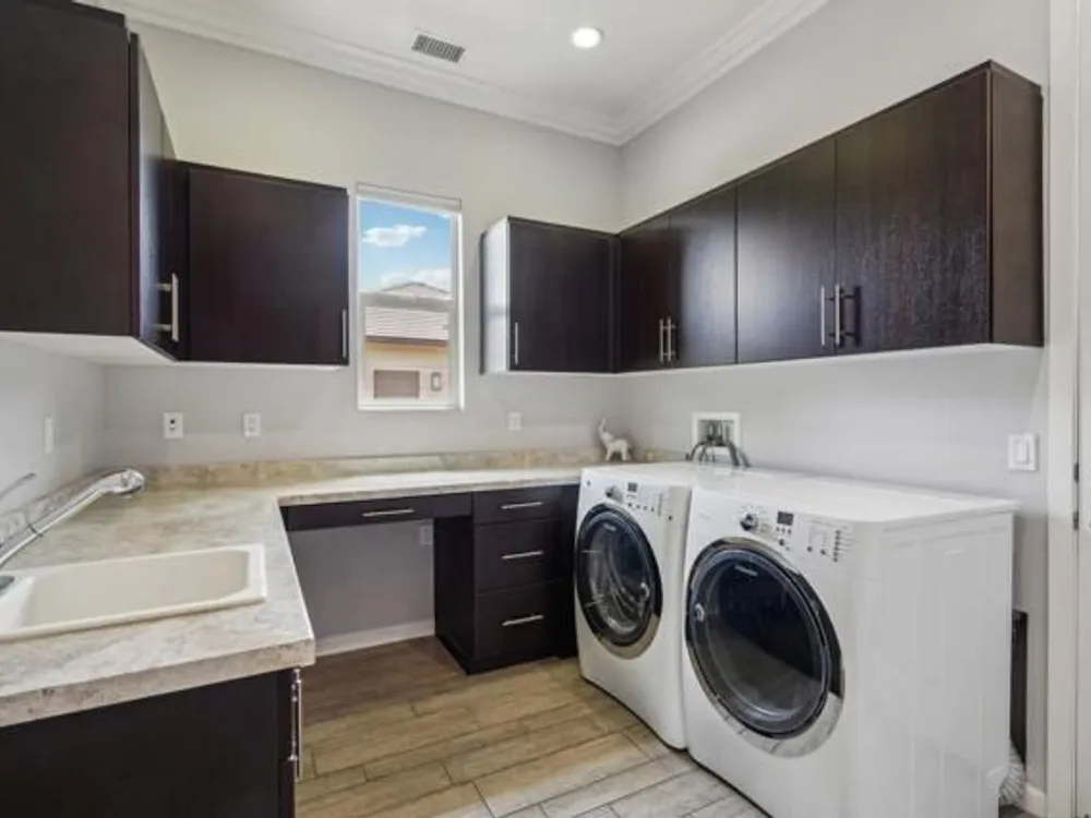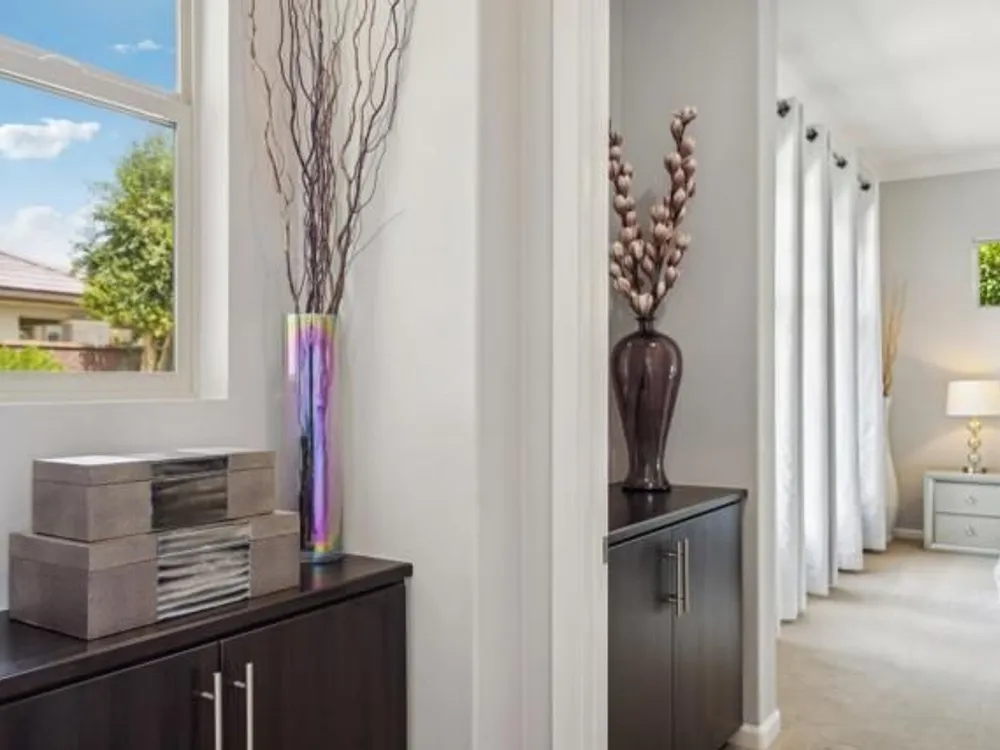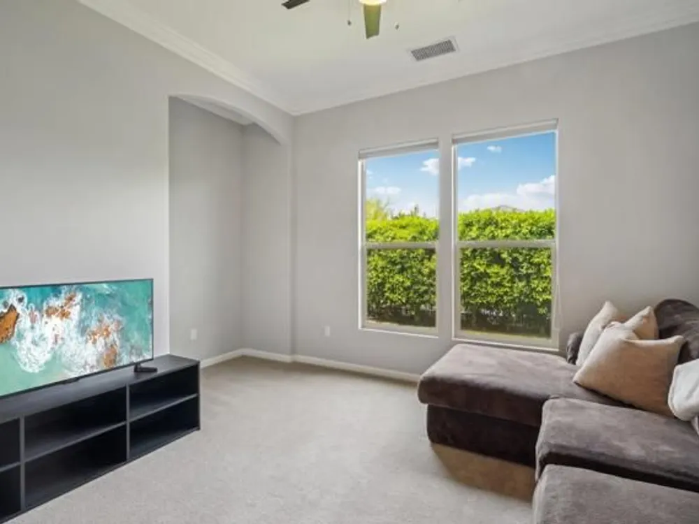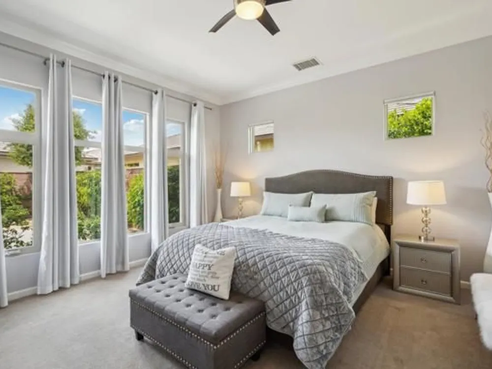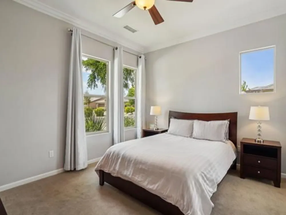 Step into refined desert living at its finest with this impeccably maintained single-family gem, nestled behind the manned-gated entrance of Trilogy Polo Club; in the All-Ages section--one of the Coachella Valley's premier resort communities. Offering 2,245 sq ft of stylishly appointed living space, this 2 bed, 2.5 bath home includes a versatile SMART room with laundry, built-in workspace, and generous cabinetry. Through a custom etched-glass door, you're welcomed into an open-concept great room showcasing designer plank flooring, crown molding, recessed lighting, and a chic TV/media niche. The adjacent flex space easily transforms into a den, office, or 3rd bedroom. Entertain with ease in the Chef's kitchen, complete with stainless steel appliances, quartz countertops, espresso cabinetry, subway tile backsplash, built-in ovens, a 6-burner gas cooktop with dramatic hood, and an oversized island with bar seating. Retreat to your sun-drenched primary suite with a spa-worthy bath featuring a soaking tub, dual quartz vanities, oversized tiled shower, and a large walk-in closet. Your guests will love the private accommodations, while the serene backyard--framed by professional landscaping, paver patios, and covered lounging areas with pocket sliders--offers the ultimate indoor-outdoor lifestyle. Just steps from world-class amenities at the clubhouse, this desert dream home is ready to impress. Schedule your private showing today!