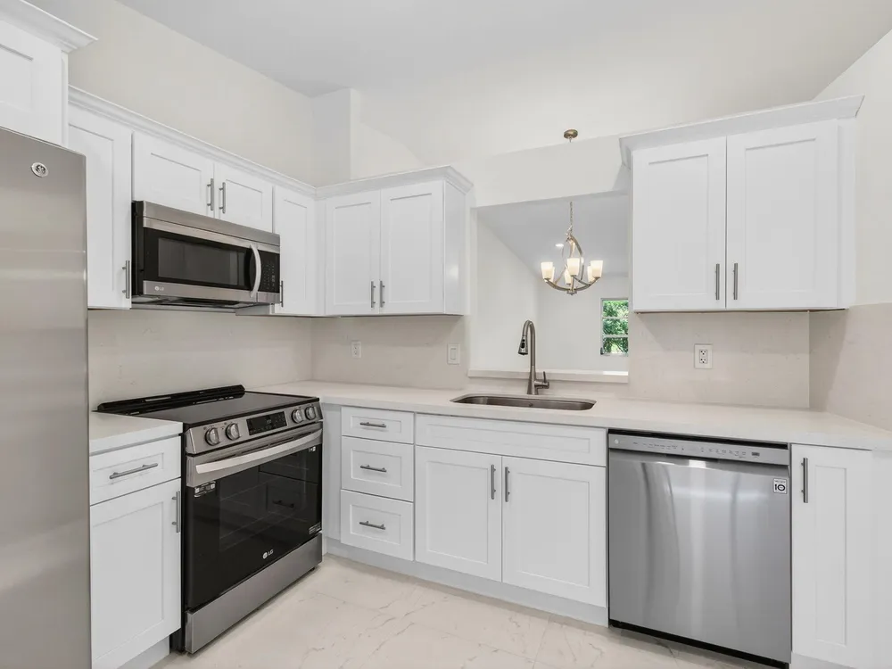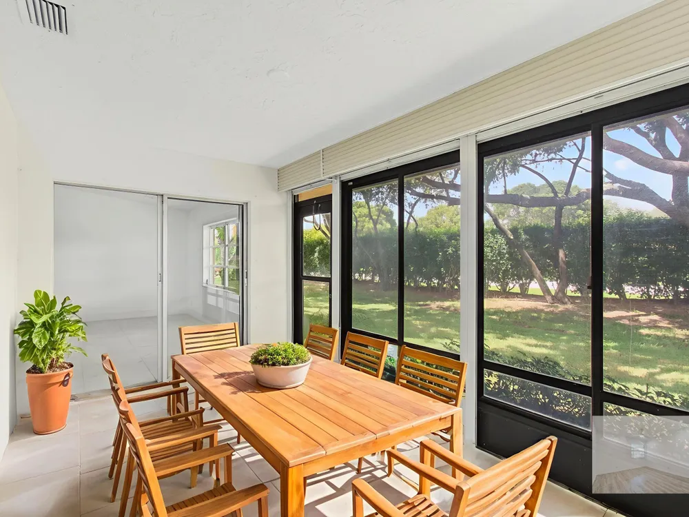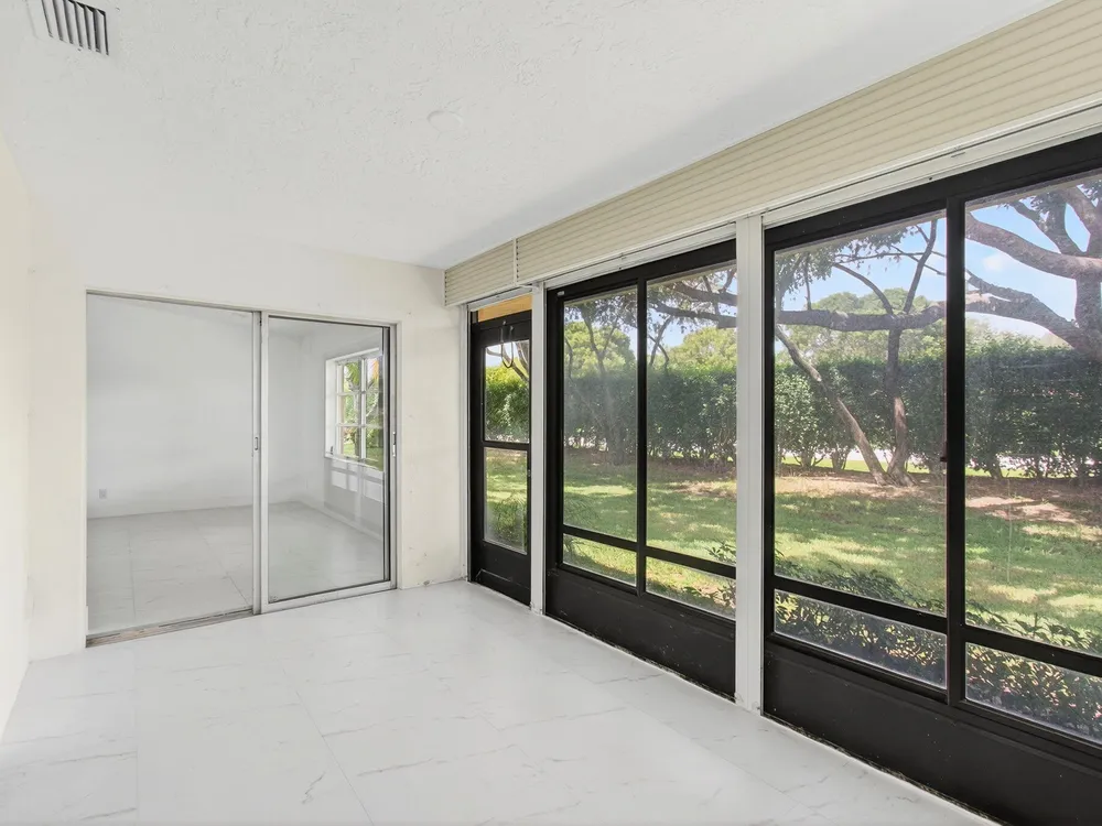 Magnificent, all redone, 2 BR/2 BA villa, from roof to marbleized tile flooring and everything in-between.Gourmet kitchen, new LG appliances, quartz countertops, breakfast nook area, and plenty of storage cabinets. Spacious dining/living room area. New bathrooms, both with walk-in showers. Vinyl laminate flooring in both bedrooms; separate area of brand new washer/dryer near kitchen. Skylight in front-enclosed patio entry. Air-conditioned Florida room faces quiet, private landscaped view for relaxation and tranquility. Clean, large, 1-car garage with room for storage, along with two private parking spaces.New roof (2024), New A/C (2023), Exterior newly painted (2024).Move right in to this clean, unoccupied, renovated villa.Active 55 + community with gated entrances