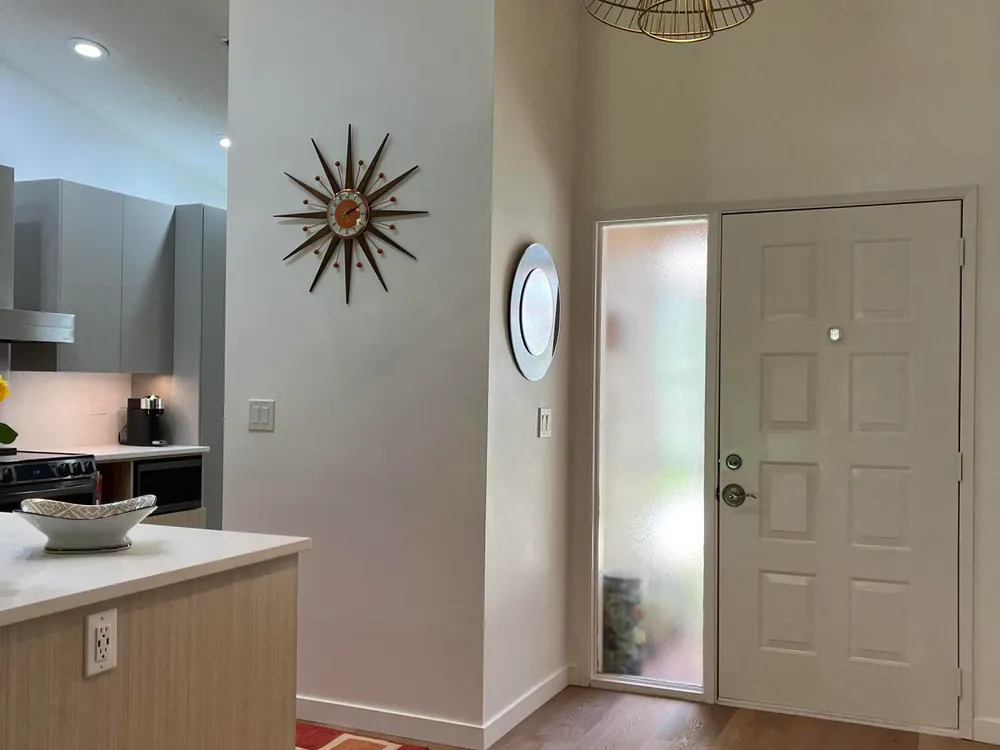 Introducing a spectacular, completely renovated Regal Townhome. This home is a masterpiece of mid-century modern design coupled with elegance and comfort, and must be experienced to appreciate the openness and quality of all the finishes. The property features commercial grade vinyl flooring, impact windows, 2 skylights, new tile, new bdrm carpeting, statement fixtures, and custom cabinets and countertops. Located in a desirable 55+ neighborhood with new pickleball courts, private club house, large pool, workout room, library and games room. Don't miss the opportunity to make this exquisite residence your own!