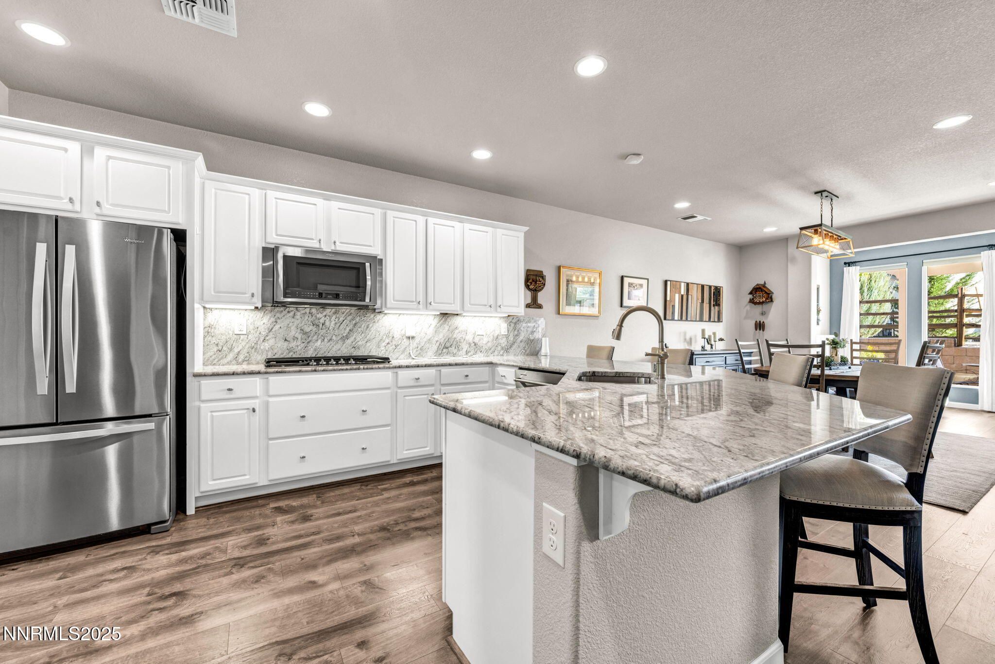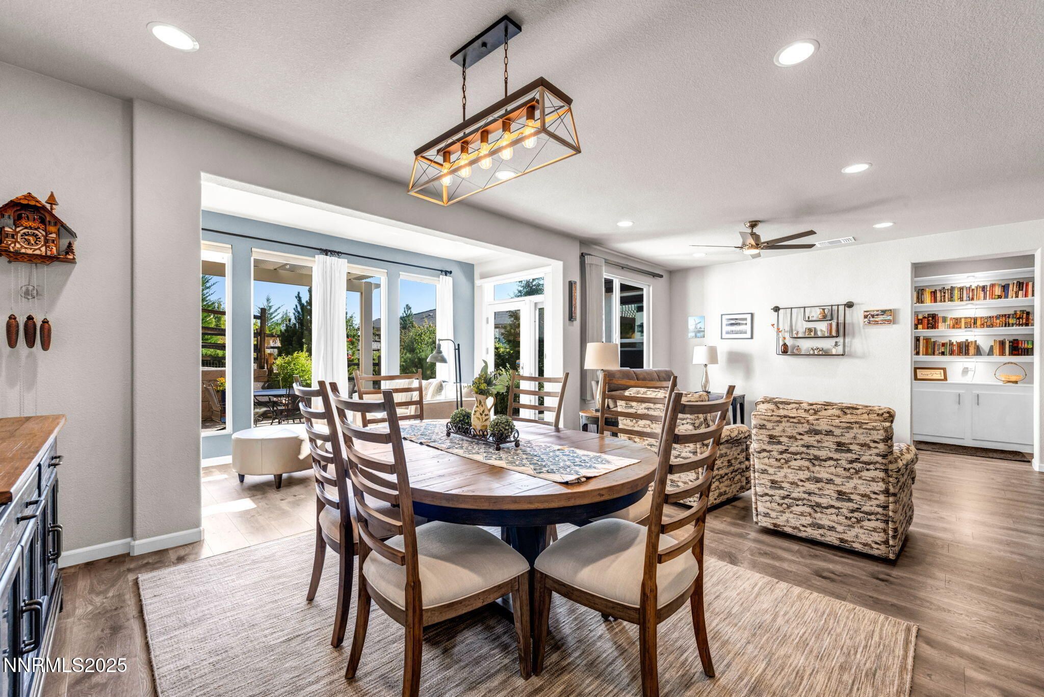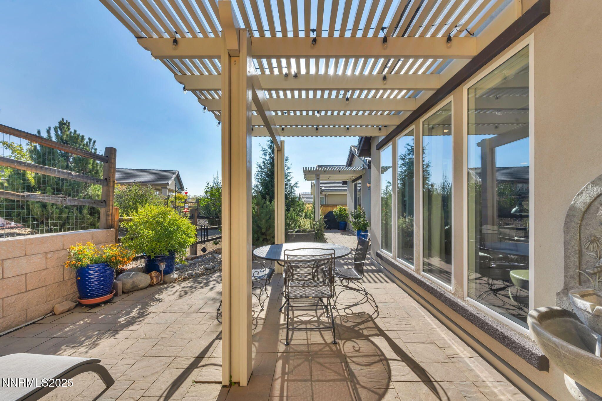 Welcome to sought out Alpine model, located in the highly desirable Del Webb 55+ community at Somersett in Northwest Reno. This thoughtfully updated 2 bedroom, 2 bath home includes a versatile office/den. It blends comfort and convenience with low-maintenance living. The kitchen features crisp white cabinets, new laminate flooring, two pantries, under-cabinet lighting, and an under-sink instant hot water system. A cozy hearth room with a gas fireplace creates the perfect space to relax, while thoughtful details like a built-in hall tree, custom bookcase, and closet organizers add both charm and function. Smart-home and energy-efficient features include a Nest thermostat, whole-house fan, Yale/Nest auto-locks, and yearly roof inspections for peace of mind. A French door with side light brightens the living space and leads to the outdoors, where you'll enjoy a welcoming front courtyard, two backyard awnings, and easy-care xeriscape landscaping. Living in Del Webb at Somersett means more than just a home—it's a lifestyle, with access to exclusive amenities, scenic surroundings, and a vibrant, active community. This move-in ready home offers the best of modern living in one of Reno's most sought-after neighborhoods.