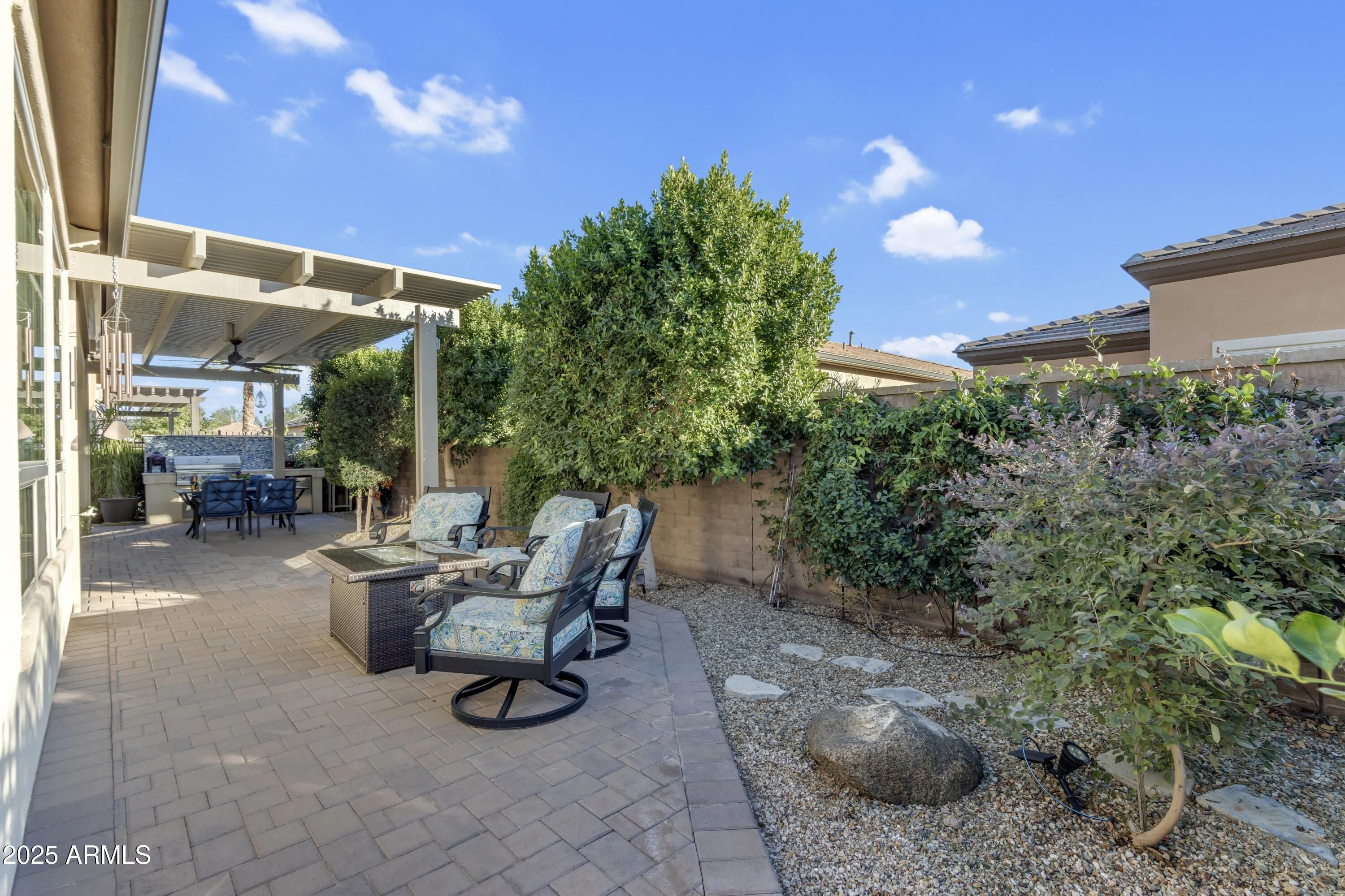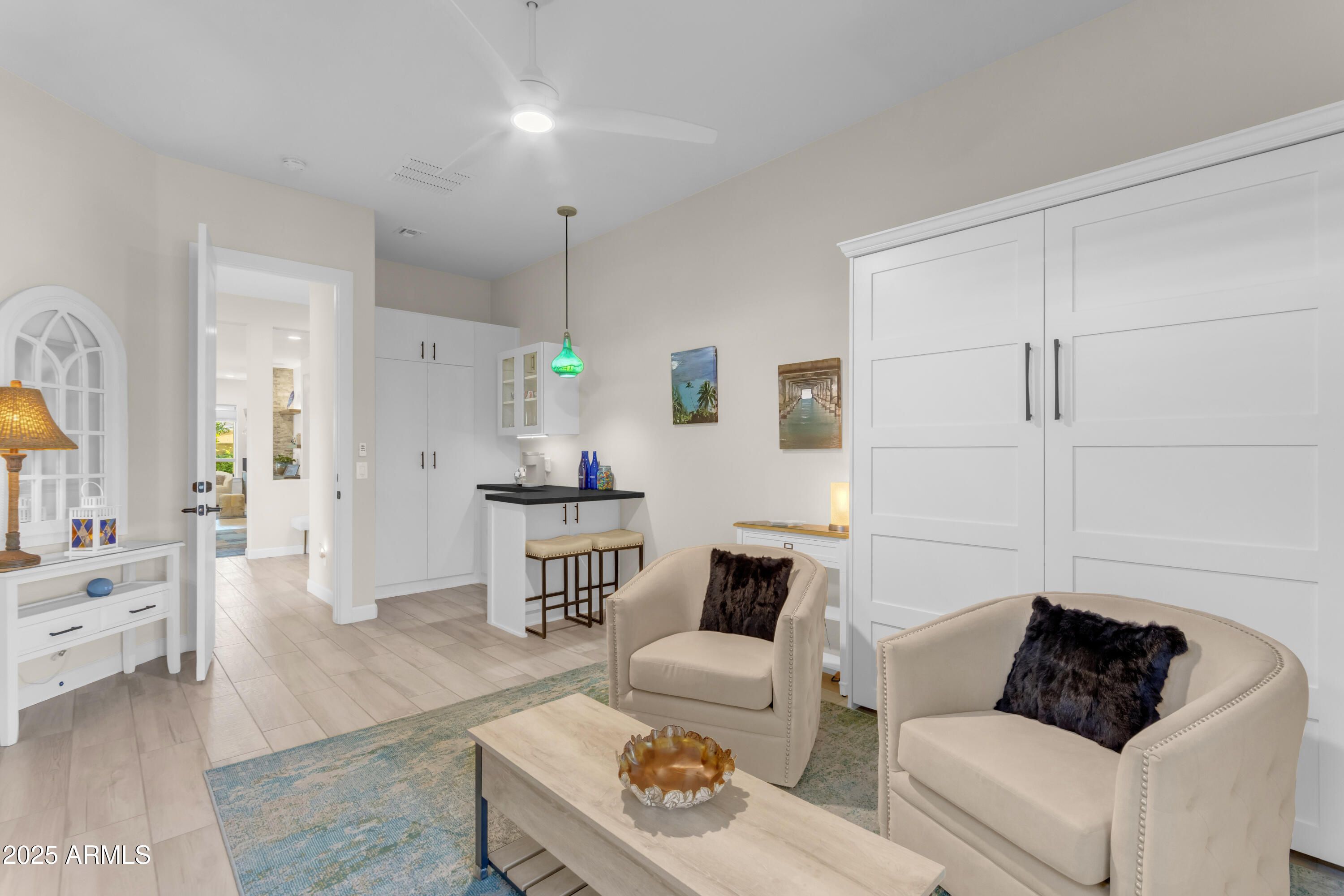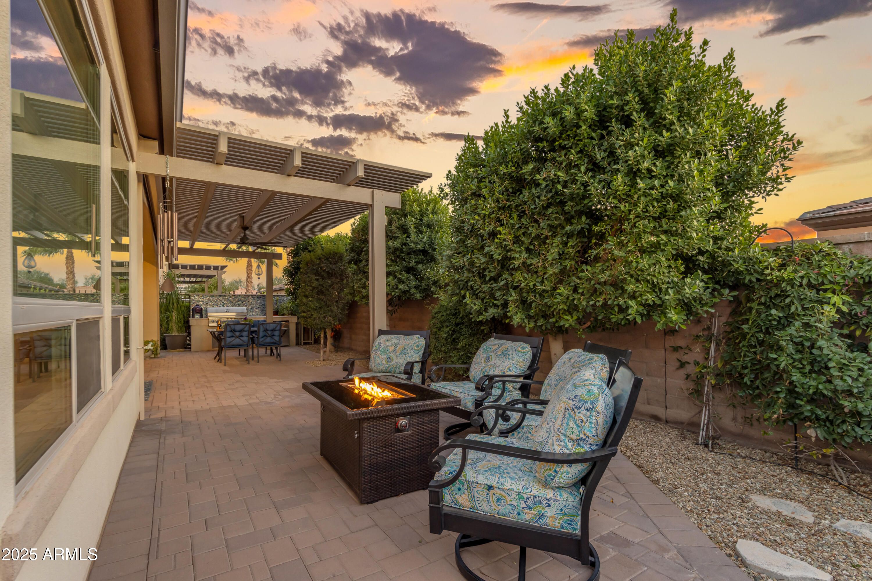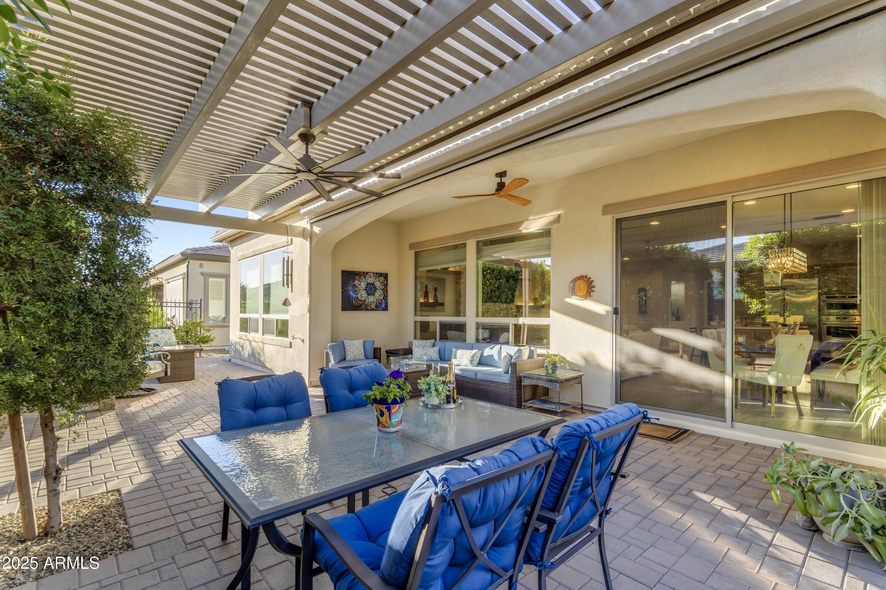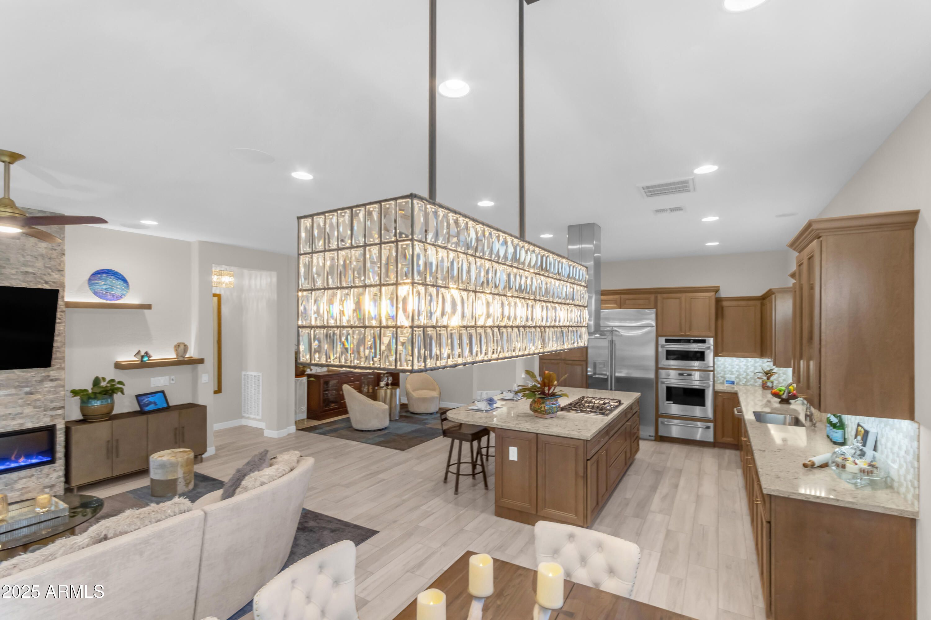 Welcome to Encanterra Golf & Country Club, where serene golf course & lake views guide you to this like-new 2020, open-concept, move-in ready home! Enjoy light & bright designer finishes, open great room w/stacked stone fireplace, floating shelves, gourmet kitchen, gas cooktop, built-in GE Monogram appliances, Alderwood cabinets & plank tile flooring. Spacious primary suite features an oversized walk-in closet, dual sinks, shower with tile to the ceiling, & decorative accents. The split floor plan includes a double door den, 2.5 baths & a two-room casita with its own private entrance-perfect for guests, multigenerational living, or a dedicated office retreat. Murphy bed included for flexibility. Step outside to paver patio w/ retractable screen, side screen door enclosure, pergola, BBQ. Additional highlights include: Custom tiled wall and mirror in powder room, custom chandeliers, shutters & blinds, built-in Denen audio system in ceiling speakers, paver walkways on both sides of home, water softener, reverse osmosis system, casita cabinetry, garage built-in cabinets, Alexa automated lighting devices throughout, under kitchen cabinet lighting, the list goes on. This home is perfectly located within the community just steps from the Algarve Clubhouse where you can enjoy swimming, dining, live music, dancing, the list is endless. The community is well-known for the award-winning, private Tom Lehman designed Golf Course. It has every amenity imaginable: pickleball, tennis, bocce, state of the art health & fitness center, Alvea Spa, just to name a few. The list of community activities is never-ending: concerts, classes, social clubs, car shows, events and much more. Eateries include: La Palma (the signature restaurant, in a beautiful atmosphere with panoramic views), Bodega Wine and Café (for small plates and wine tasting), and the Solaz and Algarve pool Grills. There are four pools to enjoy. The Solaz pool sits adjacent to the golf course with stunning views. The Algarve, the adult-only pool, is perfect for a little added relaxation. Join the Fun and the Good Life in the gated community of Encanterra!