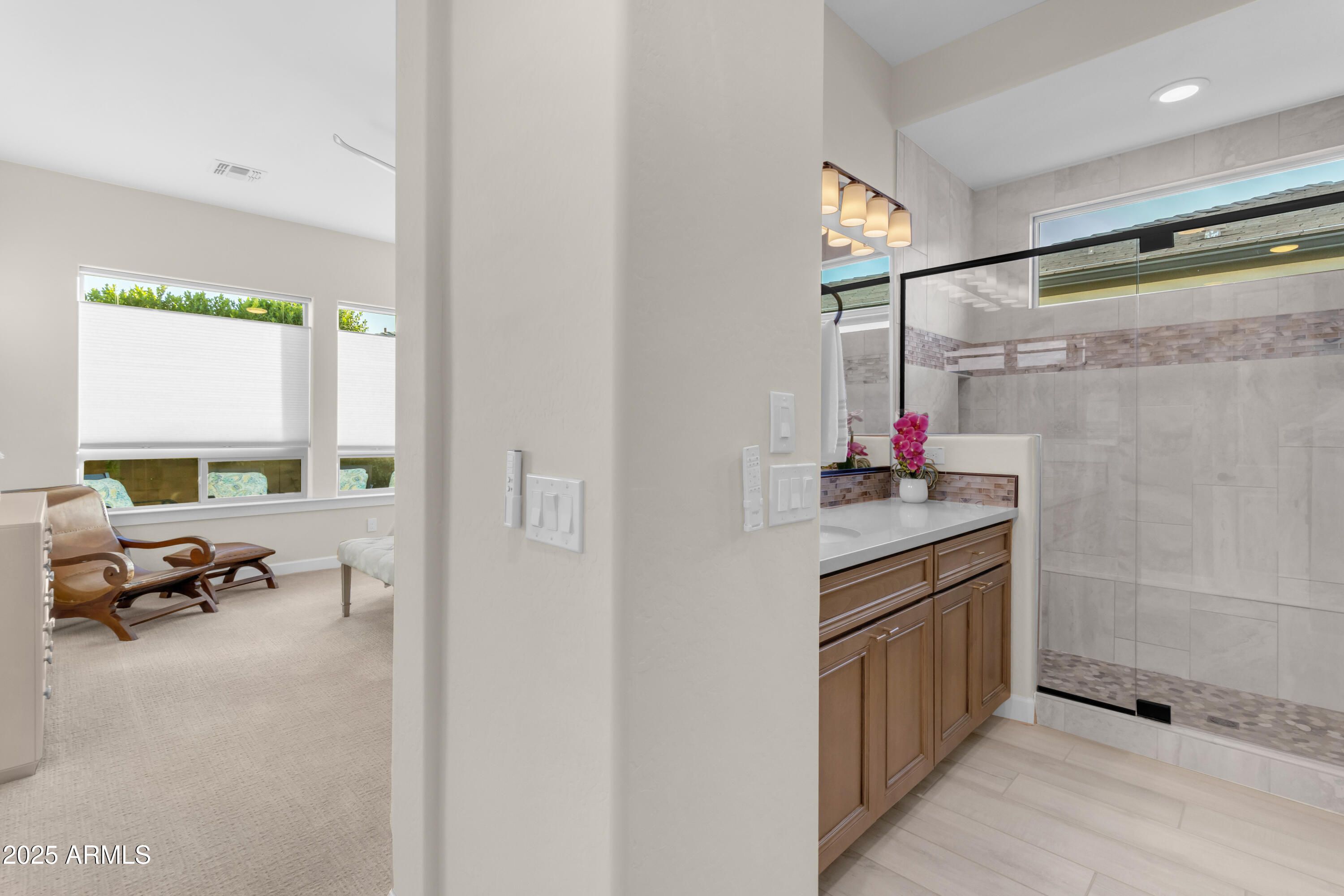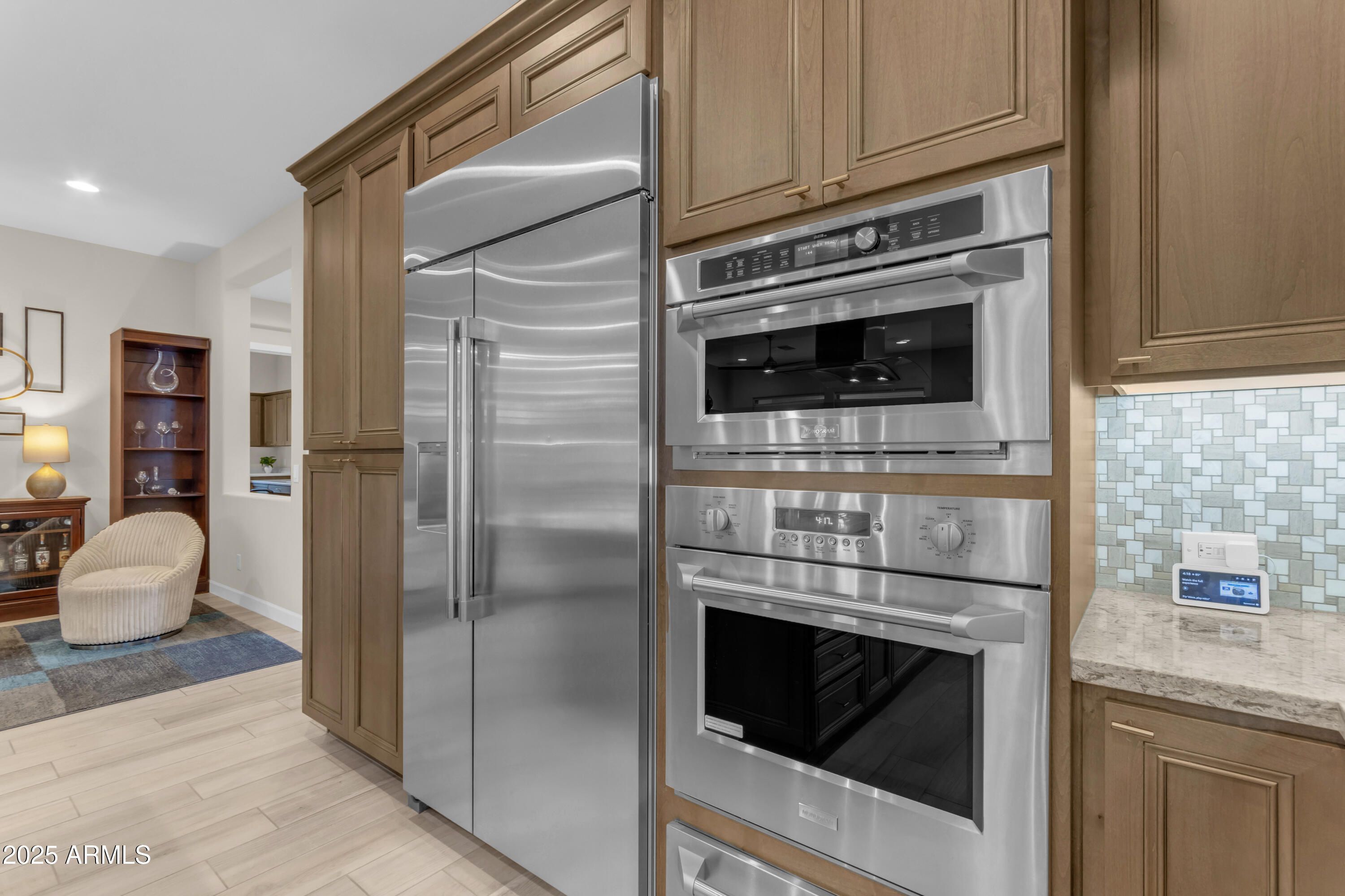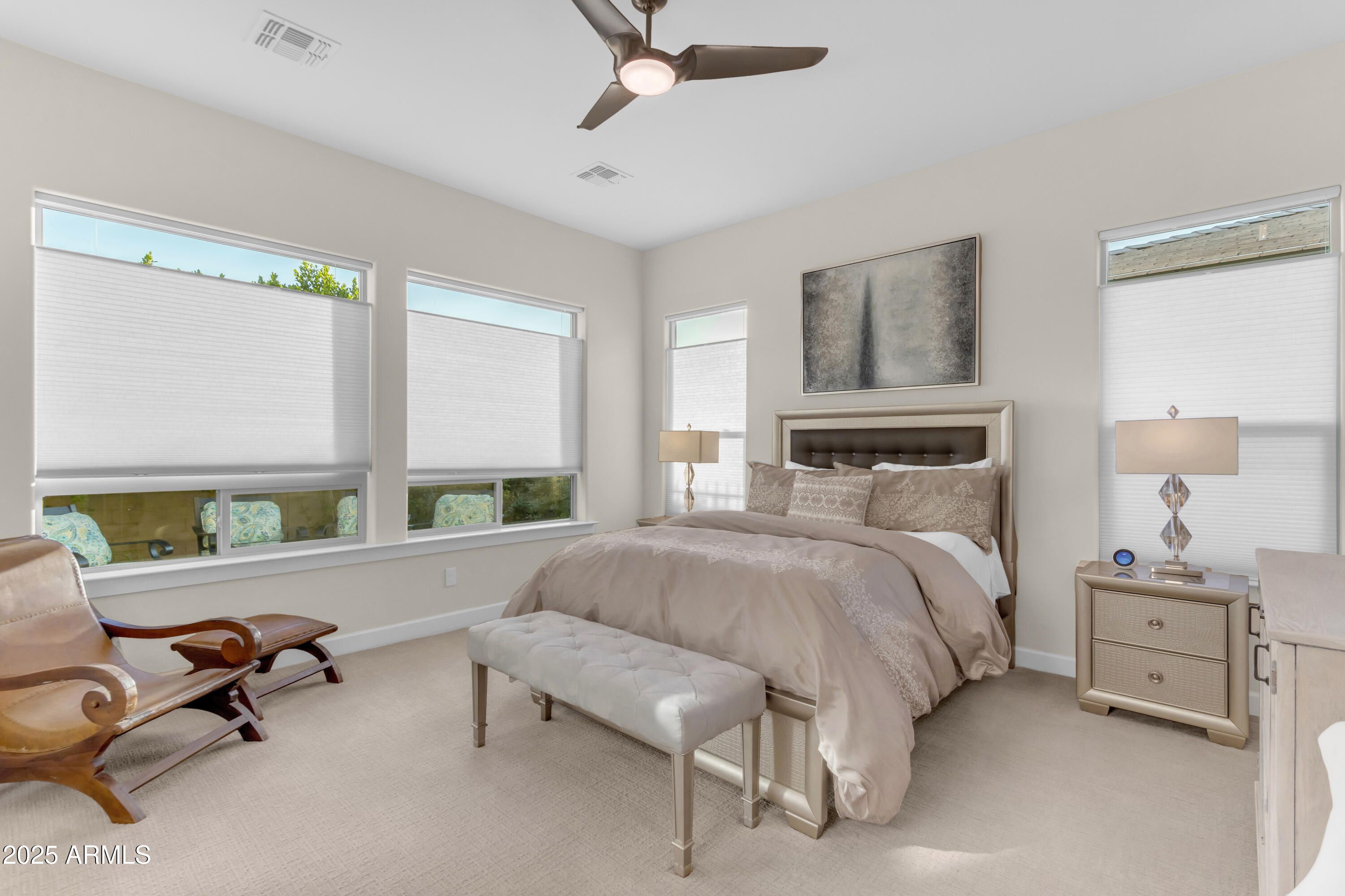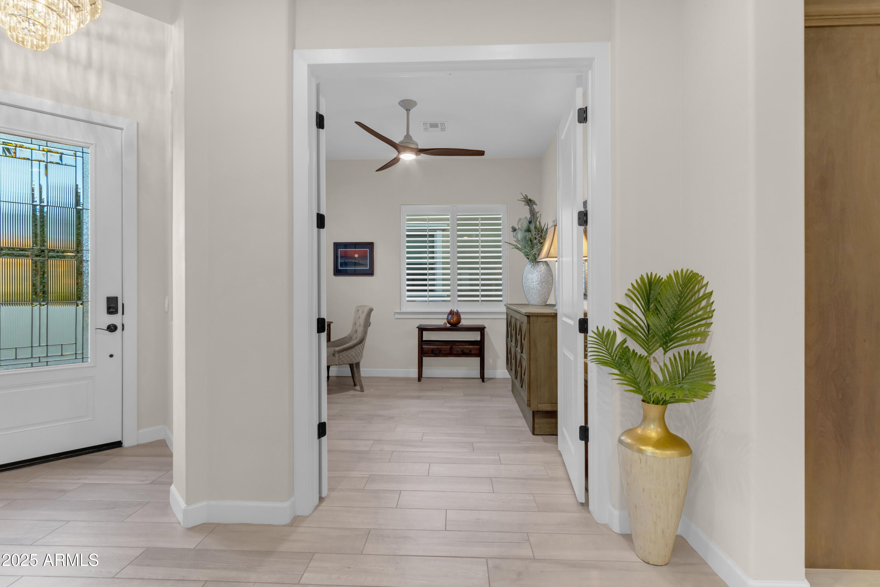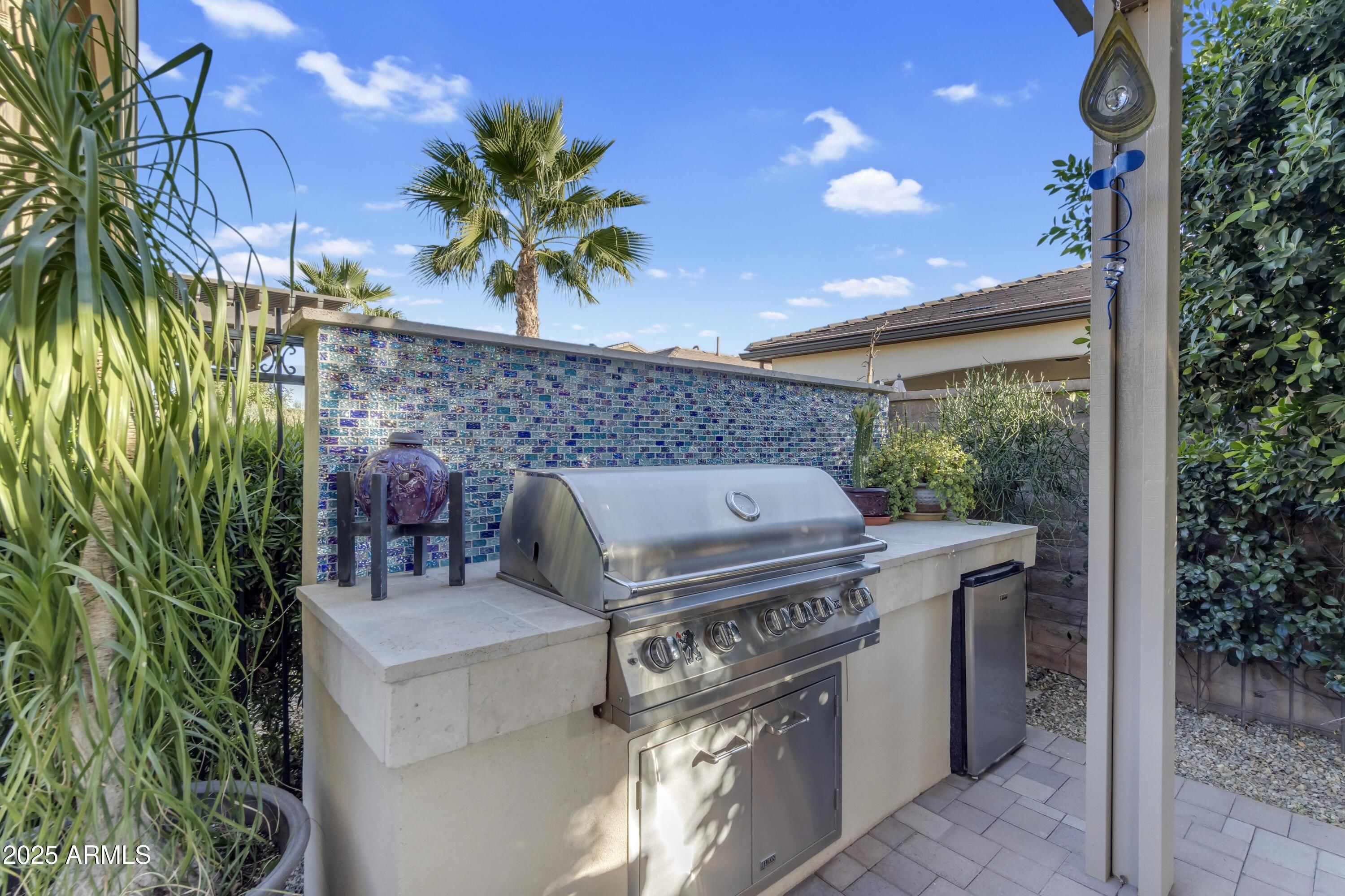 Welcome to Encanterra Golf & Country Club, where serene golf course & lake views guide you to this like-new 2020, open-concept, move-in ready home! Enjoy light & bright designer finishes, open great room w/stacked stone fireplace, floating shelves, gourmet kitchen, gas cooktop, built-in GE Monogram appliances, Alderwood cabinets & plank tile flooring. Spacious primary suite features an oversized walk-in closet, dual sinks, shower with tile to the ceiling, & decorative accents. The split floor plan includes a double door den, 2.5 baths & a two-room casita with its own private entrance-perfect for guests, multigenerational living, or a dedicated office retreat. Murphy bed included for flexibility. Step outside to paver patio w/ retractable screen, side screen door enclosure, pergola, BBQ. Additional highlights include: Custom tiled wall and mirror in powder room, custom chandeliers, shutters & blinds, built-in Denen audio system in ceiling speakers, paver walkways on both sides of home, water softener, reverse osmosis system, casita cabinetry, garage built-in cabinets, Alexa automated lighting devices throughout, under kitchen cabinet lighting, the list goes on. This home is perfectly located within the community just steps from the Algarve Clubhouse where you can enjoy swimming, dining, live music, dancing, the list is endless. The community is well-known for the award-winning, private Tom Lehman designed Golf Course. It has every amenity imaginable: pickleball, tennis, bocce, state of the art health & fitness center, Alvea Spa, just to name a few. The list of community activities is never-ending: concerts, classes, social clubs, car shows, events and much more. Eateries include: La Palma (the signature restaurant, in a beautiful atmosphere with panoramic views), Bodega Wine and Café (for small plates and wine tasting), and the Solaz and Algarve pool Grills. There are four pools to enjoy. The Solaz pool sits adjacent to the golf course with stunning views. The Algarve, the adult-only pool, is perfect for a little added relaxation. Join the Fun and the Good Life in the gated community of Encanterra!