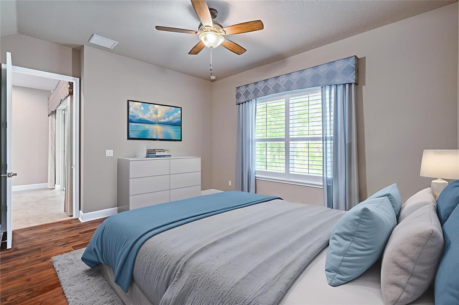 - Ceiling Fan(s), High Ceilings, Living/Dining Room, Open Floorplan, Main Level Primary, Solid Surface Counters, Split Bedrooms, Stone Counters, Tray Ceiling(s), Walk-In Closet(s), Window Treatments