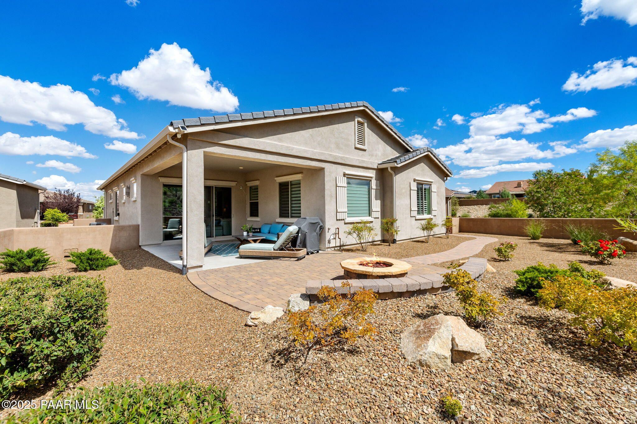 Beautiful 2 Bed + Den, 2 Bath home in the prestigious Prescott Lakes community. Enjoy Granite Mountain views from your professionally designed, low-maintenance backyard with hardscape pavers and a built-in firepit. The spacious interior boasts a large kitchen island with granite countertops, soft-close shaker cabinets, a wall oven, a gas range, and stainless steel appliances. Relax in the cozy living room with a stacked stone gas fireplace. Additional highlights include a spacious entry, wood-look tile flooring, a mud/laundry room with built-ins, plantation shutters, and an oversized 2-car garage. The elegant primary suite features a spa-style bathroom with dual sinks, granite counters, a walk-in shower, a soaking tub, and a walk-in closet. All grages, cabinets, and closets in the home are by California Custom Closets. Enjoy top-tier amenities at Prescott Lakes: golf, tennis, pickleball, pools, spa, sauna, and dining. Ideal for active retirees, downsizers, or those seeking a second home.