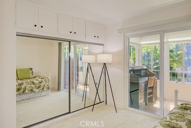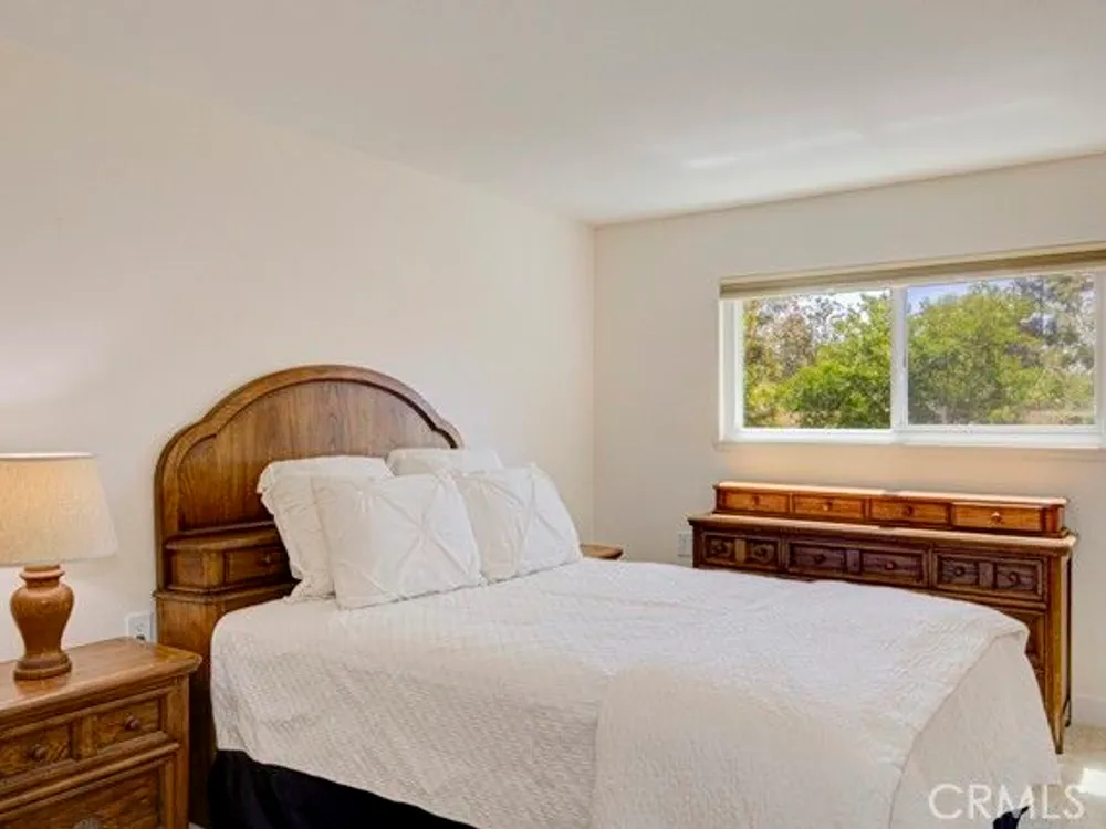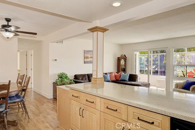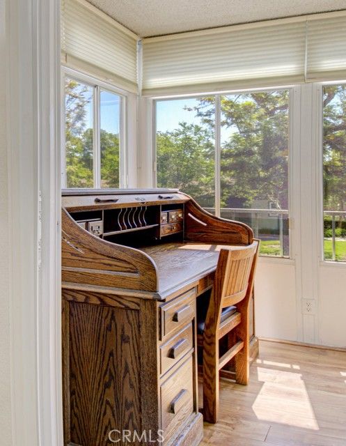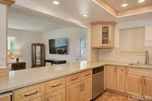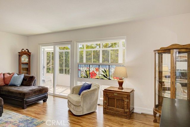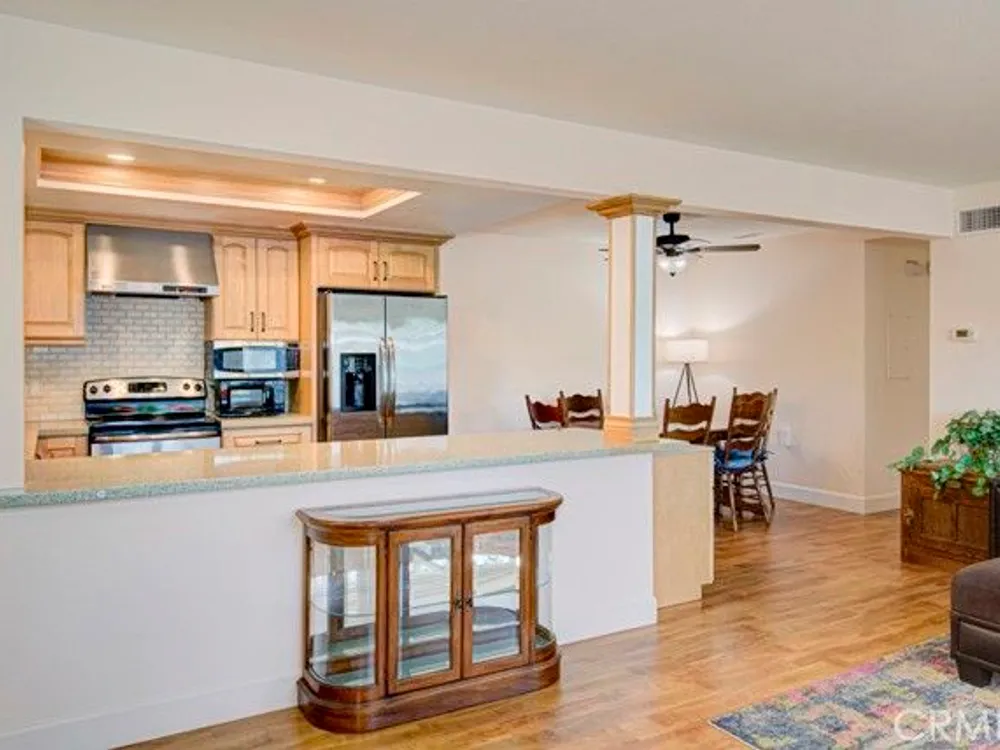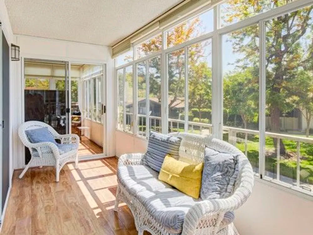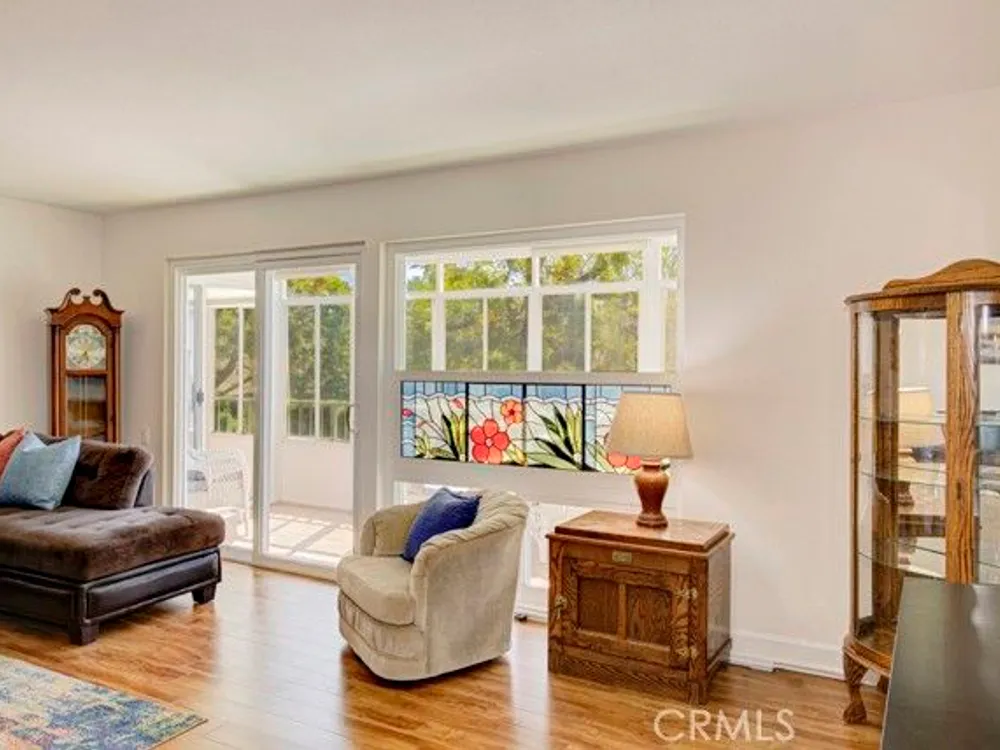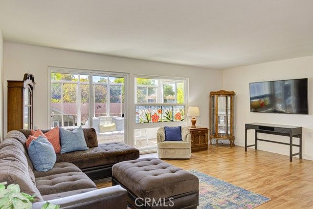 AFFORDABLE ELEGANCE is waiting for you...As you enter the leaded glass front door you are invited in by a wall of windows that give you a view to the lush, mature trees in the greenbelt below. The patio has been enclosed with dual pane windows that may be opened to enjoy the coastal breezes. The patio has been divided into a sitting area just off the living room and a nice little study/den just off the guest bedroom. The living room is spacious and features upgraded wood laminate flooring. There's a coffee bar separating the living room and kitchen...and oh what a kitchen! The custom wood cabinets are generously topped with rich quartz. Some of the upper cabinets feature glass front accents. The appliances (freestanding range, microwave, dishwasher, double door refrigerator, microwave and hood) are all stainless steel and provide the perfect accent to the subway tile backsplash. The custom cabinetry and quartz counters are carried through to the primary and guest bathrooms. There are many features that make every area of the home more accessible. The doorways are extra wide, the electrical outlets are raised and the light switches are lowered and the doorways are extra wide. The guest bathroom features a extra-large step in shower with grab bars and shower wand. The Primary Bathroom has a step in custom stall shower. The bedrooms are carpeted and both have closets galore. There's a spacious dressing area in the Primary Bedroom with a built in dresser. If you are looking for a great rental property or setting up a second home the seller will make a gift of all the furnishings (except the guest bedroom daybed and living room wall mounted TV). The linens are the property of the Listing Broker, but everything else you see is included as a gift if you wish when you buy this enchanting property. Ownership affords you the use of all the amenities that make Laguna Woods Village one of the most sought-after senior communities. Enjoy 5 swimming pools, 7 clubhouses, 3 gyms, craft studios, 2 gorgeous golf courses (27 hole & 9-hole par 3), over 250 social clubs, performing arts theater, tennis courts, equestrian trails, stable, fare free bus service, golf cart paths, manned security gates, lawn bowling, bocce ball, pickle ball & much more.
