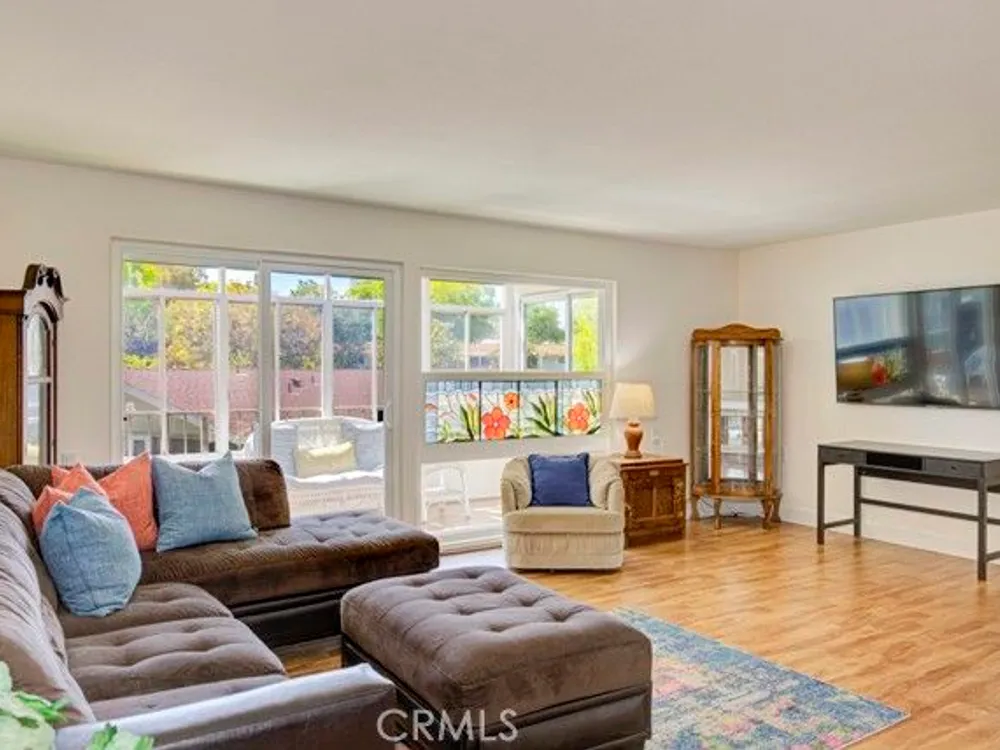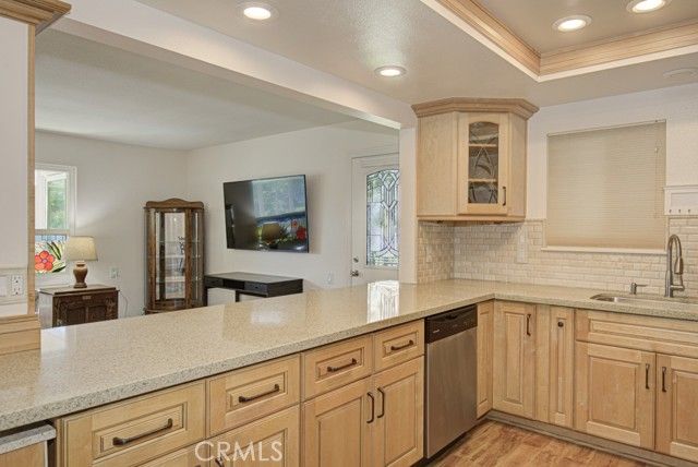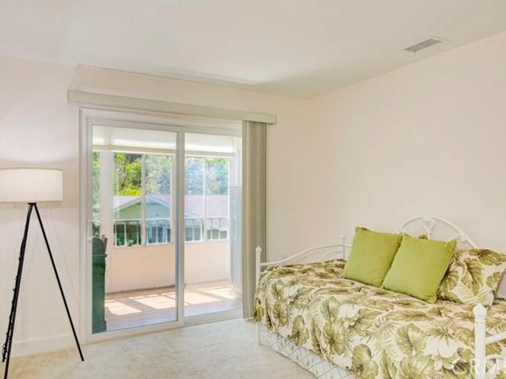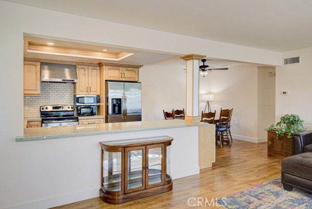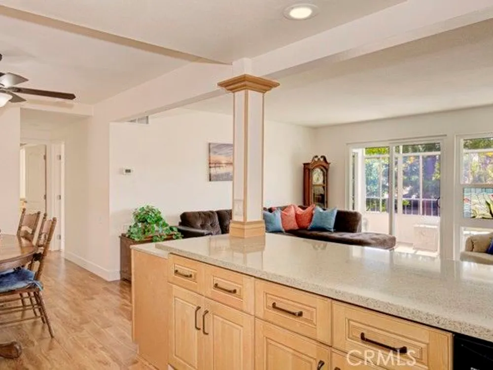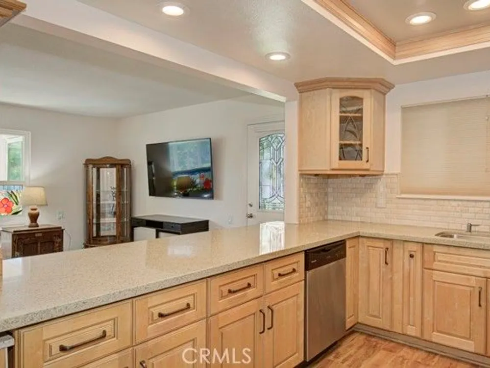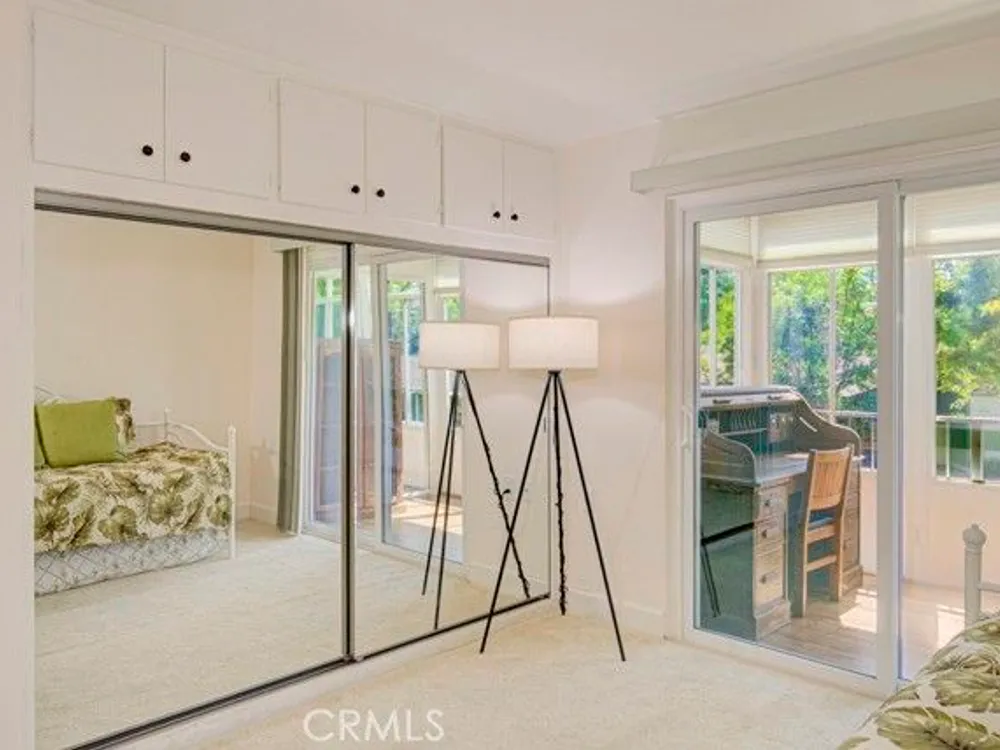 AFFORDABLE ELEGANCE is waiting for you...As you enter the leaded glass front door you are invited in by a wall of windows that give you a view to the lush, mature trees in the greenbelt below. The patio has been enclosed with dual pane windows that may be opened to enjoy the coastal breezes. The patio has been divided into a sitting area just off the living room and a nice little study/den just off the guest bedroom. The living room is spacious and features upgraded wood laminate flooring. There's a coffee bar separating the living room and kitchen...and oh what a kitchen! The custom wood cabinets are generously topped with rich quartz. Some of the upper cabinets feature glass front accents. The appliances (freestanding range, microwave, dishwasher, double door refrigerator, microwave and hood) are all stainless steel and provide the perfect accent to the subway tile backsplash. The custom cabinetry and quartz counters are carried through to the primary and guest bathrooms. There are many features that make every area of the home more accessible. The doorways are extra wide, the electrical outlets are raised and the light switches are lowered and the doorways are extra wide. The guest bathroom features a extra-large step in shower with grab bars and shower wand. The Primary Bathroom has a step in custom stall shower. The bedrooms are carpeted and both have closets galore. There's a spacious dressing area in the Primary Bedroom with a built in dresser. If you are looking for a great rental property or setting up a second home the seller will make a gift of all the furnishings (except the guest bedroom daybed and living room wall mounted TV). The linens are the property of the Listing Broker, but everything else you see is included as a gift if you wish when you buy this enchanting property. Ownership affords you the use of all the amenities that make Laguna Woods Village one of the most sought-after senior communities. Enjoy 5 swimming pools, 7 clubhouses, 3 gyms, craft studios, 2 gorgeous golf courses (27 hole & 9-hole par 3), over 250 social clubs, performing arts theater, tennis courts, equestrian trails, stable, fare free bus service, golf cart paths, manned security gates, lawn bowling, bocce ball, pickle ball & much more.