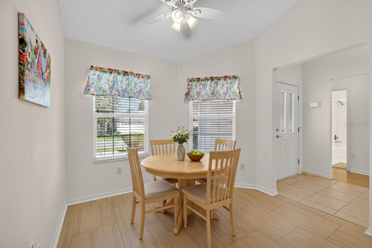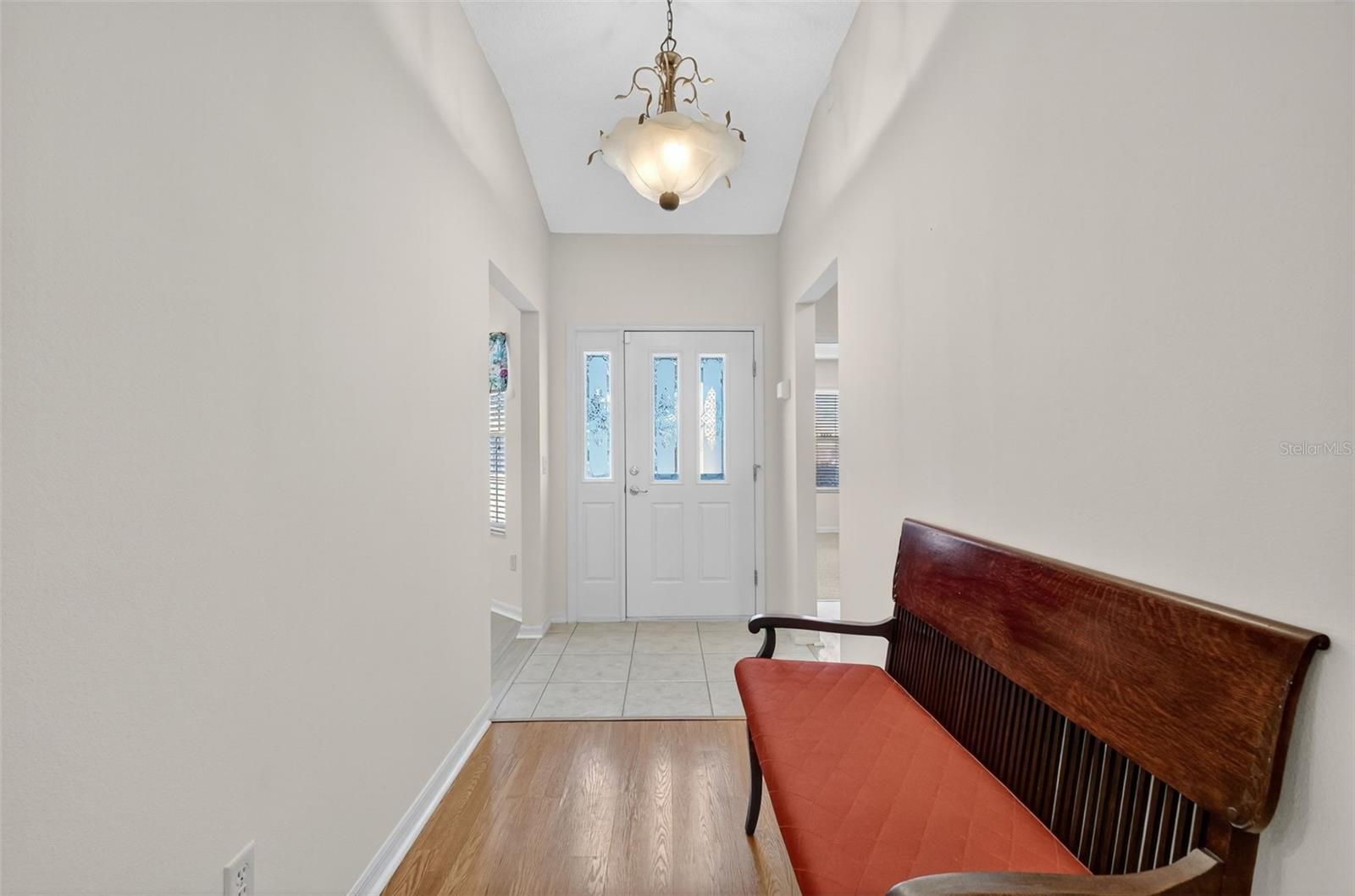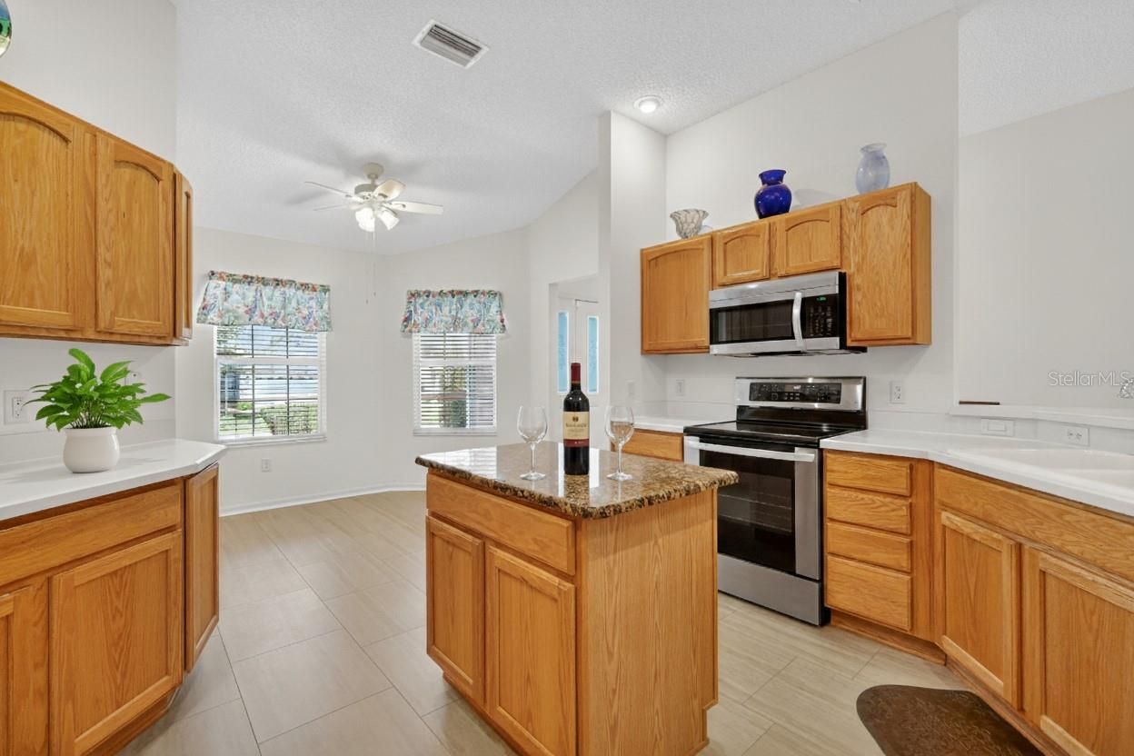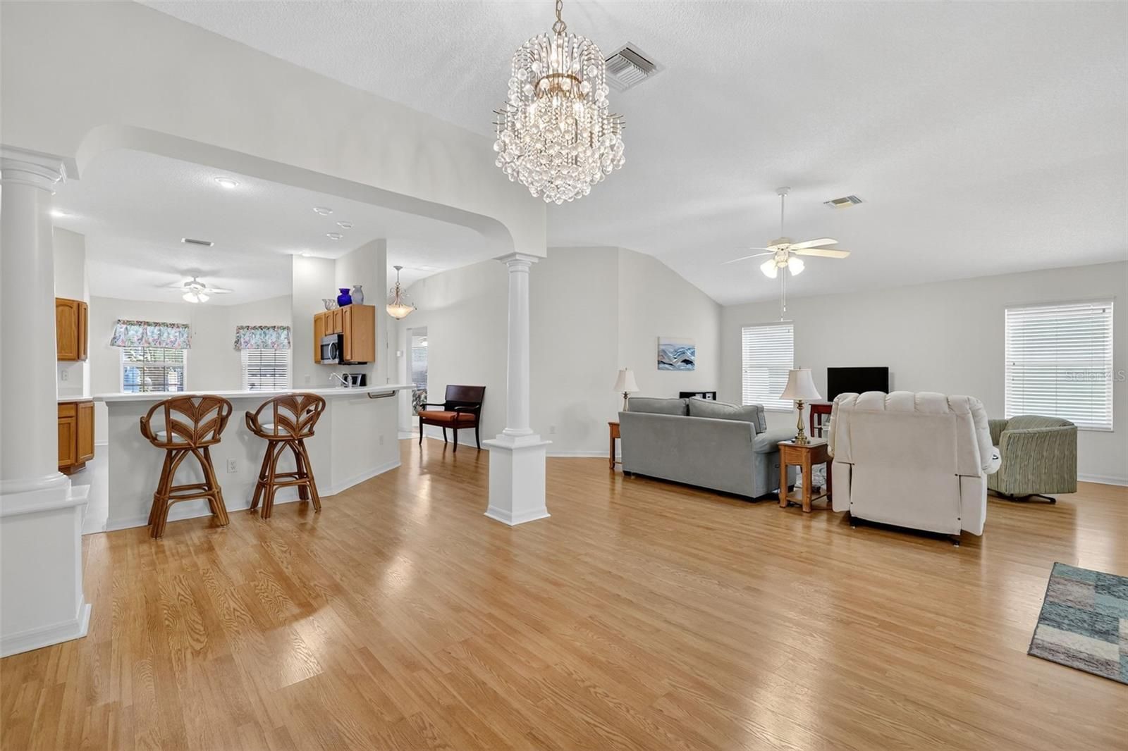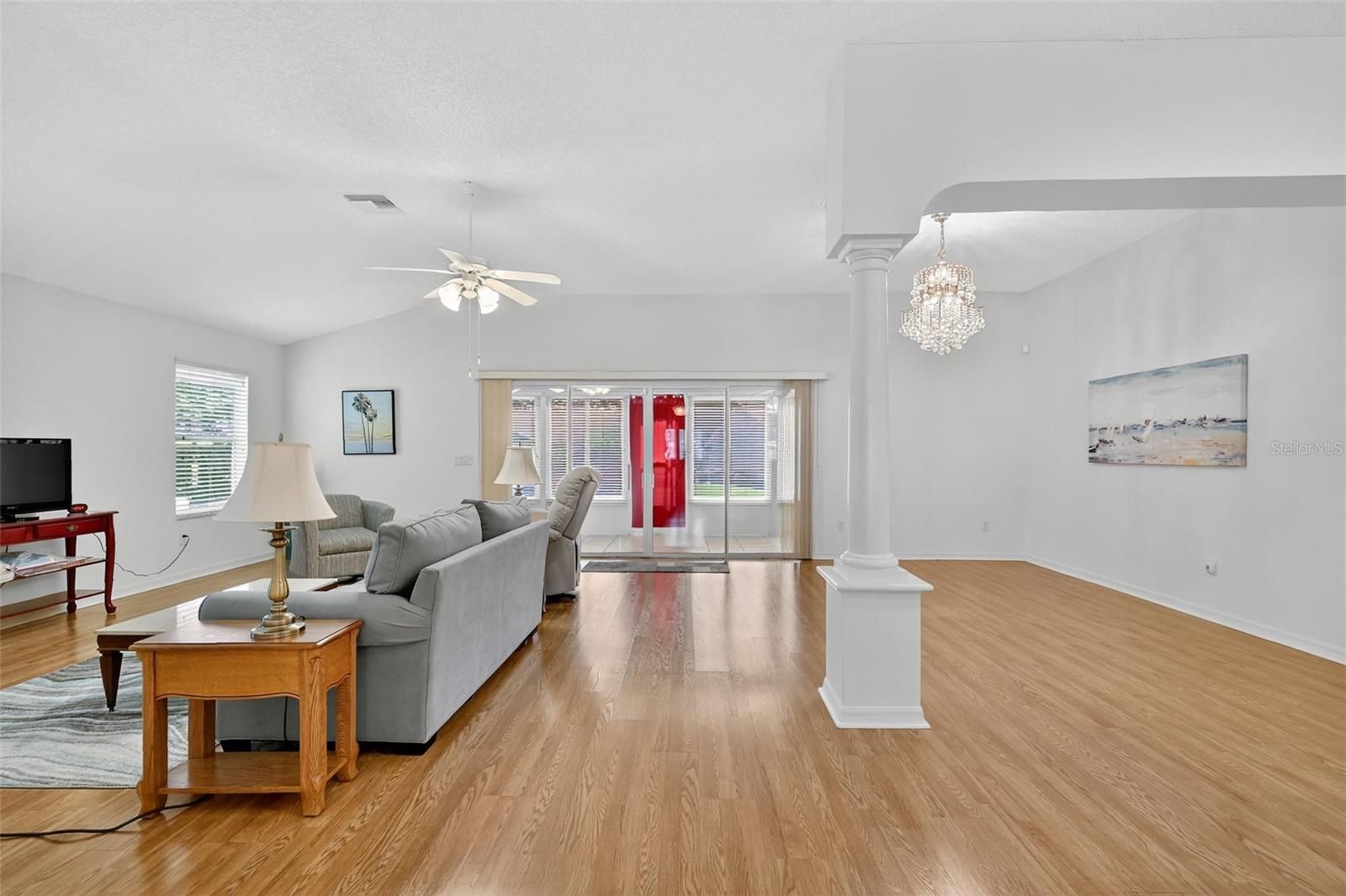 One or more photo(s) has been virtually staged. 2025 HVAC • 2020 ROOF • 2021 WATER HEATER • NO BOND • ALARM SYSTEM • 2021 APPLIANCES • ENCLOSED LANAI • ROOM FOR POOL. This 3-bedroom, 2-bath, Begonia Designer Home offers 1,918 sq ft of open-concept living in The Villages with mature landscaping and curb appeal. Every detail has been carefully maintained, from the roof to the floors, showing a clear commitment to quality living. The kitchen features a center island, breakfast bar, laminate counters, stainless steel appliances, and a bright breakfast nook. The open living/dining space includes laminate flooring, decorative columns, and a stunning Italian chandelier. Enjoy the spacious primary suite with dual walk-in closets, an ensuite bath with dual sinks, and updated porcelain tiled flooring & shower. Bedroom 2 features a built-in closet, carpet, and ceiling fan. Bedroom 3 is carpeted with a ceiling fan. The guest bath has updated tile flooring and a tub/shower combo. Enjoy the enclosed lanai with ceramic tile floors and a beautiful stained-glass window. The inside laundry and 2-car garage with attic storage, and an alarm system add convenience. EXTRA BONUS- This home is partially furnished! Just bring your toothbrush and start enjoying The Villages lifestyle. Located near Mulberry Grove Rec Center, Chatham Pool, and Nancy Lopez Golf.