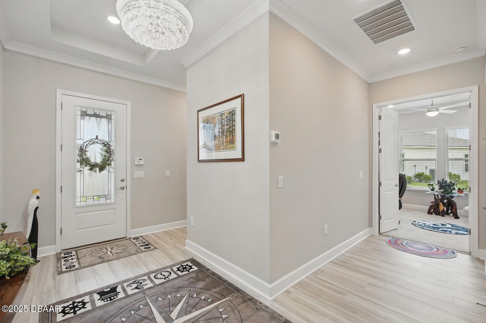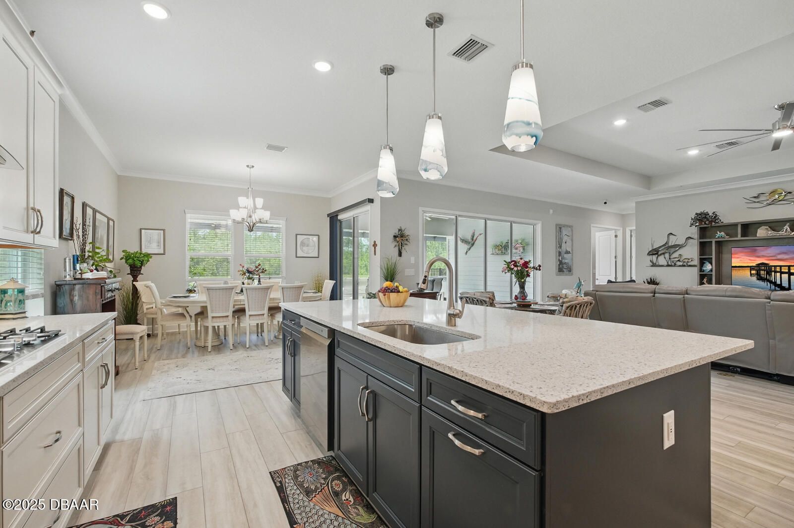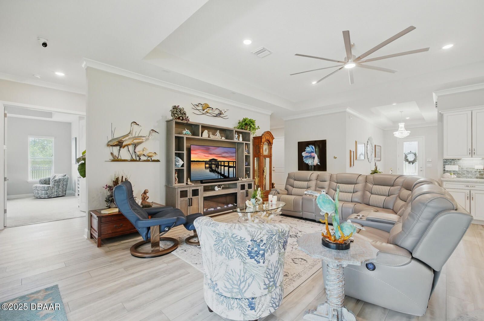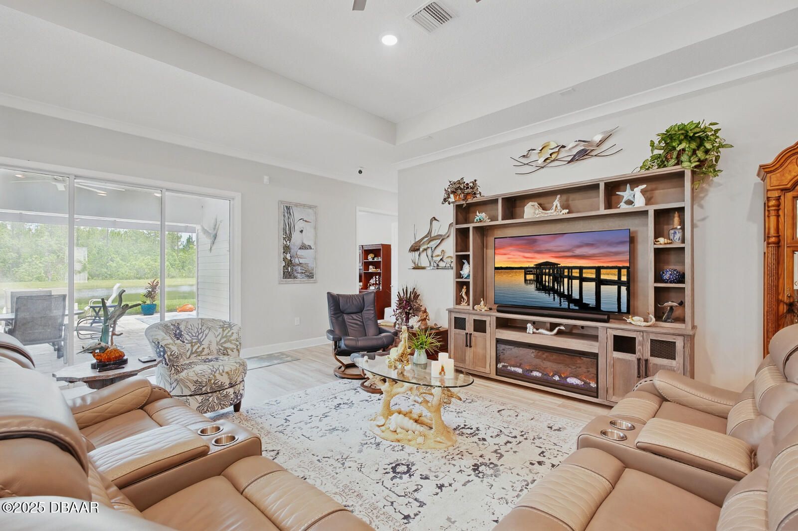 Save the time of building and move right in to this practically brand new custom-built home that feels like new! This incredible 4-bedroom plus office, 2.5-bath, 3-car garage home is perfectly positioned on a premier private lake lot in the highly desirable 55+ gated community of Reverie. From the moment you walk in, you'll be impressed by the soaring ceilings enhanced with upgraded tray ceilings, chunky crown molding, and luxury LVP flooring throughout the main living areas. The open split floor plan is an entertainer's dream, anchored by a stunning kitchen featuring two-toned soft-close cabinetry, a gas range with vent hood, oven/microwave , quartz countertops, a spacious island with bar seating, glass subway tile backsplash, custom wine/coffee bar with wine fridge, and a massive walk-in pantry with elegant pendant lighting. The large living and dining areas overlook the serene preserve and pond, providing peaceful views and the ultimate privacy. The large living and dining areas overlook the serene preserve and pond, providing peaceful views. expansive primary suite offers two walk-in closets and a luxurious en-suite bath with a glass-enclosed, tiled shower featuring dual shower heads, stone accents, 2 built-in seat, and a double quartz vanity. A private office with lake views is conveniently located just off the primary bedroom. The three guest bedrooms are located on the opposite side of the home, offering space and comfort for visiting friends and family, along with a full guest bath. Enjoy Florida living from your 16'x48 oversized 30' mega screened lanai with unobstructed views thanks to a mega screen design, custom paver floor, and a stone planter feature. Built with durable Hardie board construction, this home also includes a whole-house Generac generator, a tankless,Renai water heater, 2 flood lights covering the backyard, and a security system with cameras on the front and back entrances.Owner has also installed over 45 linear feet of Safe Rac shelving along garage walls, over 100 sq ft of plywood flooring in attic for storage, and has had an underground natural gas line put in to enable an installation of a gas fire pit or fire table on the lanai. An aluminum spindle fence per HOA code has also been installed around approximately 1/3 of the backyard Reverie at Palm Coast offers active adult living with close proximity to beaches, golf, restaurants, and shoppingtruly the perfect blend of luxury, privacy, and convenience.