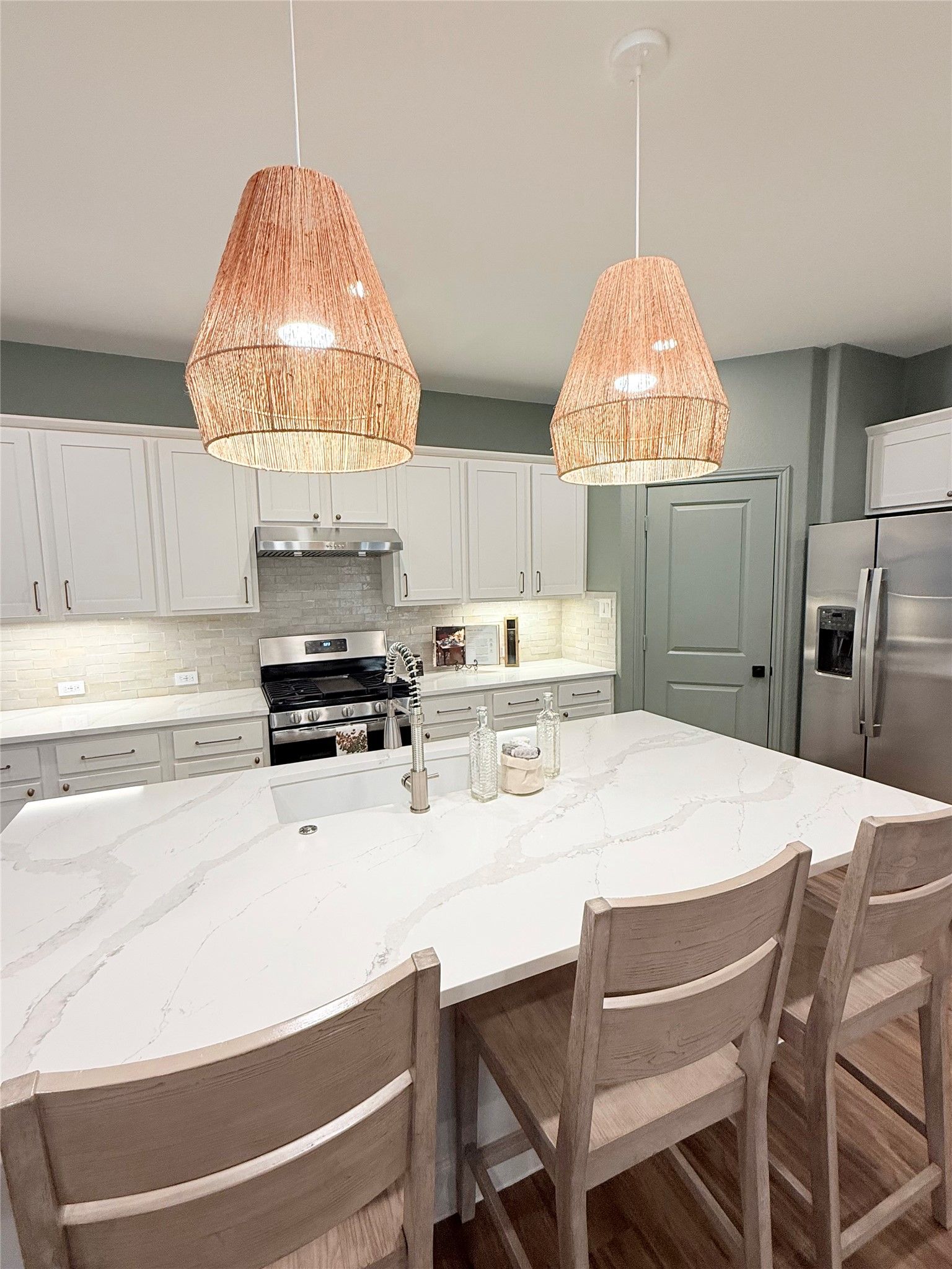 - Dishwasher, Exhaust Fan, Free-Standing Refrigerator, Disposal, Gas Range, Microwave, Refrigerator, Range Hood, Stainless Steel Appliance(s)