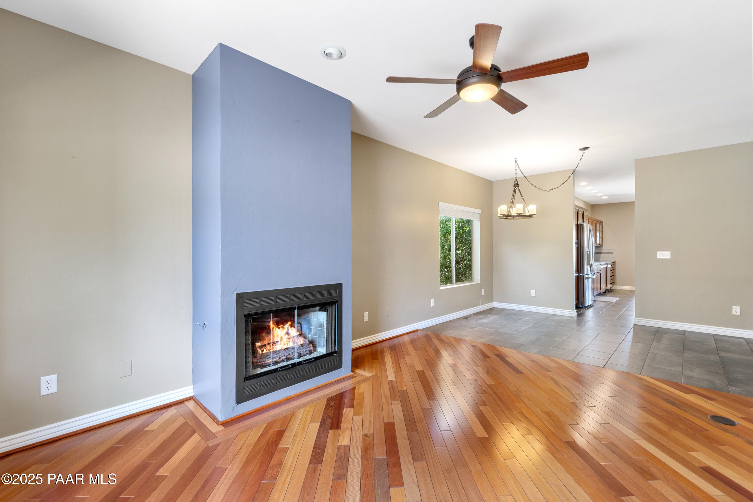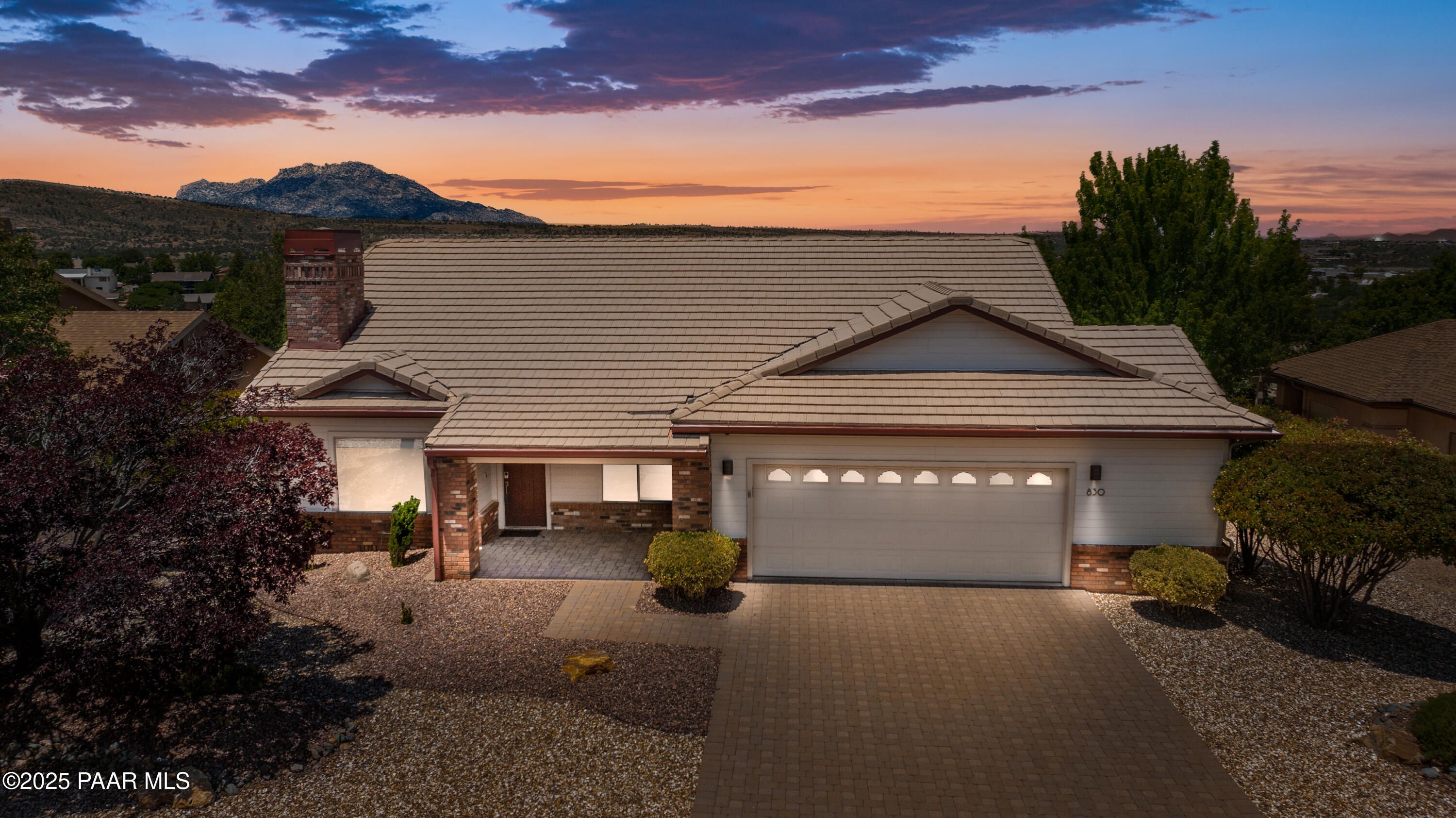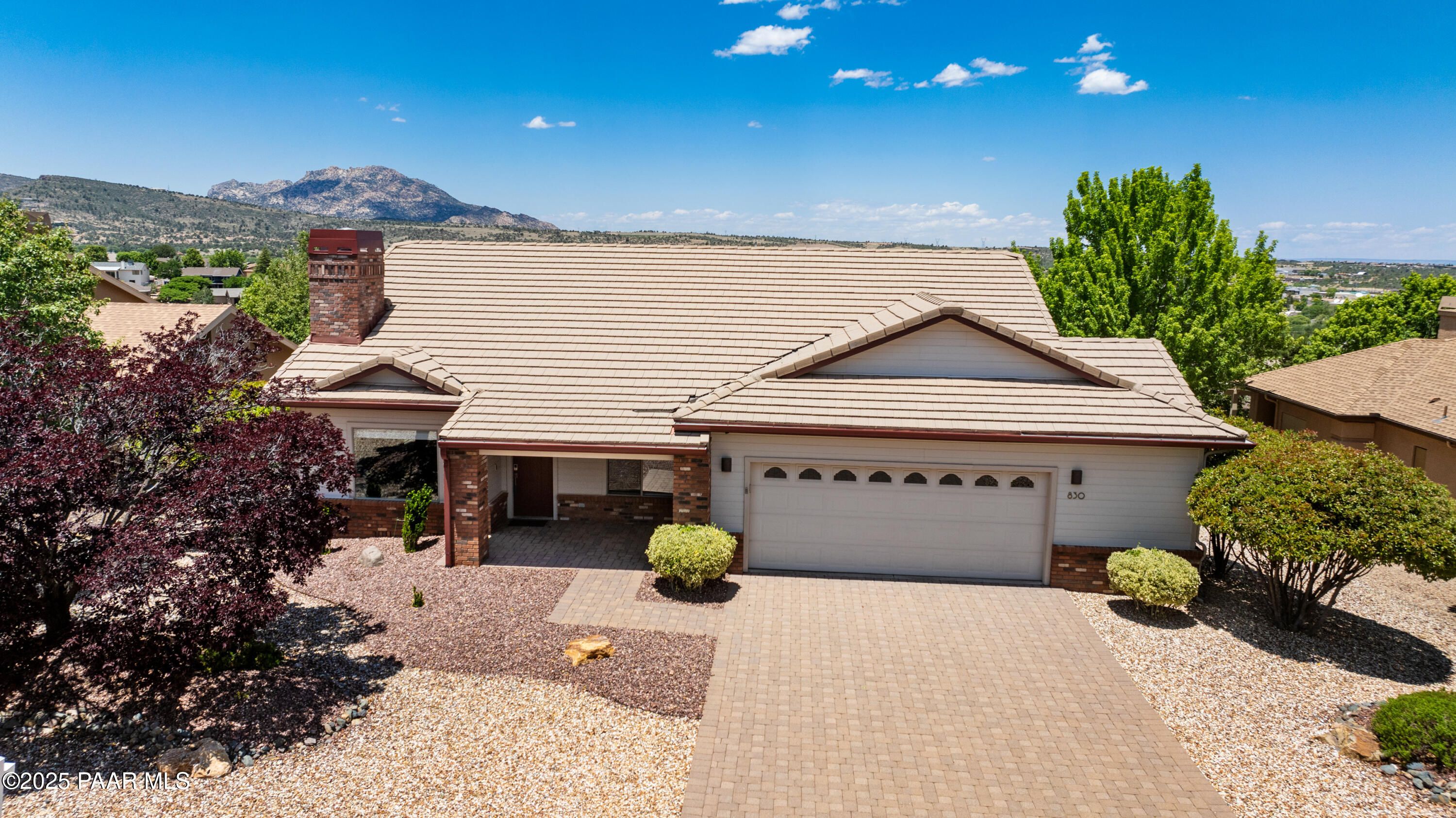 Nestled in the heart of the highly sought-after Prescott Lakes community, this recently remodeled home offers main-level living with breathtaking views of Granite Mountain by day & twinkling city lights by night. The mature landscaping creates an inviting first impression as you approach the home. Upon entering, you are welcomed by a modern tile foyer, with the living room to your left. This space features a soaring flat ceiling, a cozy gas fireplace, a large picture window, and beautifully laid diagonal wood floors, creating a warm atmosphere. Adjacent to the living room is the formal dining area, finished with the same stylish tile as the foyer, offering a seamless transition between spaces. The kitchen is a chef's dream, boasting stainless steel appliances, including a trash compactor, custom cherry-wood cabinetry, and stunning concrete countertops that add a unique, artistic touch. Just off the foyer, the den/office provides a flexible space that could easily be converted into a Fourth bedroom if desired. The luxurious primary suite is a serene retreat, featuring an ensuite bath designed for relaxation. It includes a walk-in shower with rain glass, dual sinks with concrete countertops, ample cabinetry, and a spacious walk-in closet. This level also includes a second bedroom, a full bath, and a convenient laundry/mudroom that leads to the 2.5-car garage. Step outside onto the expansive covered deck, where you can soak in the panoramic views while enjoying Prescott's mild year-round climate. The lower level is a bonus, offering a large family room with picture windows that bring in plenty of natural light and access to the backyard and patio. The third bedroom is spacious and comes with an ensuite bathroom, perfect for guests or extended family. Ample space on this level to create another bedroom as well. The backyard is an entertainer's dream, featuring a beautiful paver patio that extends beyond the deck, ideal for a firepit and providing privacy from neighboring homes. This home is a rare opportunity to enjoy the comfort and amenities of living in Prescott Lakes, with its resort-style offerings.