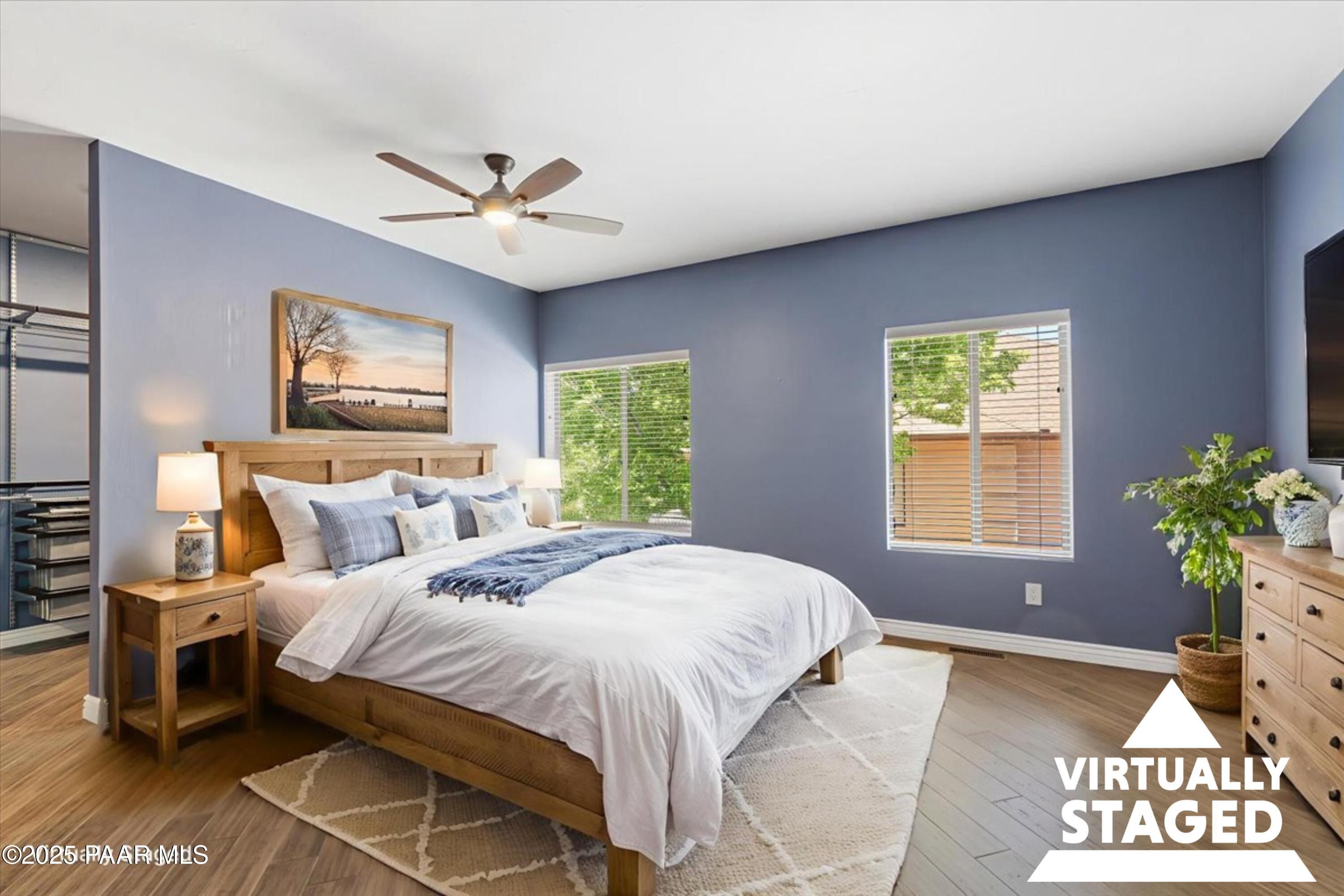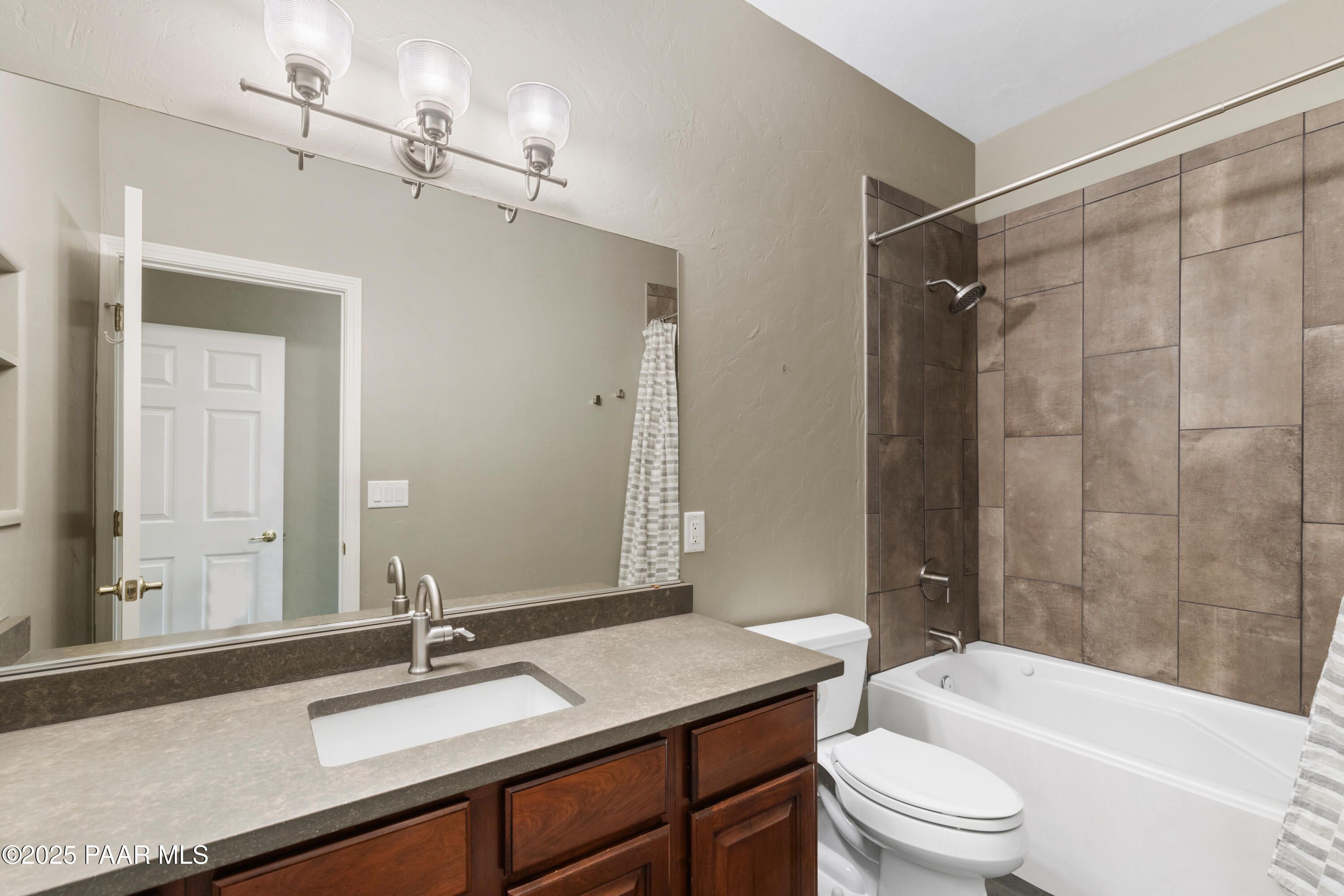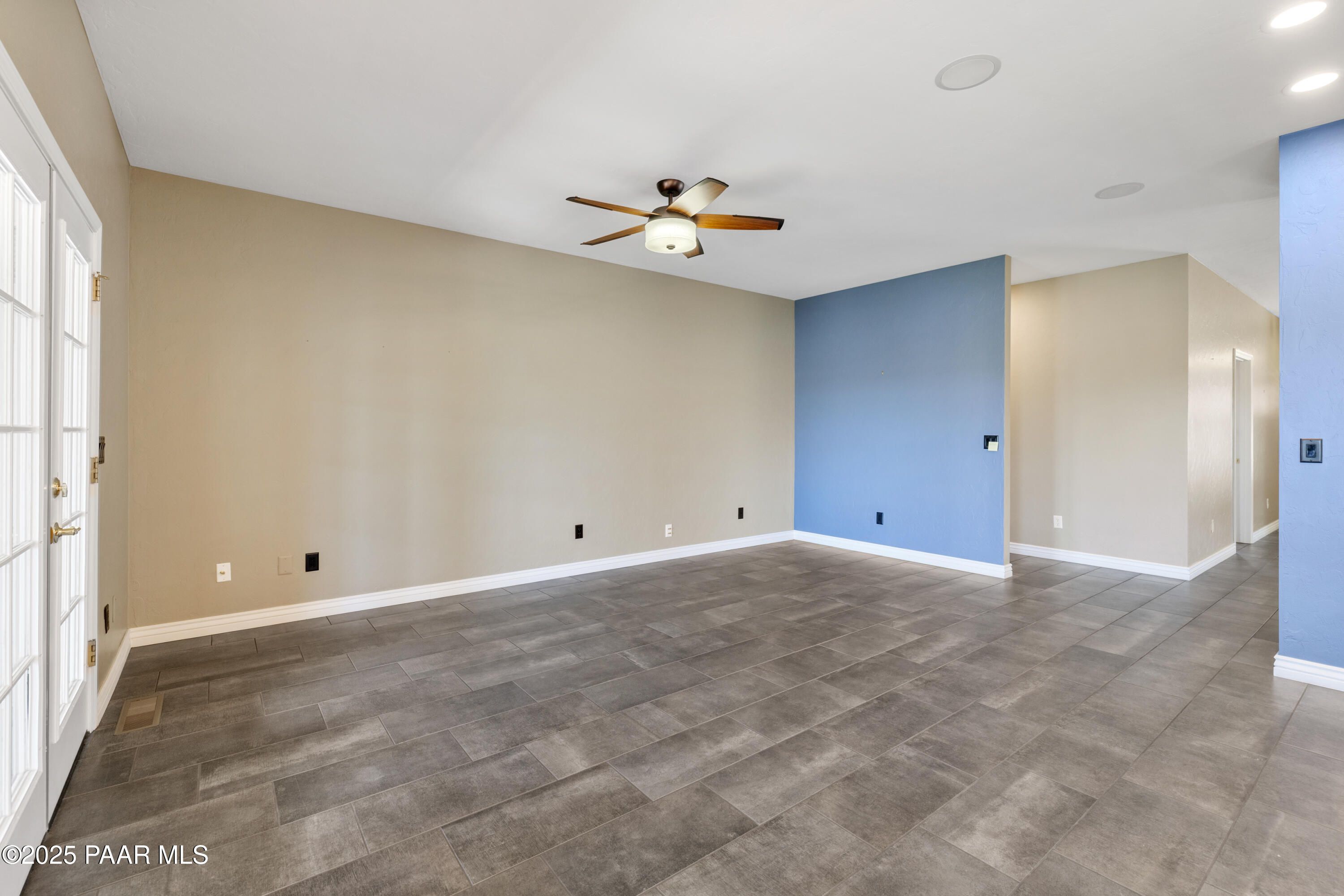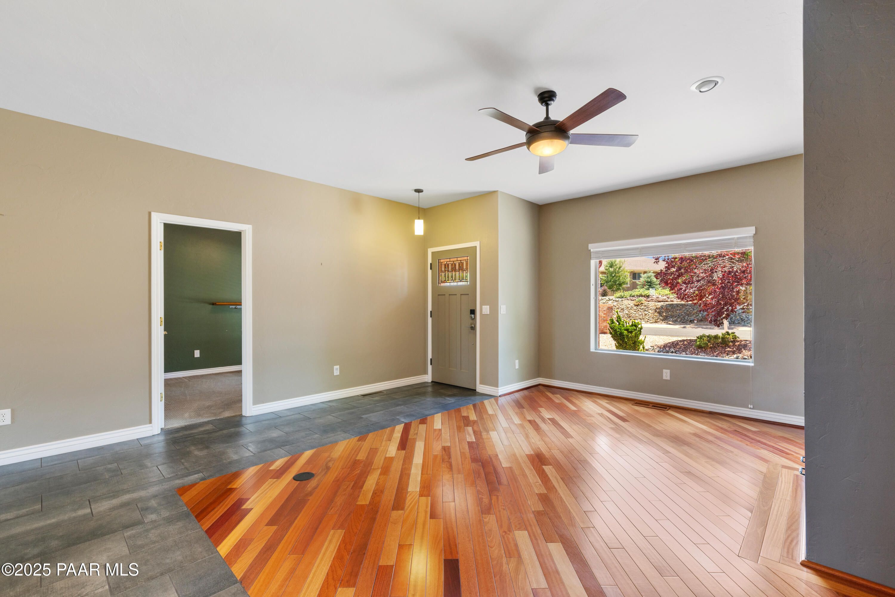 Nestled in the heart of the highly sought-after Prescott Lakes community, this recently remodeled home offers main-level living with breathtaking views of Granite Mountain by day & twinkling city lights by night. The mature landscaping creates an inviting first impression as you approach the home. Upon entering, you are welcomed by a modern tile foyer, with the living room to your left. This space features a soaring flat ceiling, a cozy gas fireplace, a large picture window, and beautifully laid diagonal wood floors, creating a warm atmosphere. Adjacent to the living room is the formal dining area, finished with the same stylish tile as the foyer, offering a seamless transition between spaces. The kitchen is a chef's dream, boasting stainless steel appliances, including a trash compactor, custom cherry-wood cabinetry, and stunning concrete countertops that add a unique, artistic touch. Just off the foyer, the den/office provides a flexible space that could easily be converted into a Fourth bedroom if desired. The luxurious primary suite is a serene retreat, featuring an ensuite bath designed for relaxation. It includes a walk-in shower with rain glass, dual sinks with concrete countertops, ample cabinetry, and a spacious walk-in closet. This level also includes a second bedroom, a full bath, and a convenient laundry/mudroom that leads to the 2.5-car garage. Step outside onto the expansive covered deck, where you can soak in the panoramic views while enjoying Prescott's mild year-round climate. The lower level is a bonus, offering a large family room with picture windows that bring in plenty of natural light and access to the backyard and patio. The third bedroom is spacious and comes with an ensuite bathroom, perfect for guests or extended family. Ample space on this level to create another bedroom as well. The backyard is an entertainer's dream, featuring a beautiful paver patio that extends beyond the deck, ideal for a firepit and providing privacy from neighboring homes. This home is a rare opportunity to enjoy the comfort and amenities of living in Prescott Lakes, with its resort-style offerings.