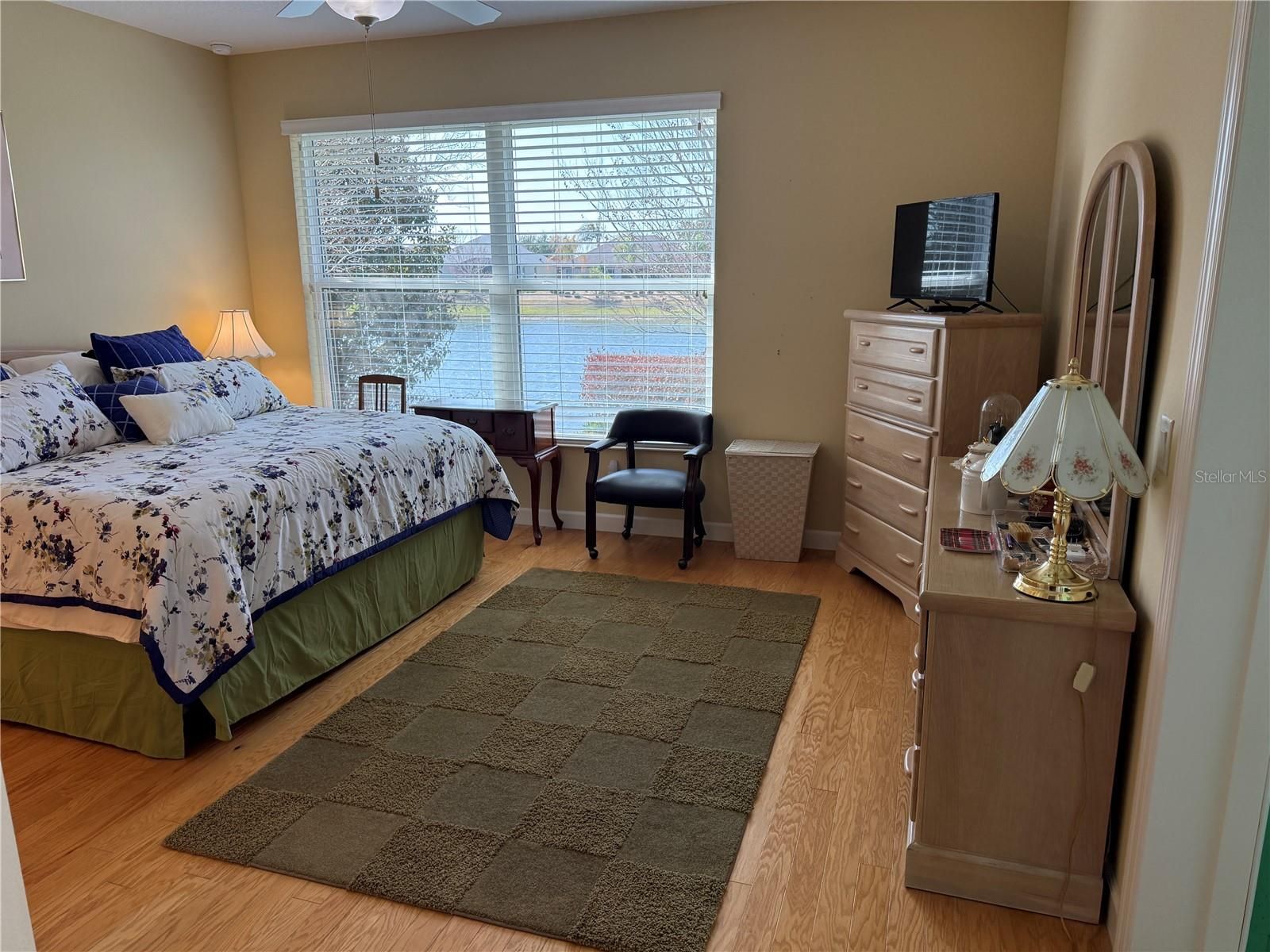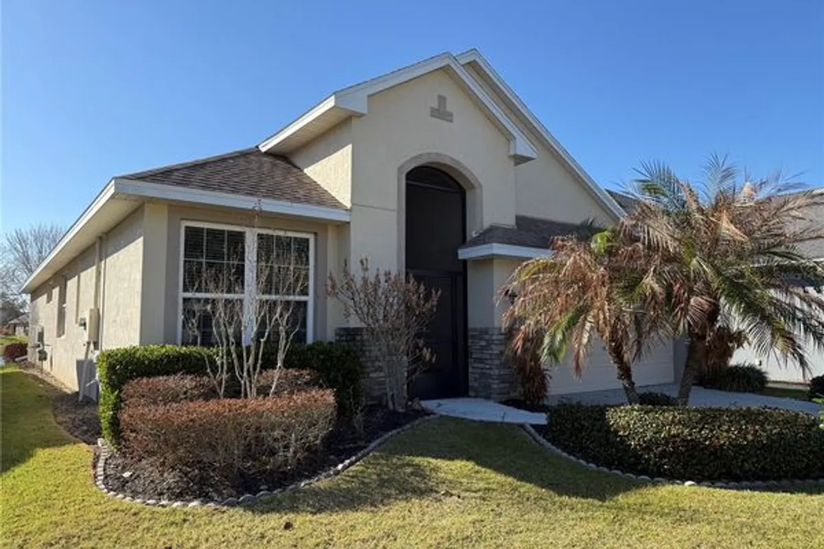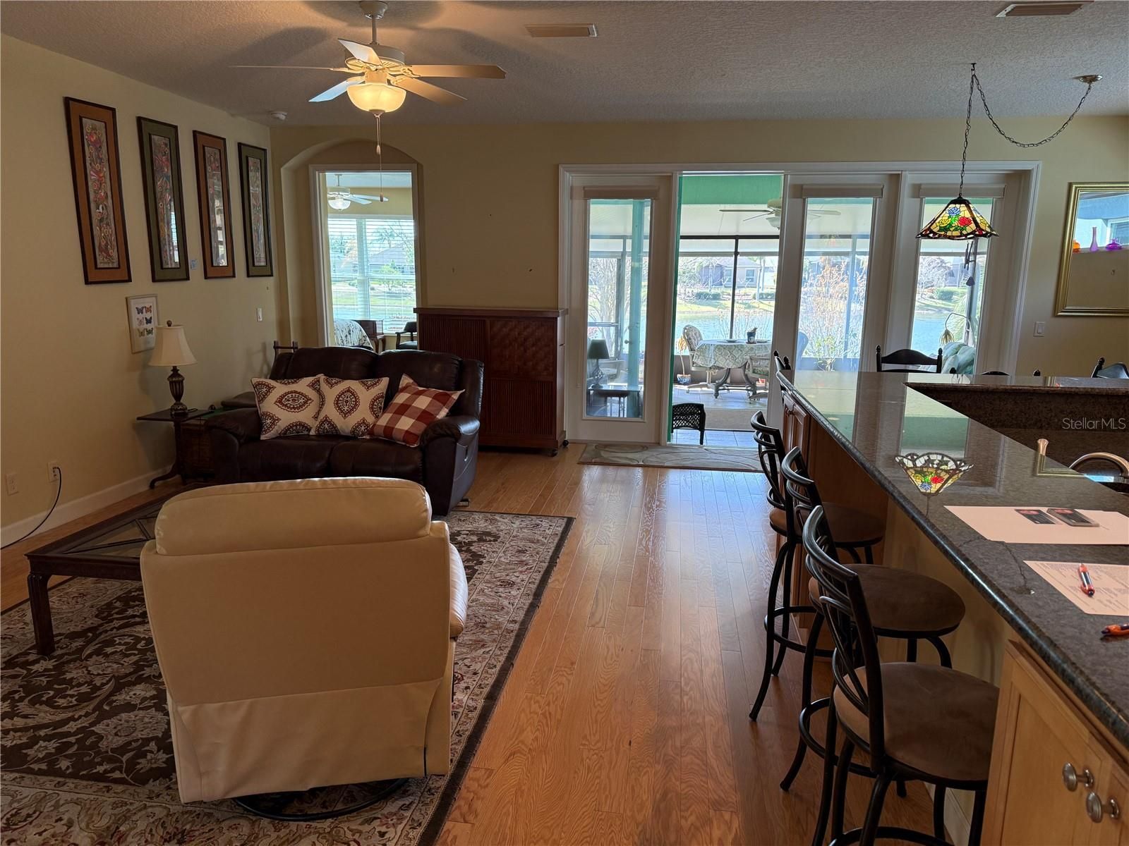 A design that is breath taking and relaxation, as you walk in the front door, this home, built by Pringle Builders in 2015 with 1823 sq. ft. of open design charm and pleasure renders immediate appeal. To the left of the foyer is nestled a lovely bedroom with a tiled tub with shower, an adjacent linen closet opening back, directly to beautiful tongue and groove oak floors and a view through French Doors and expanded Lanai to the striking water view peeking above floral and fauna with sand hill cranes, even Eagles or Osprey or Anhinga, at times, diving for food. Probably, room for a pool, but currently a screened and very comfortable expanded Lanai with grassy expanse to the waters edge where a canoe or kayak could rest on your bank for easy access to navigate a fairly large body of water, even some moor a pontoon boat on their banks (must not be gas propelled & not over-night). Catch and release fishing is available (Eagles and Osprey excepted) brings some respectful catches. Moving further from the foyer, the open design of comfort and beauty in this home, opens to a large family room that includes a dining area on the right of the entertainment center while expanding to a granite top and an impeccable kept kitchen with tile and hardwood cabinets and stainless steel appliances. Just beyond the gorgeous kitchen lies a larger than expected eating area with the continued pleasure of a view through the Lanai to rippled waters of the Lake. Inconspicuously just off the Family Room is quite a nice bedroom- or office space with glass French doors, while on the back left corner, the Primary Bedroom invites you to rest with easy access to the expanded Lanai or enjoy the view of Azaleas and Crepe Myrtle with an amazing view of the Lake. Privately around the corner of a roomy bedroom is a hallway with two large closets and bonus linen and medicine pantries that precede to a large walk-in tiled shower, double sinks with large mirror and cabinet space, tucked at the end with a roomy water closet with a pocket door for privacy. You must see this charm and gracefulness to experience it for yourself. Come take a look and see. Kept like new ready for you to find the same joy and happiness! Further enjoyment awaits with having a special relationship and access to the Mount Dora Country Club with a direct gate from the Lakes to the County Club directly access with just a click on your gold cart. Or, enjoy the 18000 sq. ft. Community Center in the Lakes of Mt. Dora with activities and clubs, bingo, bocce, large swimming pool, sauna, exercise room, library, auditorium where shows and dance and celebrations bring joy. Pickle Ball, tennis, croquet, or a trail around with exercise stations. All near shopping, medical needs, 45 minutes to MCO or Disney or Universal. Just a short drive to downtown Mount Dora with its special charm and quinine, or an hour to the Ocean. All within the walls of this lovely home in a community maintained to reasonable standards by leaders of an HOA that have earned respect for efficiency and management for a lovely place to live.