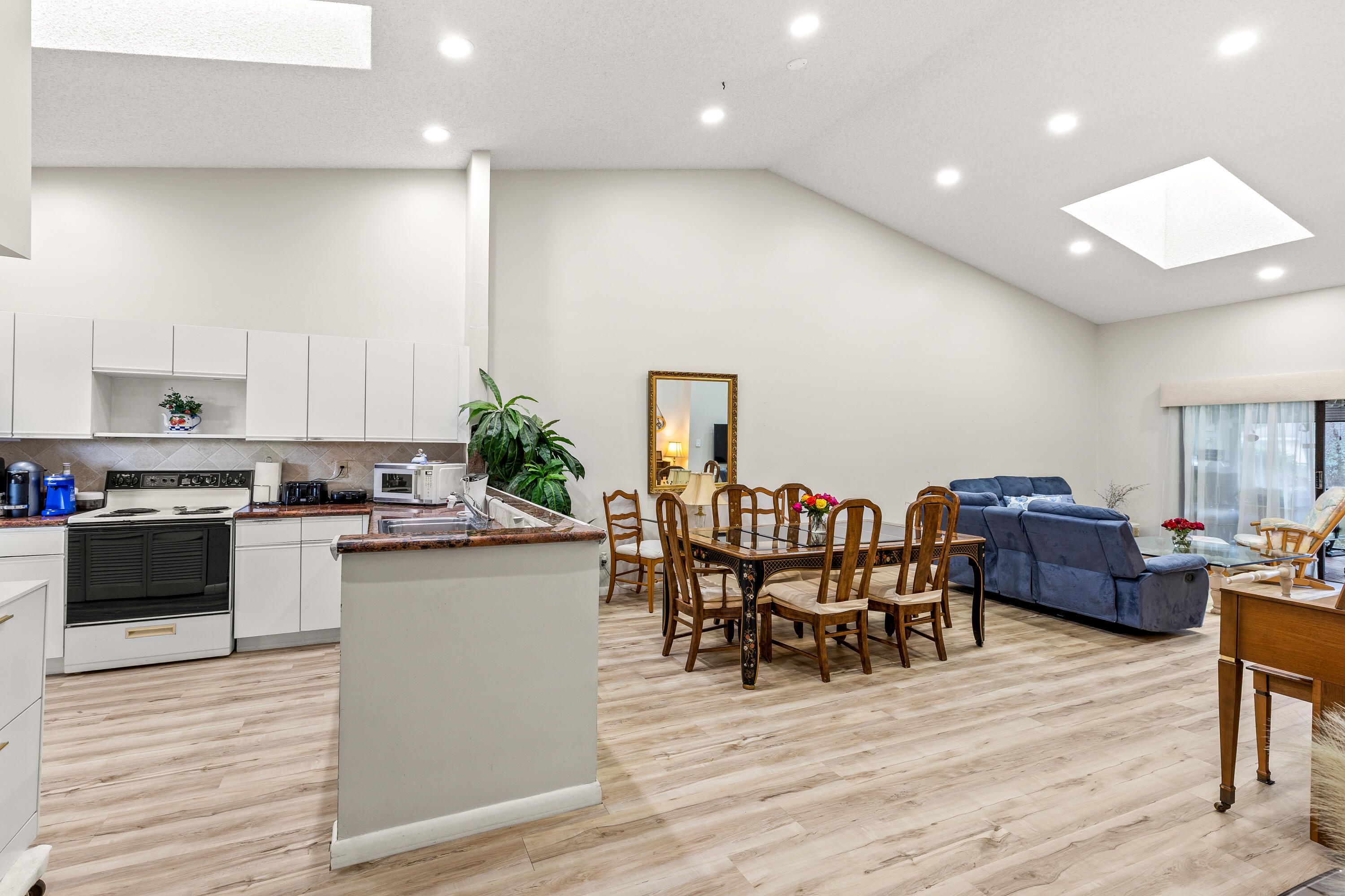 Welcome home to this rarely available Regal model in the desirable Parkshore section of Whisper Walk. This spacious 3-bedroom, 2-bath villa offers a bright, open layout designed for comfort and easy living. Vaulted ceilings, Recessed lights, two skylights, and expansive living areas fill the home with natural light, creating a warm and inviting atmosphere from the moment you enter. The thoughtfully designed split-bedroom floor plan provides privacy for guests, while the primary suite features generous proportions and ample closet space. An eat-in kitchen with a large pantry, full-size washer and dryer, and abundant storage make everyday living effortless. Tile and LVP flooring spread throughout the house for easy upkeep and keeping the house clean. Step into the enclosed Florida room, perfect for your morning coffee, relaxing afternoons, or entertaining while overlooking serene garden views. A one-car garage and private driveway add convenience rarely found in condo living. Located within Whisper Walk, a beautifully maintained, gated 55+ community spanning over 300 acres and 11 lakes, residents enjoy a true resort-style lifestyle surrounded by tranquil lakes and lush landscaping. Amenities include 8 tennis and 4 pickleball courts, a heated pool and spa, fitness center, sauna, and an active clubhouse with social rooms, library, billiards, card room, event space with a dance floor and year-round events curriculum. This is more than a home--it's a lifestyle. Come experience why Whisper Walk continues to be one of Boca Raton's most sought-after active adult communities
