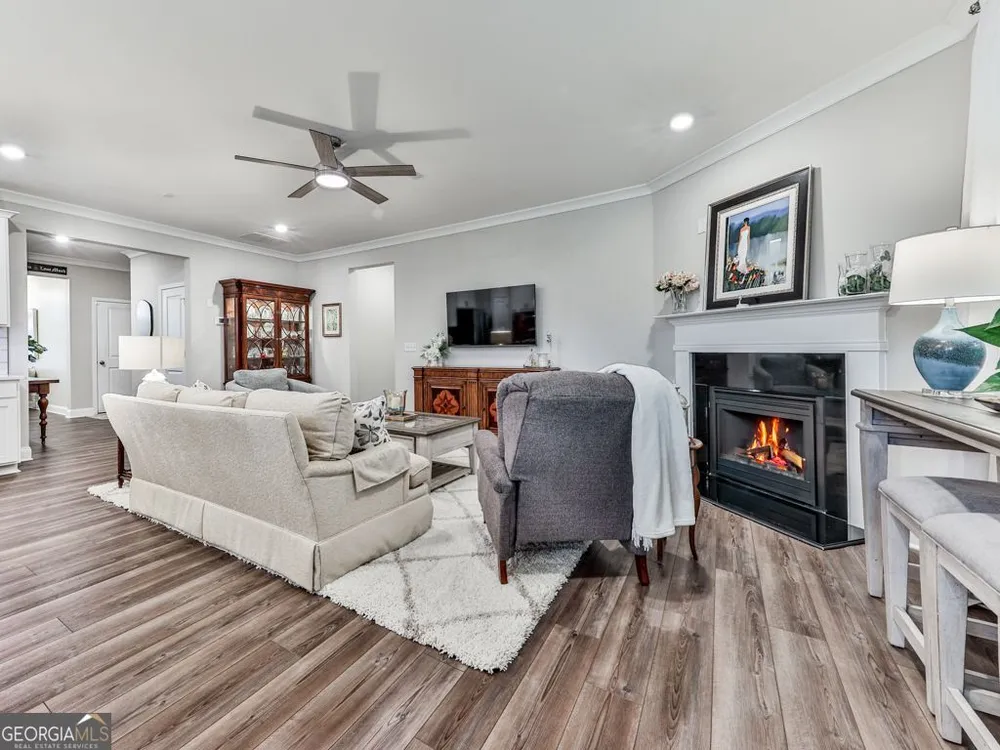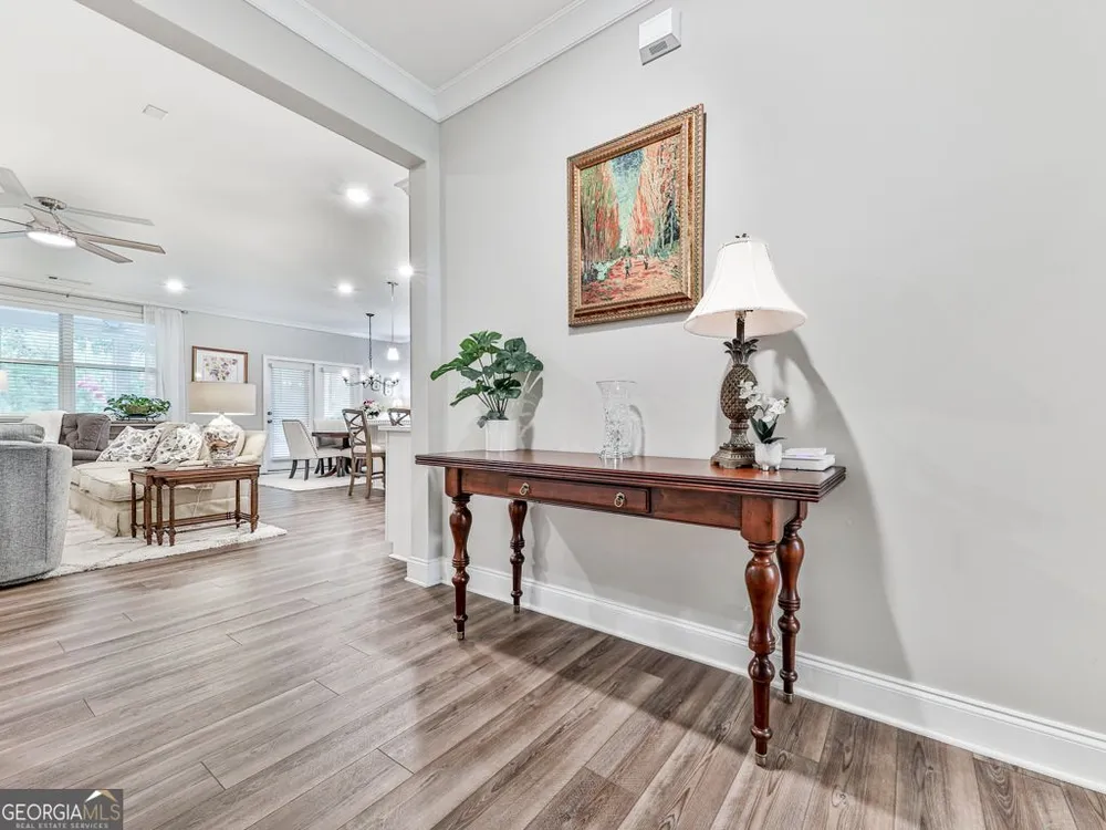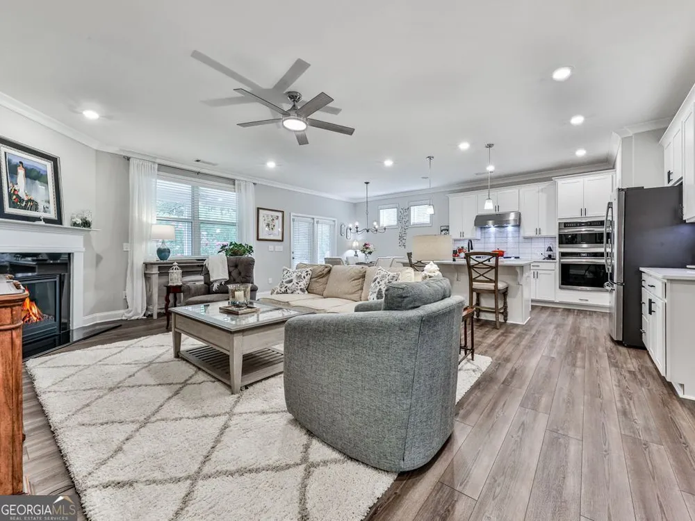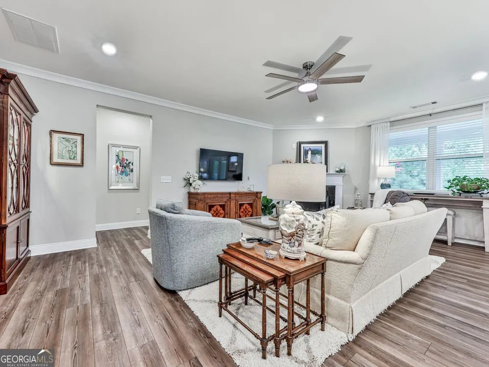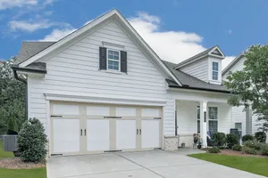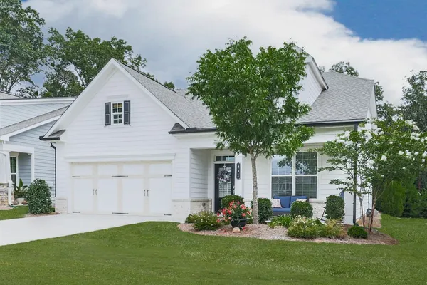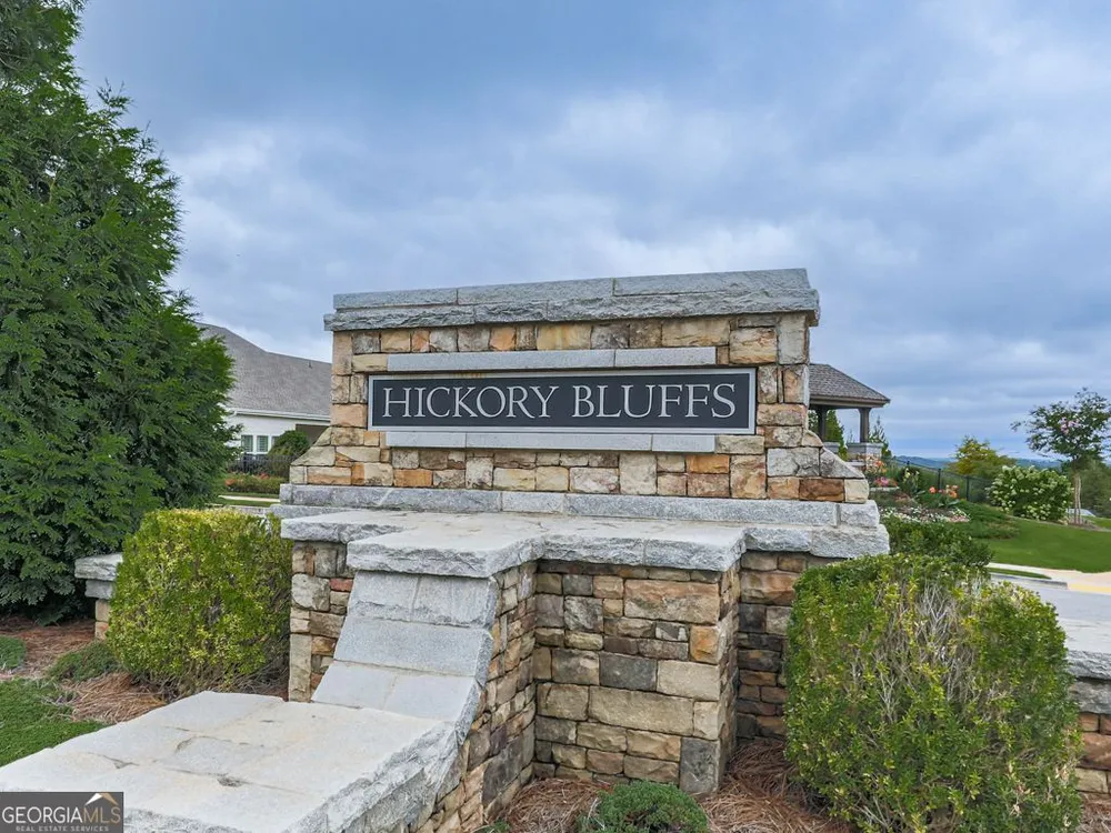 Beautifully appointed home in gated Hickory Bluffs! Seller has spared no expense in making this house a home. Luxury vinyl plank throughout main living area and secondary bedroom. Open concept living with stylish kitchen including additional cabinets with extended quartz counter, new cabinet hardware, upgraded island countertop with Blanco enlarged sink which includes upgraded faucet, Sinkerator instant hot water, and push button sink disposal. Please don't forget to observe the custom designer backsplash and California Closets custom pantry system. Updated lighting and fans in dining area and cozy, fireside living room. Enter the serene primary quarters with large additional sitting area with remote controlled window treatments. Spa like bath includes separate vanities, upgraded comfort height toilet, custom shower floor, custom linen cabinet, and upgraded frameless shower door. Double closets both exhibit custom California Closets built ins. If extra storage is needed, no worries- garage has upper attic storage with pull down stairs! Upcoming cooler temperatures will have you longing to sojourn to the custom screened- in rear patio overlooking the lush back yard adorned with vibrant Crepe Myrtles and backing up to green space. Sprinkler system makes easy work of keeping professional landscaping hydrated! Community amenities include scrumptious pool, 6 tennis courts, 3 pickleball courts, and a well appointed clubhouse.