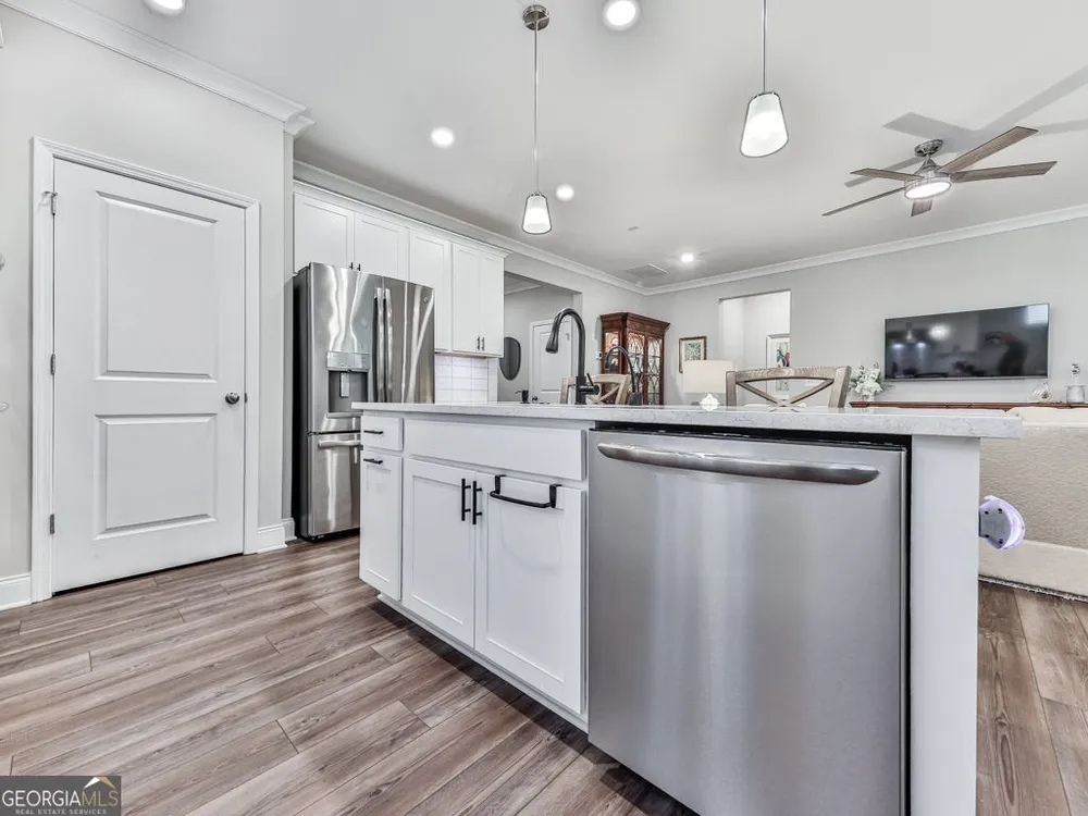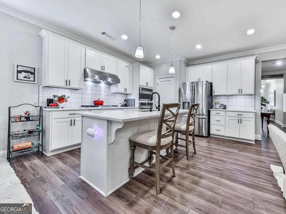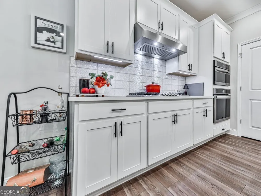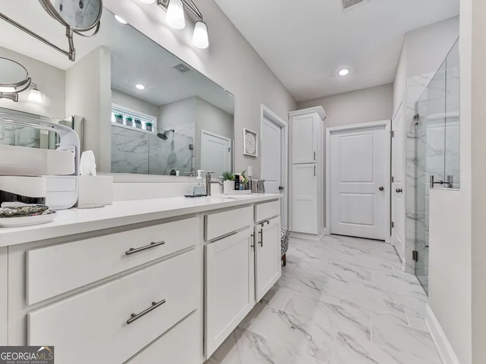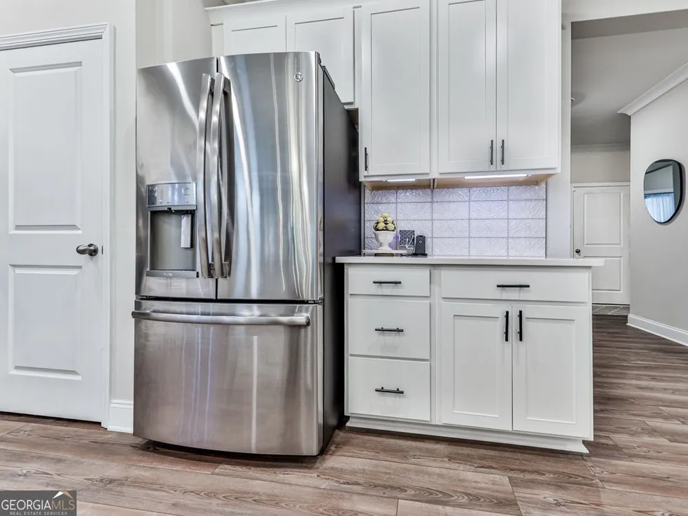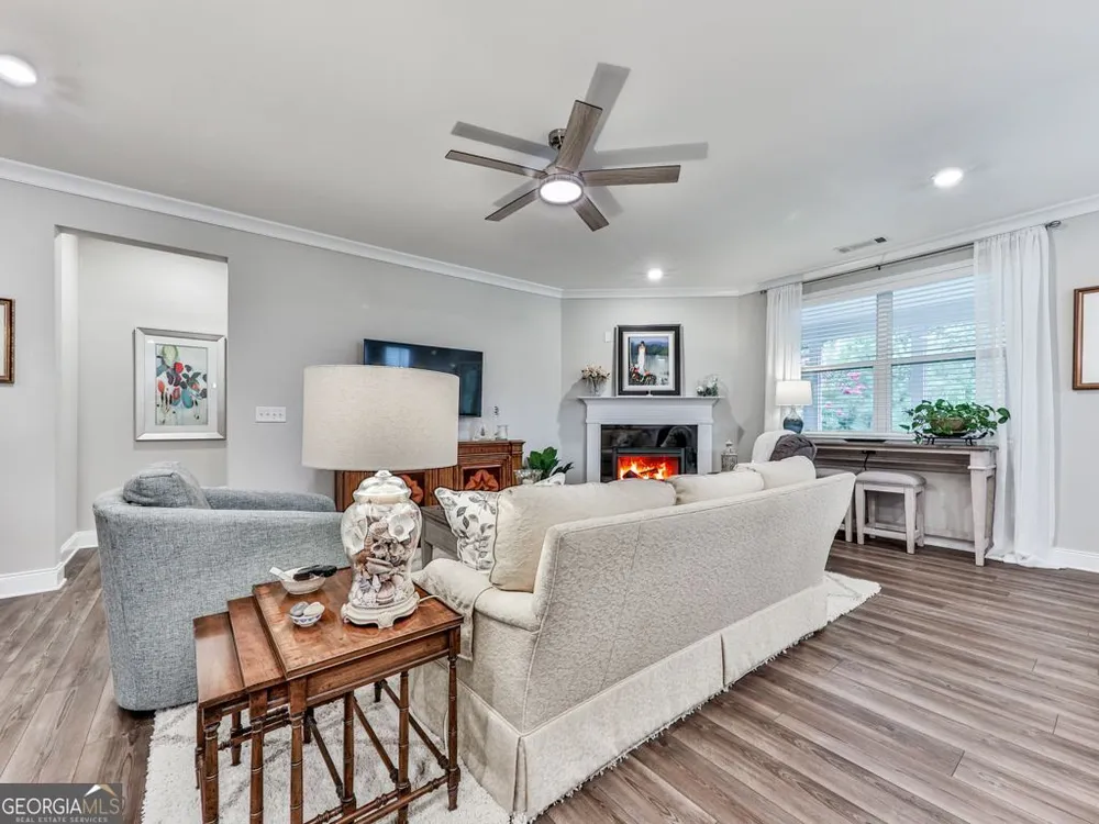 Beautifully appointed home in gated Hickory Bluffs! Seller has spared no expense in making this house a home. Luxury vinyl plank throughout main living area and secondary bedroom. Open concept living with stylish kitchen including additional cabinets with extended quartz counter, new cabinet hardware, upgraded island countertop with Blanco enlarged sink which includes upgraded faucet, Sinkerator instant hot water, and push button sink disposal. Please don't forget to observe the custom designer backsplash and California Closets custom pantry system. Updated lighting and fans in dining area and cozy, fireside living room. Enter the serene primary quarters with large additional sitting area with remote controlled window treatments. Spa like bath includes separate vanities, upgraded comfort height toilet, custom shower floor, custom linen cabinet, and upgraded frameless shower door. Double closets both exhibit custom California Closets built ins. If extra storage is needed, no worries- garage has upper attic storage with pull down stairs! Upcoming cooler temperatures will have you longing to sojourn to the custom screened- in rear patio overlooking the lush back yard adorned with vibrant Crepe Myrtles and backing up to green space. Sprinkler system makes easy work of keeping professional landscaping hydrated! Community amenities include scrumptious pool, 6 tennis courts, 3 pickleball courts, and a well appointed clubhouse.