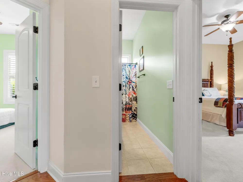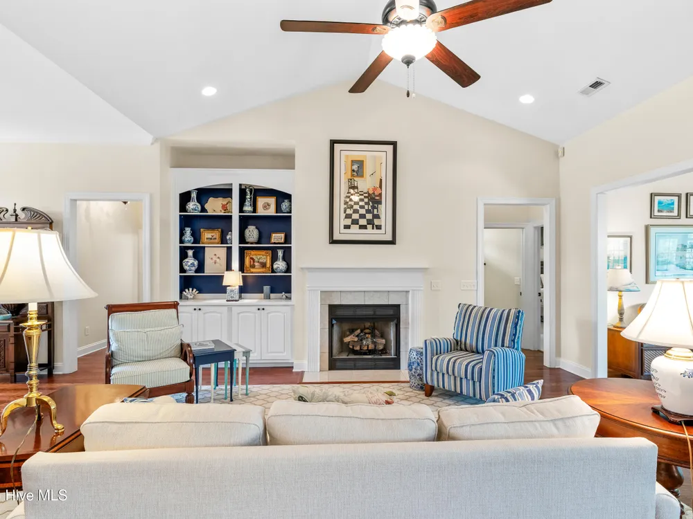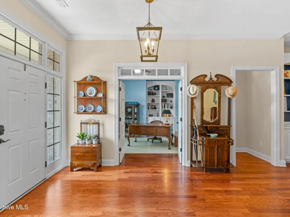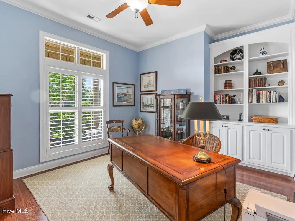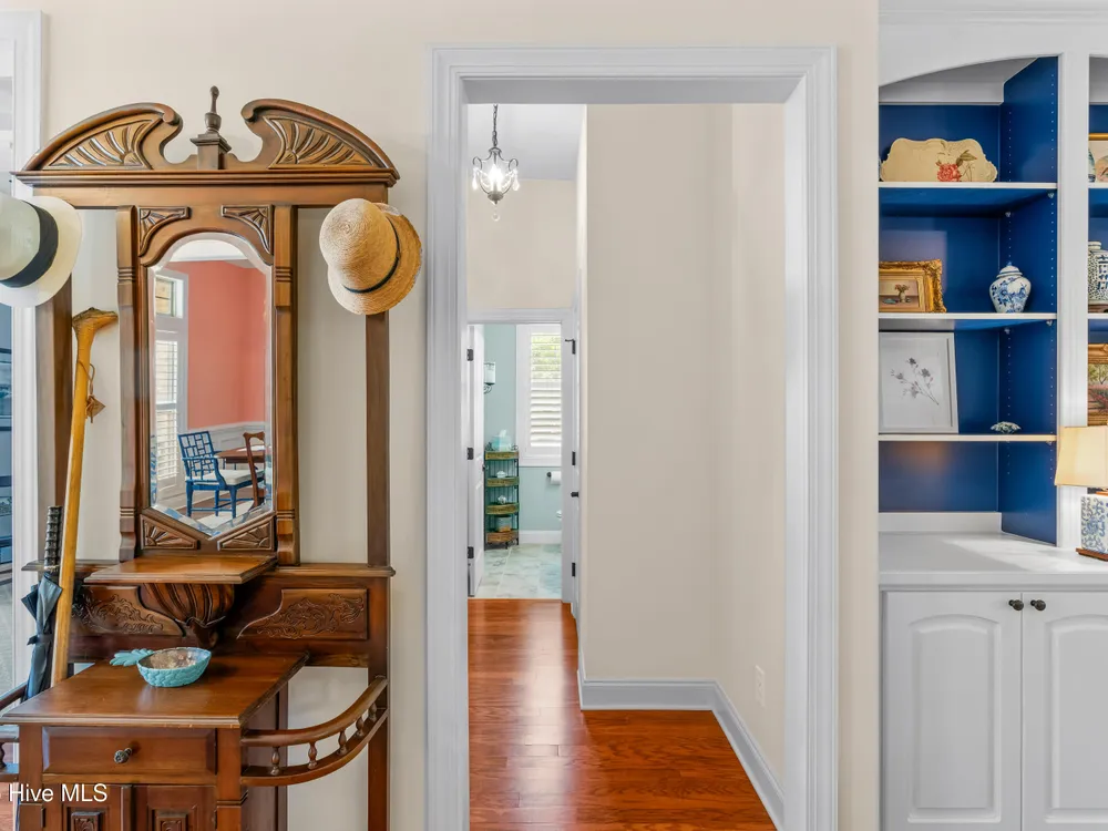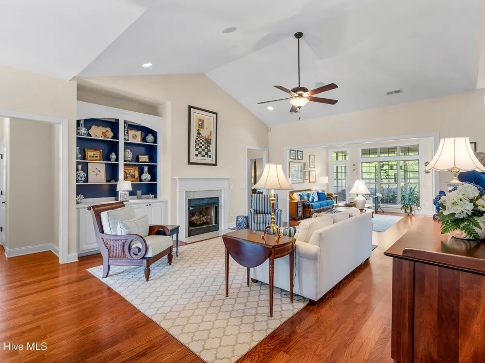 - Blinds/Shades, Solid Surface, Walk-In Closet(s), Walk-in Shower, Entrance Foyer, Pantry, Mud Room, Master Downstairs, Kitchen Island, High Ceilings, Gas Log, Ceiling Fan(s), Bookcases