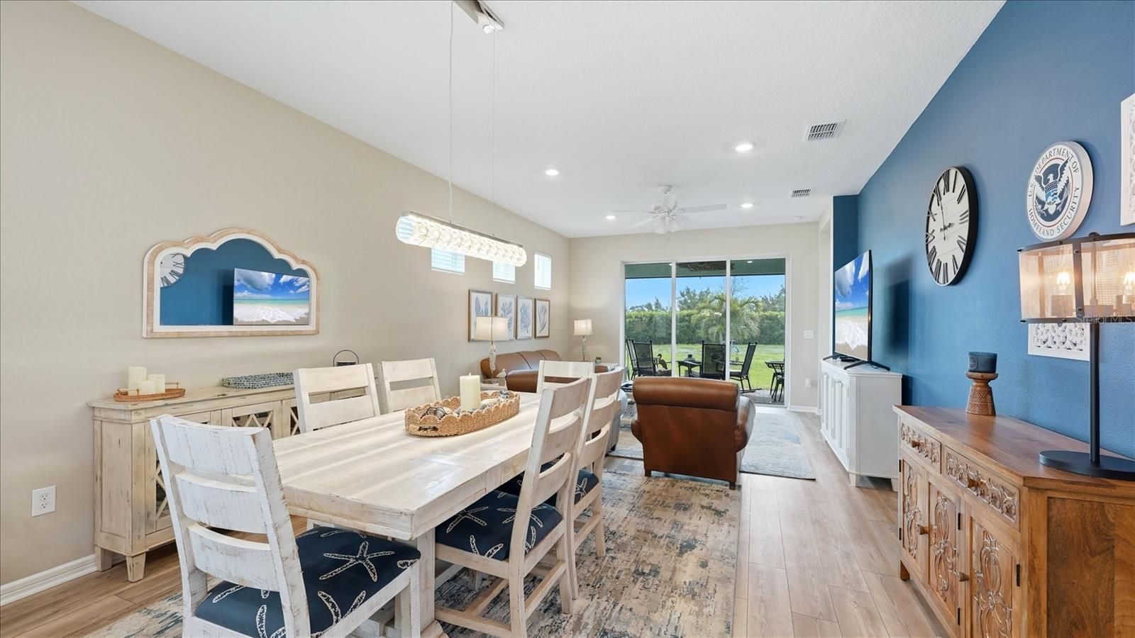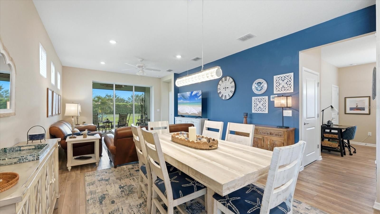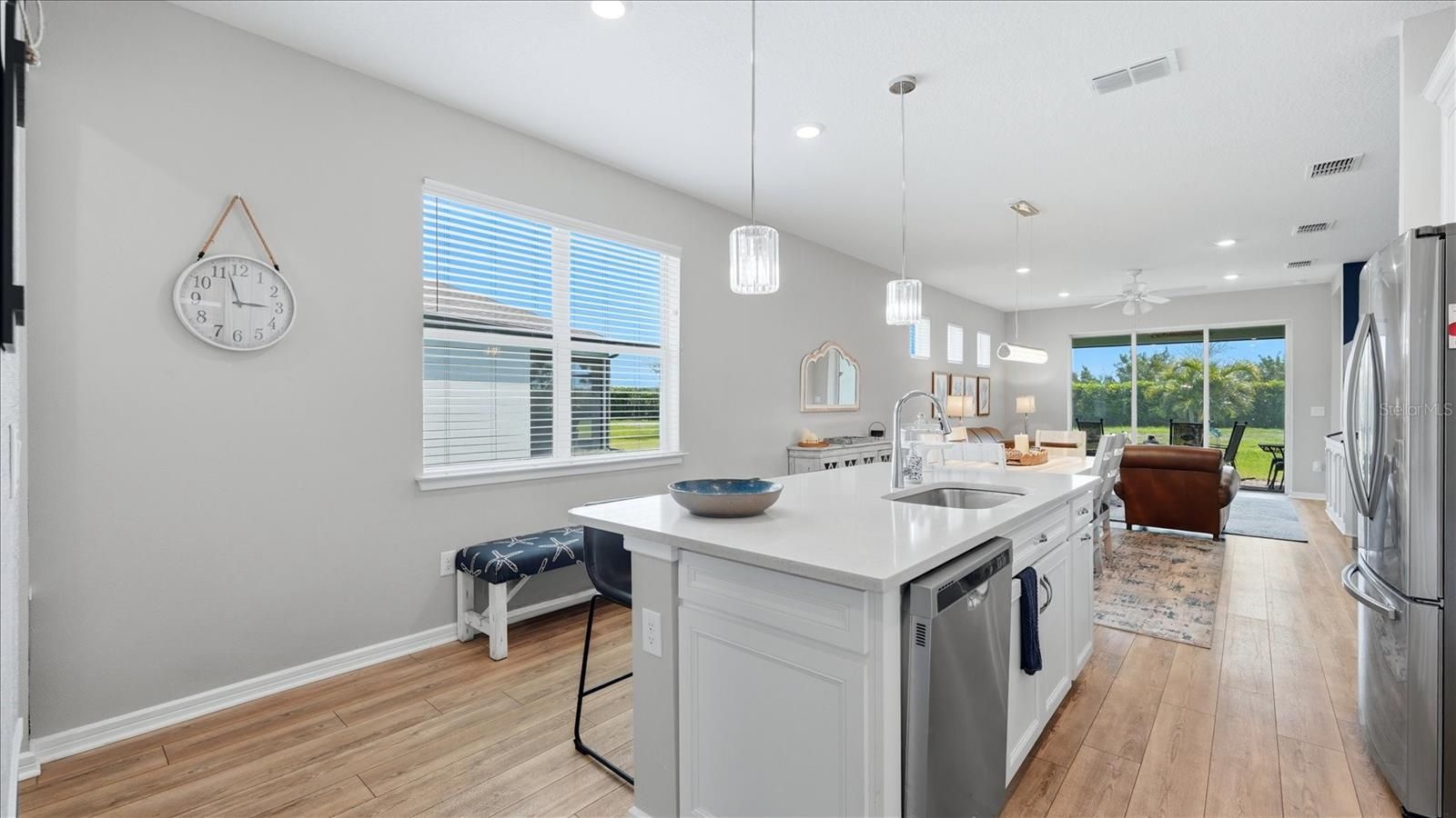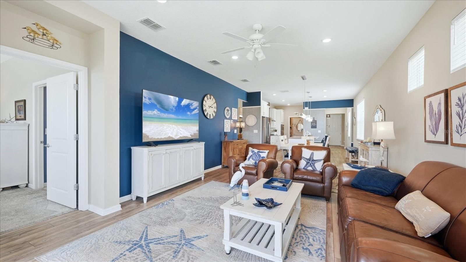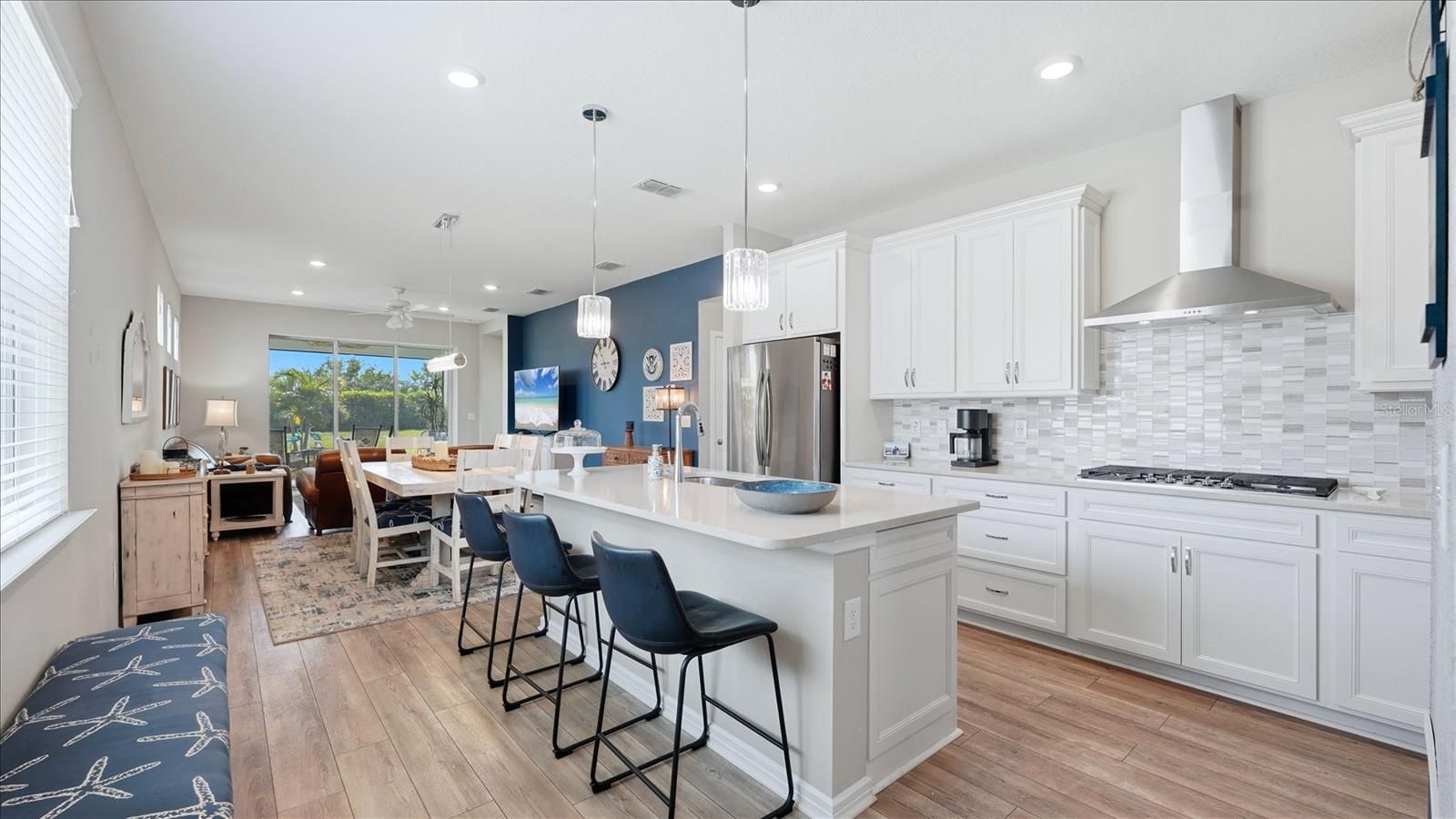 Sited near the end of a cul-de-sac, this beautifully maintained home has been seasonally enjoyed and lovingly maintained. Originally decorated with a blue seaside cottage vibe, sellers have found a larger home in the community they love and have restored many areas to the original interior color. A chef’s kitchen with pull-out lower drawers is the heart of the home. The extended 4-foot garage provides space for two vehicles plus workshop or storage — a rare and valuable upgrade. Interior layout includes two split bedrooms, two full baths, and a versatile flex room currently used as a music room, plus excellent storage throughout. The sliders disappear completely, allowing the panoramic lanai screen to bring the outside in. The sellers are moving within the community to accommodate a Steinway piano, reflecting their love for the neighborhood and lifestyle. Motivated sellers have priced this home aggressively. Del Webb Bay View offers active lifestyle amenities, including pickleball, tennis, bocce, fitness center, community gardens, shuffleboard, two dog parks, and an on-site bar and grill. Golf cart-friendly! Convenient access to Tampa, St. Petersburg, and Sarasota airports, world-class beaches, shopping, and waterfront dining. HOA includes tree and grounds maintenance, cable TV, and internet. CDD is included in current tax amount. This home is NOT located in a flood zone.