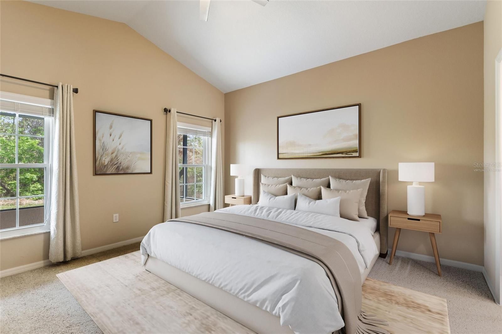 One or more photo(s) has been virtually staged. RidgeDale 2/2/Office model on Premium cul-de-sac Conservation lot has Newer Roof (replaced 1/2026) and 2-Car + Golf Cart garage. Under-roof East-facing screened-lanai spans the entire back of the house and has a 220 volt line. Double-hung replacement windows (2018) and preferred bay window front elevation. Brick paver driveway, walkway to front entry with full-view storm door and walkway to screened lanai. 12 FT ceiling in central great room and a wall of patio doors to lanai. Luxury vinyl plank floor in eat-in kitchen with vaulted ceiling, 42" solid wood cabinets with under-lighting, tile backsplash, solid surface breakfast bar, counter tops and built in desk. Cathedral ceiling in primary en suite bedroom with 6x6 walk-in closet, solid surface vanity with seamless sinks, linen closet, soaking tub and separate shower with bench seat. Guest bedroom has nearby full bath and linen closet. Daylight privacy film on many window. 2-car garage with separate golf cart bay has electric roll-down screen on double door, overhead storage, built in cabinets, work bench, pull-down ladder access to attic with some plank flooring for storage. Well for irrigation. Roof (2026); Water Heater (2022); HVAC (2022). Sold As-Is. $230 monthly High Vista HOA fee includes Spectrum internet and basic cable TV with 2 cable boxes, lawn mowing and exclusive access to resident-owned 12,000 SF private High Vista clubhouse and amenities. $425 semi-annual Ridgewood Lakes HOA fee provides 24x7 staffed security gate and master association-owned private road maintenance. Adjacent to 18-hole White Heron Golf Club with The Nest restaurant, privately owned and open to the public. High Vista is a 55+ community with outdoor heated pool and spa, fitness center, library, pub & many organized activities. Pickle ball, tennis, bocce and shuffleboard courts. Miles of biking and walking trails within Ridgewood Lakes gated community. Shopping, Disney, Universal, Orlando & Central FL entertainment nearby, easy access to I-4, medical facilities, airports & Sunrail Station. Advent Health hospital is 3 miles away.