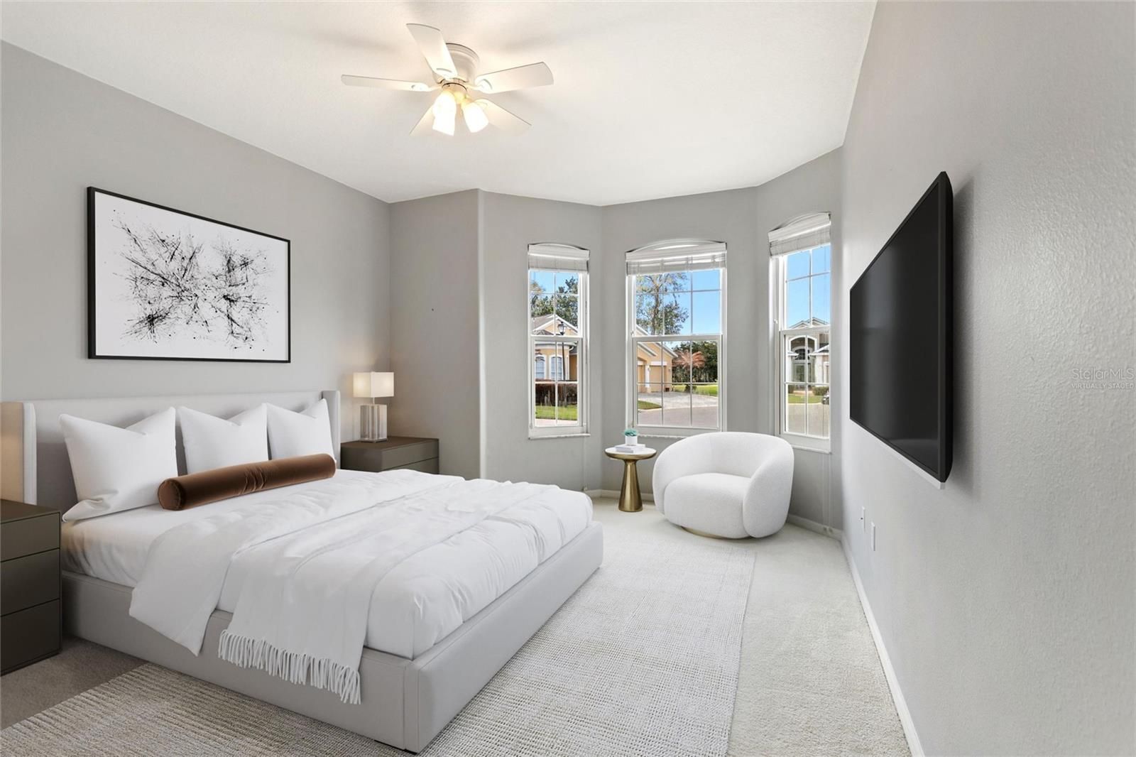 - Ceiling Fan(s), Chair Rail, Eat-in Kitchen, High Ceilings, Main Level Primary, Solid Surface Counters, Solid-Wood Cabinets, Split Bedrooms, Thermostat, Walk-In Closet(s), Window Treatments