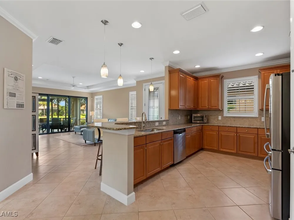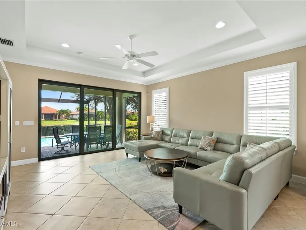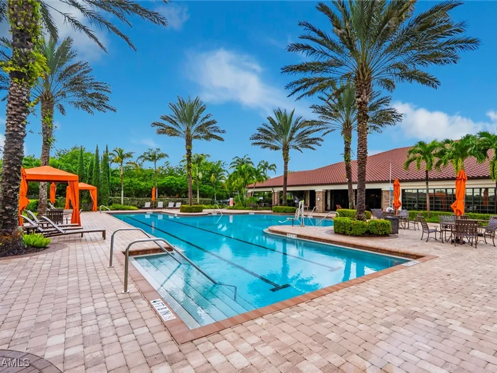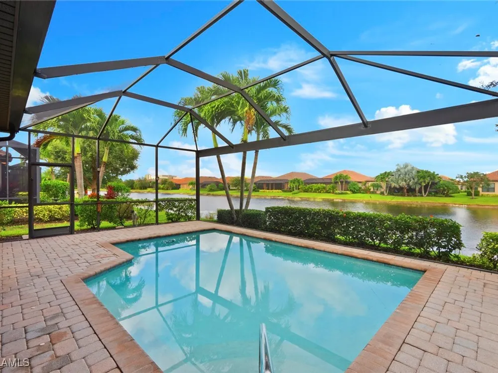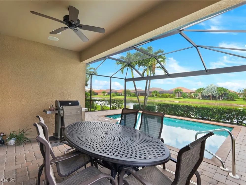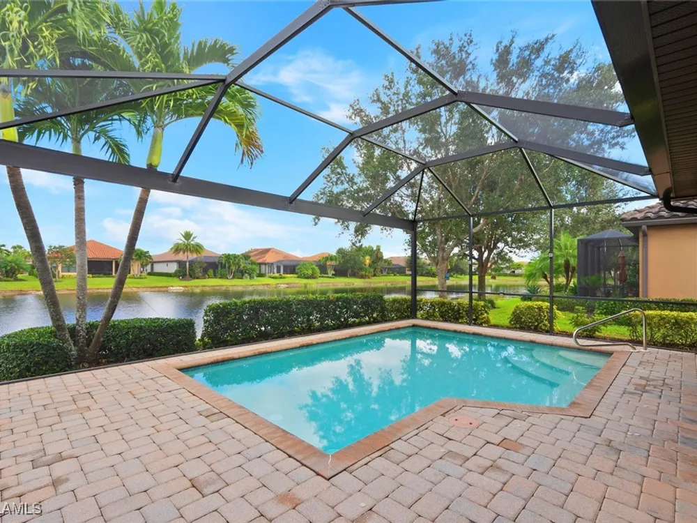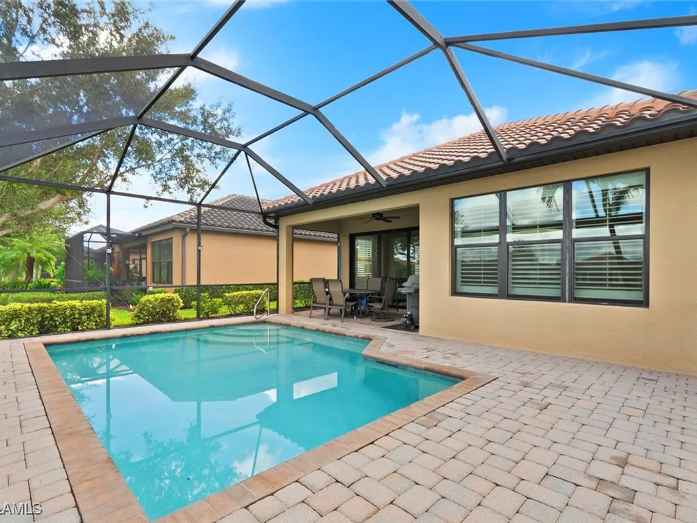 Welcome to your serene Naples retreat! This beautifully turn-key furnished 3-bedroom + den, 2-bath single-family home offers captivating lake and pool views the moment you step inside, setting the tone for relaxed, resort-style living. Enjoy indoor-outdoor living year-round with a spacious, covered lanai featuring a natural gas grill, perfect for cookouts and entertaining. The private pool and tranquil water views create your personal oasis in one of Naples’ most sought-after gated communities. Inside, you’ll love the elegant finishes including 10-foot ceilings, tray ceilings with recessed lighting, and custom crown molding throughout. IMPACT GLASS & DOORS! The gourmet kitchen is a chef’s dream with granite countertops, pantry, newer stainless-steel appliances, and a gas range. Host dinner parties in the adjacent formal dining room! The owner’s suite features tranquil lake views, a walk-in shower with a glass enclosure, double sinks on a granite vanity, and a huge walk-in closet! The split-bedroom layout provides privacy and includes two guest bedrooms with a large bath with double sinks on a granite vanity. The flexible den/home office with French doors provides quiet workspace or additional room for guests. The laundry room features granite countertops, and newer washer and dryer (2-year-old.) A/C and water heater are also 2 years old. Gas-powered pool heater, range, and outdoor grill. The spacious 2-car garage offers plenty of storage. The Esplanade at Hacienda Lakes offers resort-style amenities with a clubhouse hosting planned social events, a state-of-the-art fitness center, a heated resort-style pool and spa with cabanas, a fire pit, tennis and lighted pickleball courts, a playground and a dog park. Ideally located just minutes to Naples iconic 5th Avenue & Third Street with world-class restaurants, shopping and beaches. Or a short drive to the beautiful beaches of Marco Island and the fantastic island restaurants of Marco and Isles of Capri! The Esplanade is NOT in a flood zone!