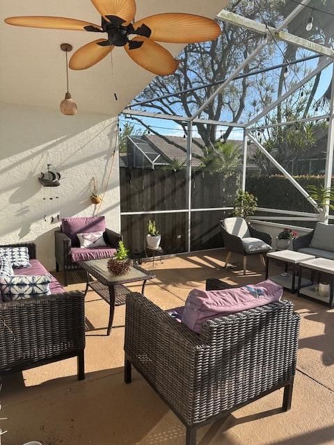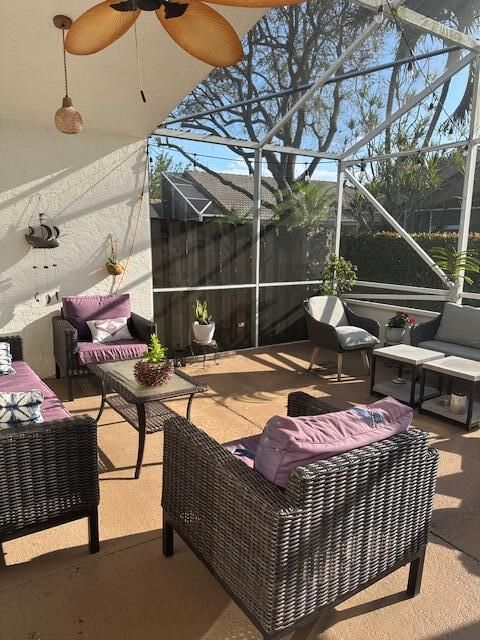 Stunning and upgraded 4BR/2BA Napoli model in highly sought-after Venetian Isles, one of Boynton Beach's premier resort-style active adult communities. This move-in-ready home features a desirable split-bedroom floor plan, ideal for privacy when hosting family and guests. Enjoy private outdoor living on the extended screened lanai, surrounded by lush tropical landscaping and designer rock accents, creating a serene, relaxing setting perfect for entertaining or quiet evenings at home. The home showcases numerous high-end upgrades, including tile flooring throughout, accordion hurricane shutters for full storm protection, designer paint, custom window treatments, upgraded lighting, ceiling fans, and recessed high-hat lighting. The open-concept living and family room features a custom designer entertainment wall with built-in shelving and storage drawers, creating a stylish focal point and functional media space. The gourmet kitchen with dining area offers stainless steel appliances, including a convection oven, granite countertops, and a full glass tile backsplash. The luxury primary suite features crown molding, a walk-in closet with built-ins plus an additional closet, and a spa-inspired primary bath with dual sinks, quartz countertops, upgraded cabinetry, frameless glass shower, and a separate soaking tub. Additional highlights include a media/game room with built-in Bose surround sound speakers, upgraded garage flooring with extra storage, and a spacious laundry room with sink, cabinetry, and shelving. Residents of Venetian Isles enjoy a resort-style lifestyle with a brand-new state-of-the-art clubhouse featuring a fitness center, resort pool and spa, restaurant and bar, social hall, billiards room, pickleball courts, tennis courts, bocce courts, card rooms, library, and a full calendar of social activities and events. The 24-hour guard-gated community offers peace of mind, and HOA dues include lawn care, basic cable, maintenance of common areas, and full access to all community amenities. Ideally located just minutes from shopping, dining, golf courses, parks, beaches, boating, hospitals, medical facilities, Palm Beach International Airport, and the Florida Turnpike, making it perfect for a full-time residence or seasonal retreat. *Capital contribution of $6,730 to be paid by the buyer at closing.