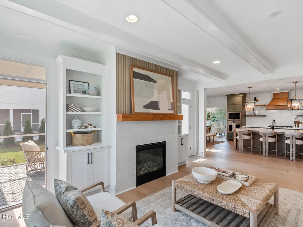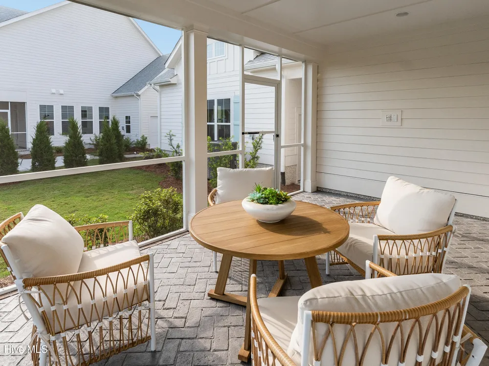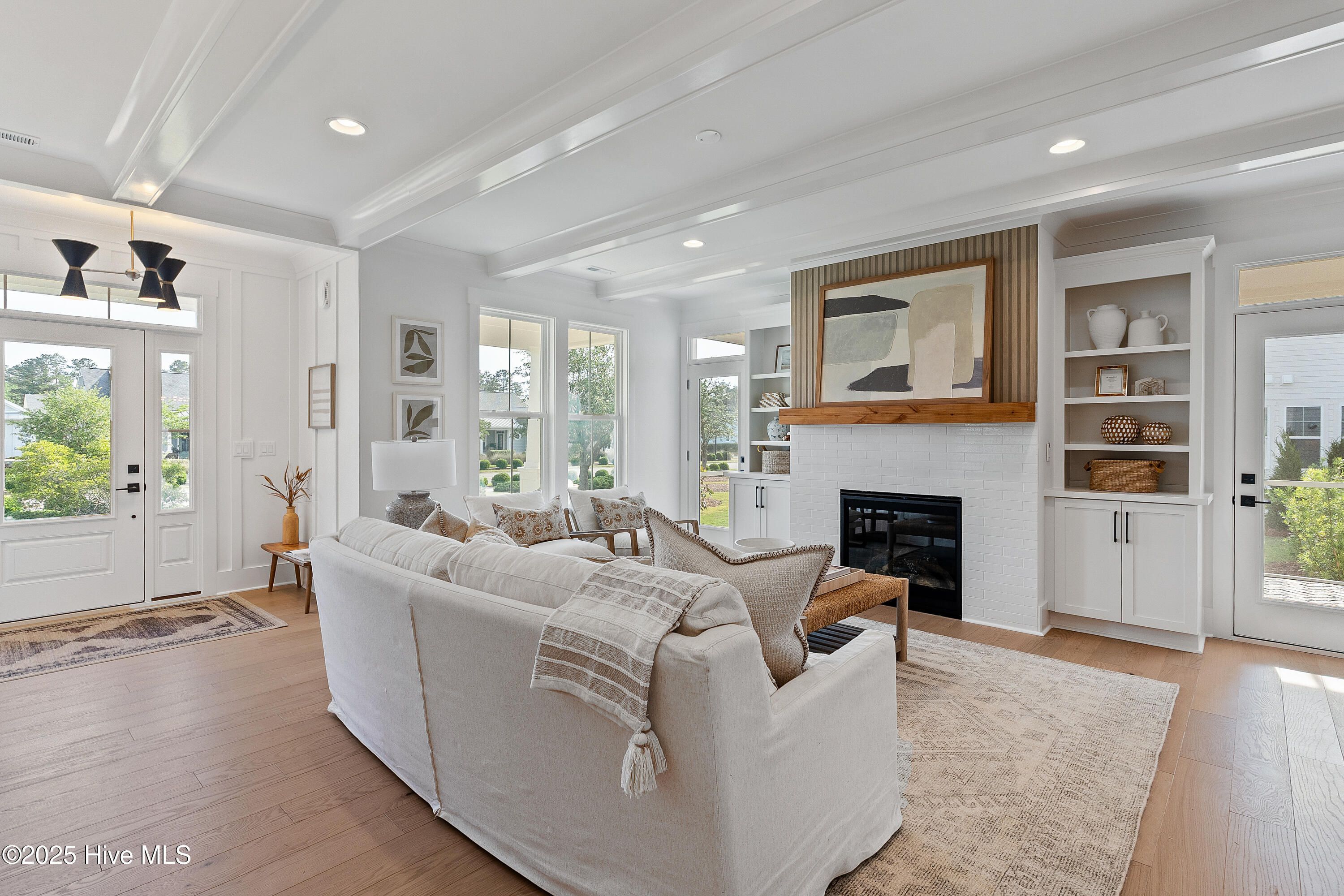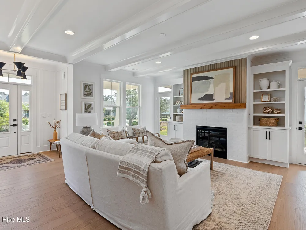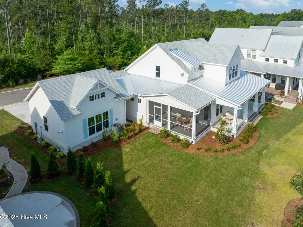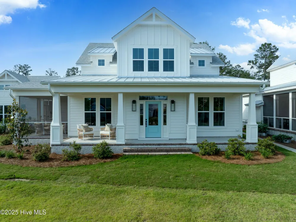 Legacy Homes by Bill Clark presents a custom spin on the Hayden plan in the charming Meadow Park at Brunswick Forest. The curb appeal is top notch with the expansive front porch and spacious side screen porch. The Hayden plan is thoughtfully designed with 3 bedrooms, 3 bathrooms, sunroom, flex room, and gathering space. The great room features exposed beams with built-ins flanking the fireplace and doors leading out to the screened in porch. The kitchen is perfect for entertaining with gorgeous quartz countertops, 36'' gas cooktop, built-in wall oven and microwave, french door refrigerator, Electrolux wine cooler, and walk in pantry. The primary bedroom features a coffered ceiling and dual walk-in closets. The oversized laundry room includes cabinets for additional storage, a large undermount sink, beautiful soapstone countertops, and an upgraded mosaic backsplash. The Hayden offers many upgraded finishes throughout including a unique herringbone design in the foyer hardwoods, custom white wood shelving in all closets, floor to ceiling wainscoting in various locations, glass pocket doors to the sunroom, wood stair treads leading to the bonus room, metal roof on the front porch, a tankless hot water heater, and many more!