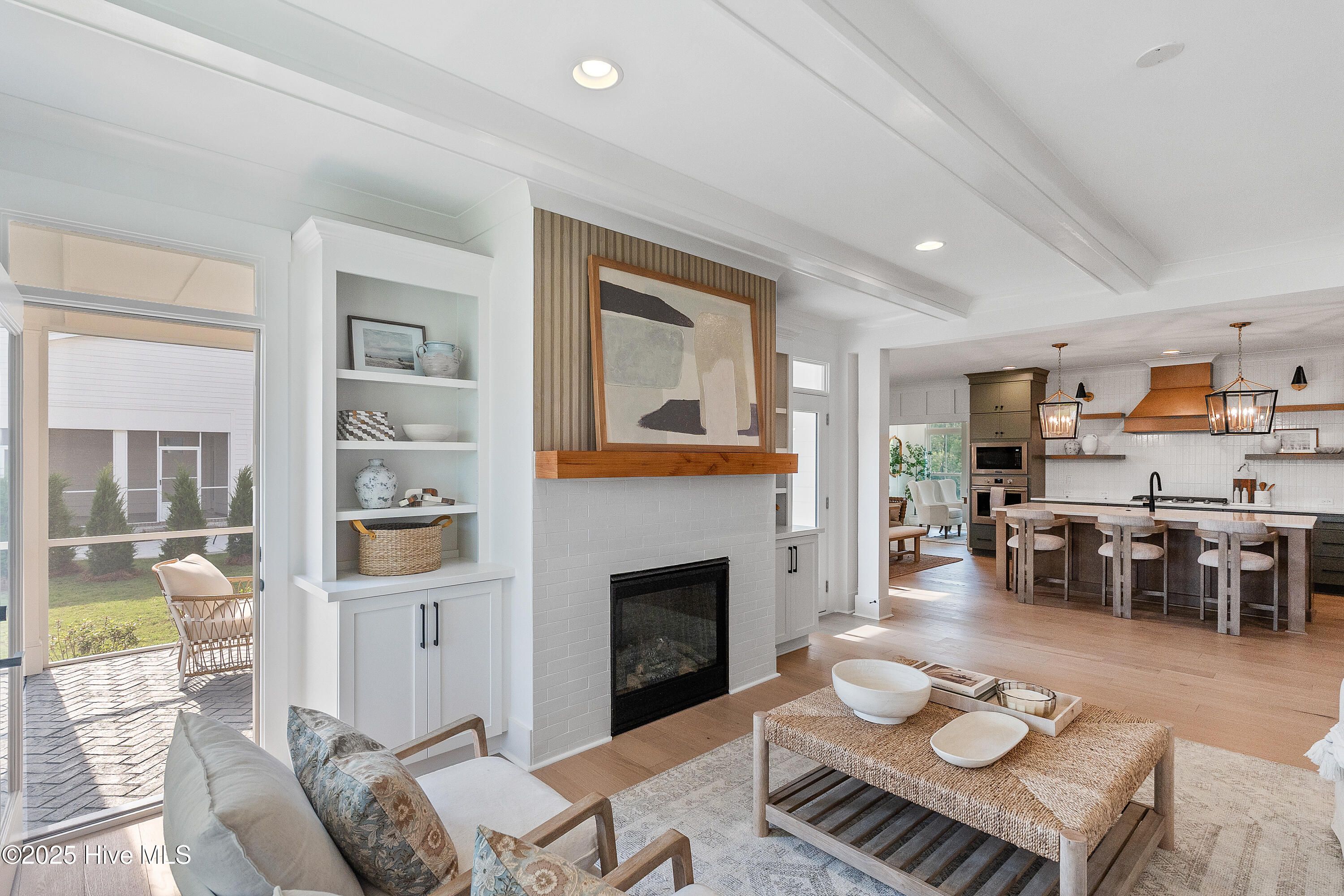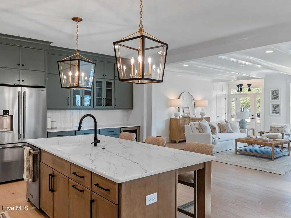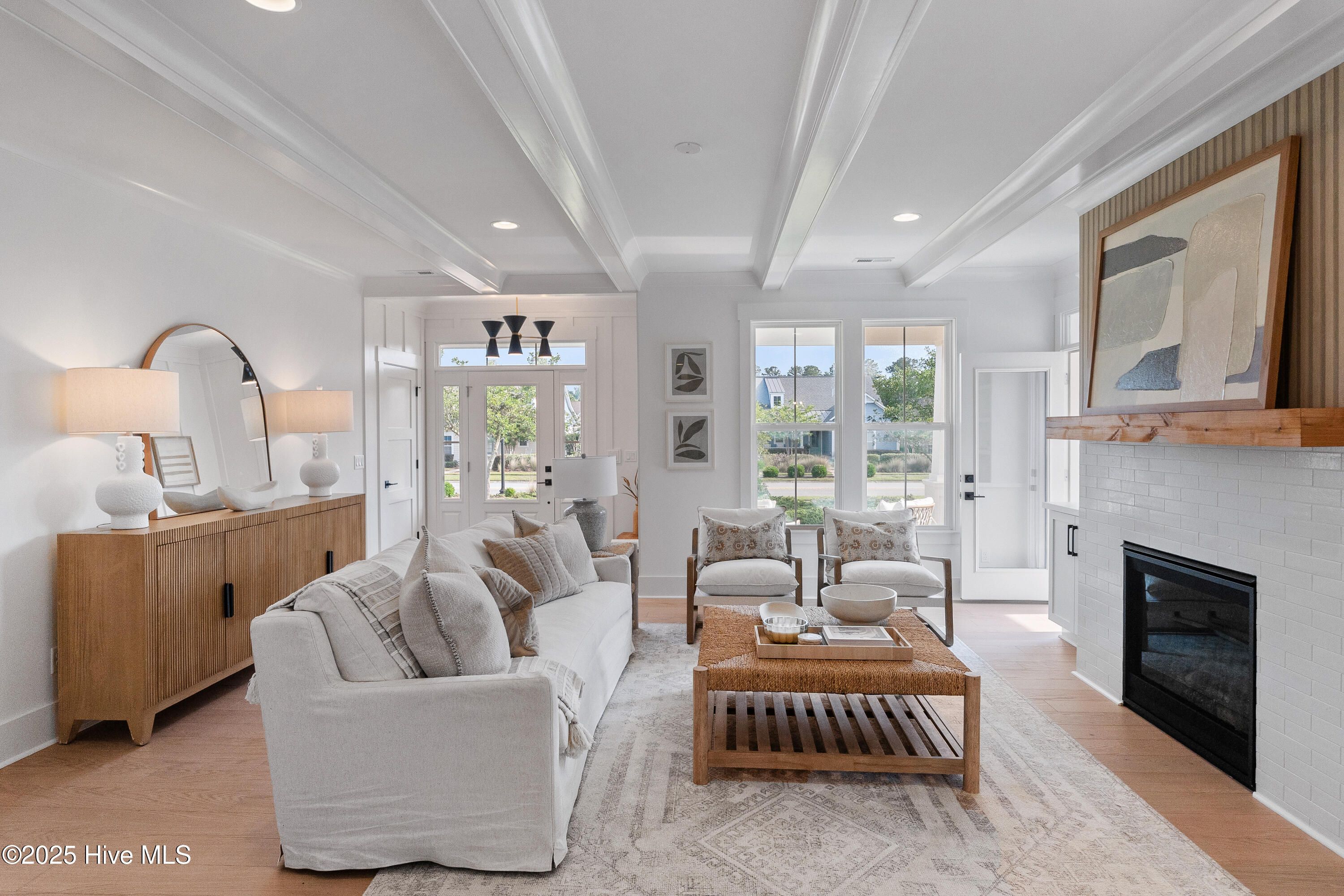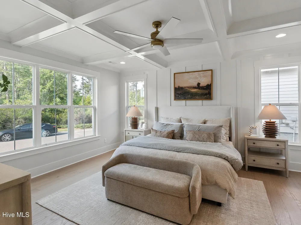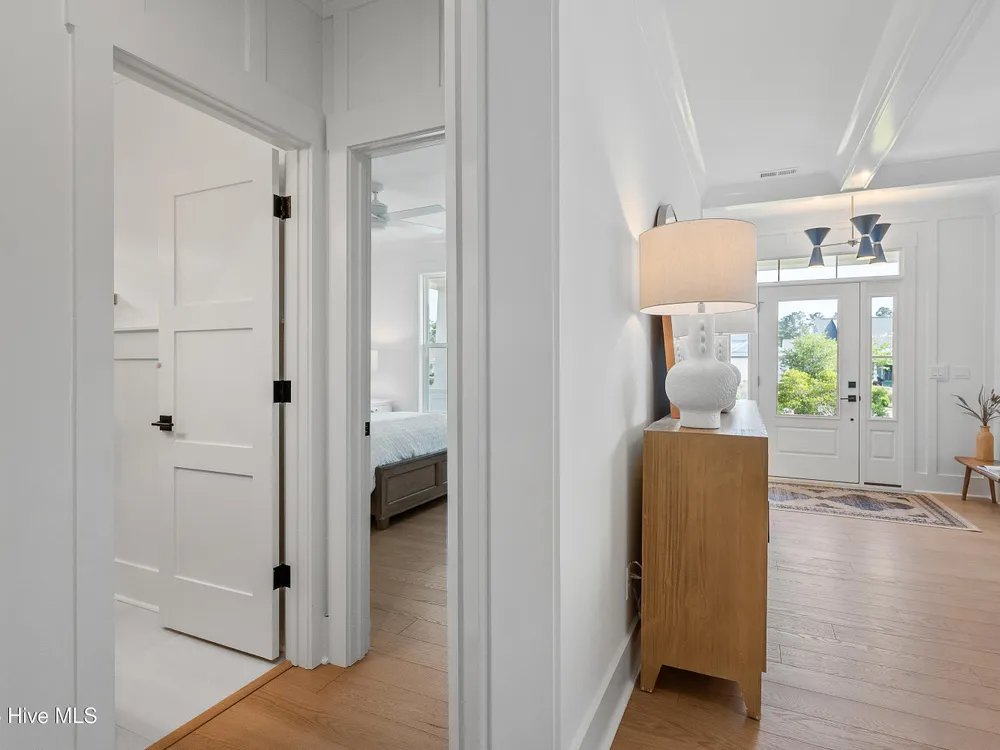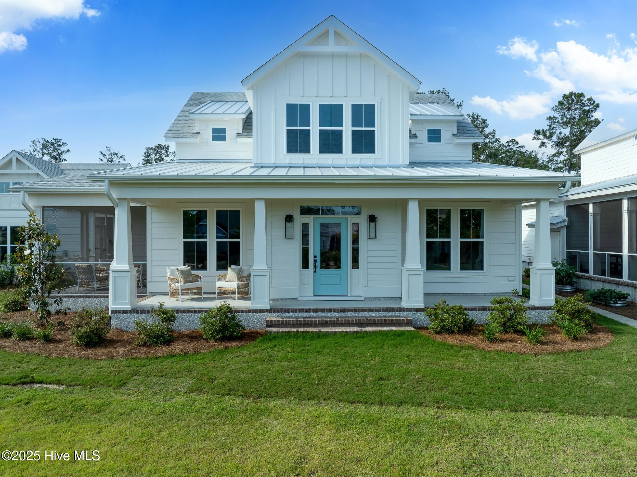 Legacy Homes by Bill Clark presents a custom spin on the Hayden plan in the charming Meadow Park at Brunswick Forest. The curb appeal is top notch with the expansive front porch and spacious side screen porch. The Hayden plan is thoughtfully designed with 3 bedrooms, 3 bathrooms, sunroom, flex room, and gathering space. The great room features exposed beams with built-ins flanking the fireplace and doors leading out to the screened in porch. The kitchen is perfect for entertaining with gorgeous quartz countertops, 36'' gas cooktop, built-in wall oven and microwave, french door refrigerator, Electrolux wine cooler, and walk in pantry. The primary bedroom features a coffered ceiling and dual walk-in closets. The oversized laundry room includes cabinets for additional storage, a large undermount sink, beautiful soapstone countertops, and an upgraded mosaic backsplash. The Hayden offers many upgraded finishes throughout including a unique herringbone design in the foyer hardwoods, custom white wood shelving in all closets, floor to ceiling wainscoting in various locations, glass pocket doors to the sunroom, wood stair treads leading to the bonus room, metal roof on the front porch, a tankless hot water heater, and many more!