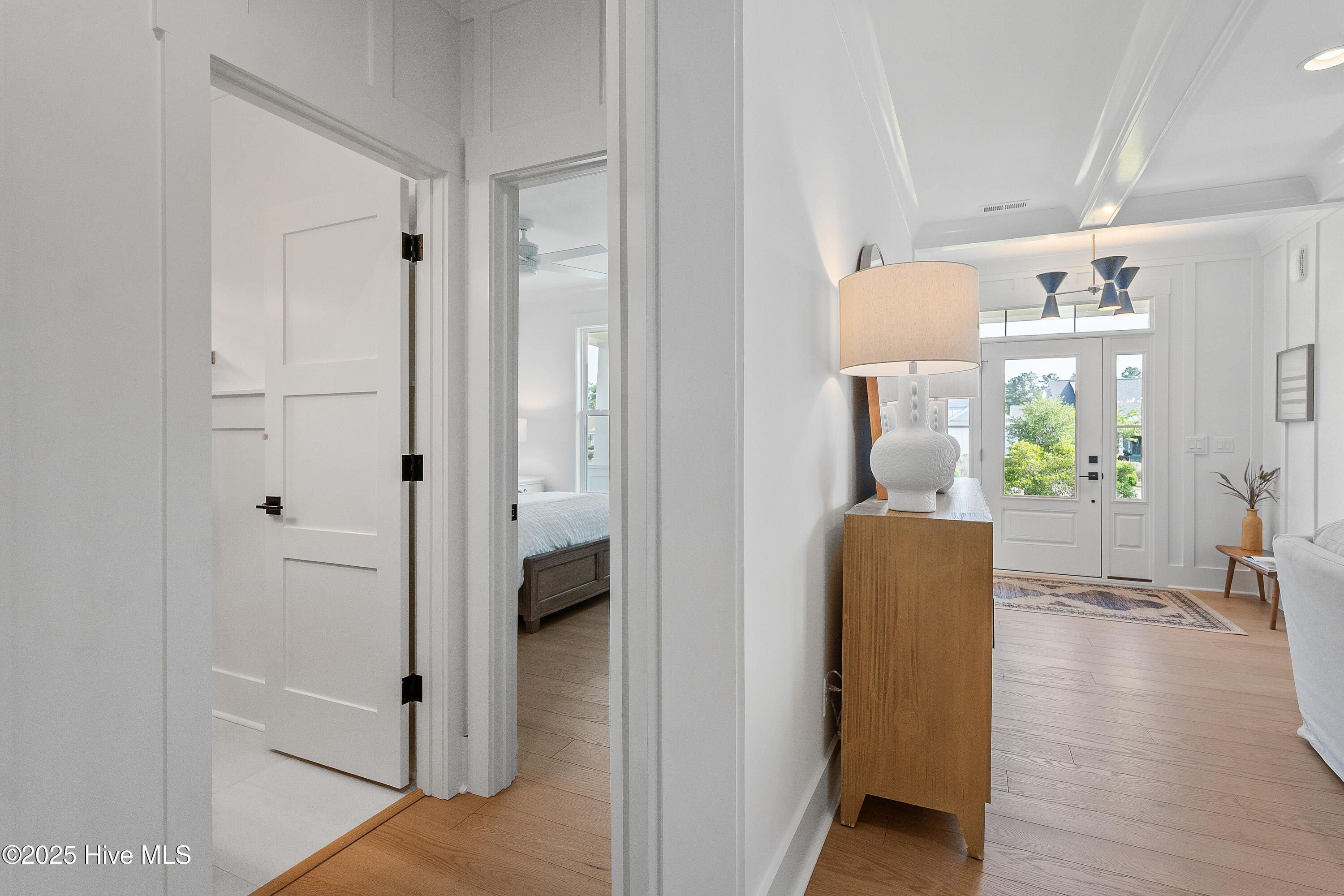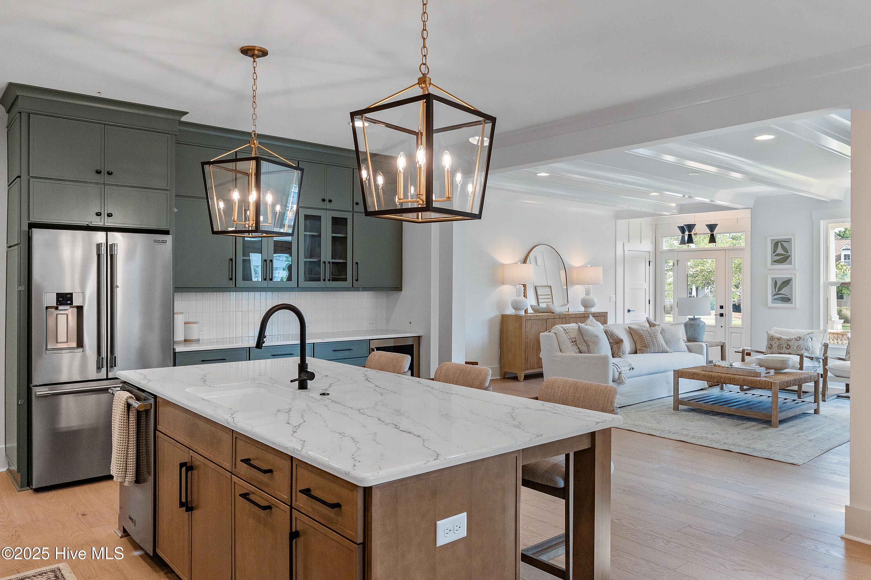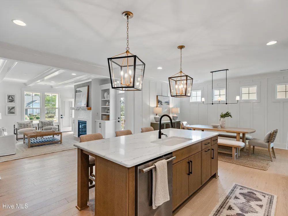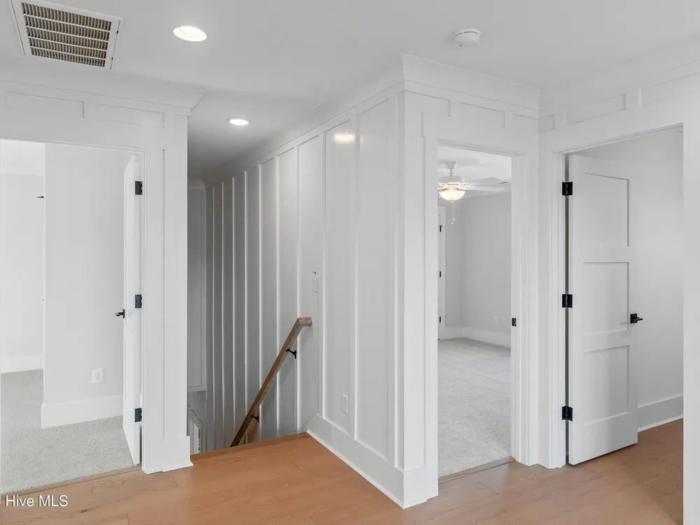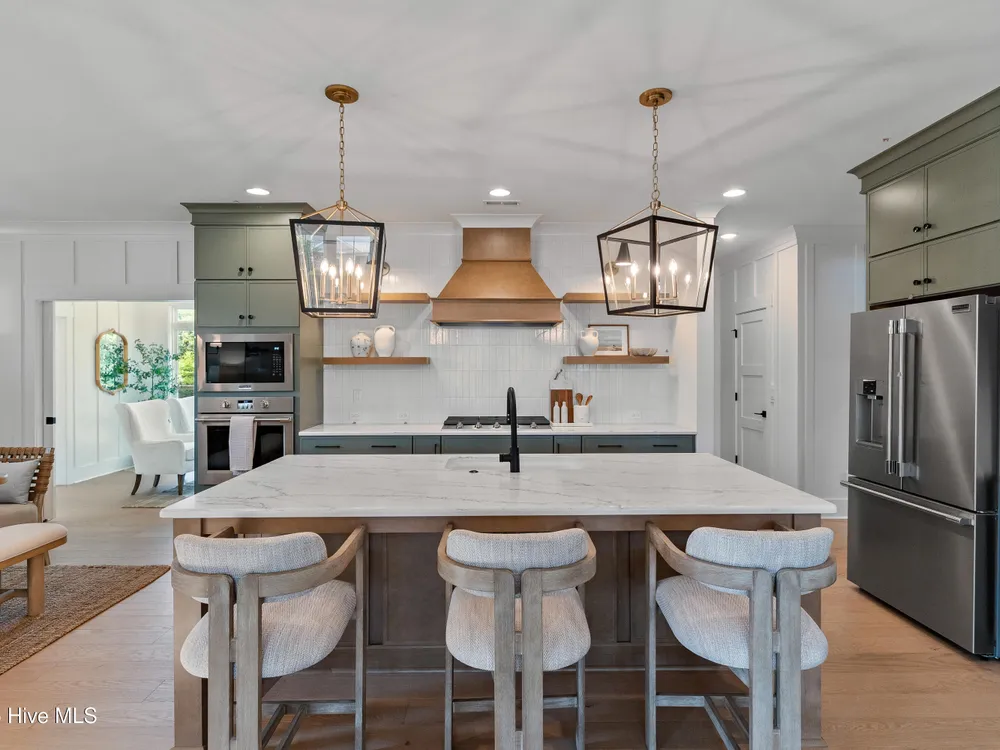 Legacy Homes by Bill Clark presents a custom spin on the Hayden plan in the charming Meadow Park at Brunswick Forest. The curb appeal is top notch with the expansive front porch and spacious side screen porch. The Hayden plan is thoughtfully designed with 3 bedrooms, 3 bathrooms, sunroom, flex room, and gathering space. The great room features exposed beams with built-ins flanking the fireplace and doors leading out to the screened in porch. The kitchen is perfect for entertaining with gorgeous quartz countertops, 36'' gas cooktop, built-in wall oven and microwave, french door refrigerator, Electrolux wine cooler, and walk in pantry. The primary bedroom features a coffered ceiling and dual walk-in closets. The oversized laundry room includes cabinets for additional storage, a large undermount sink, beautiful soapstone countertops, and an upgraded mosaic backsplash. The Hayden offers many upgraded finishes throughout including a unique herringbone design in the foyer hardwoods, custom white wood shelving in all closets, floor to ceiling wainscoting in various locations, glass pocket doors to the sunroom, wood stair treads leading to the bonus room, metal roof on the front porch, a tankless hot water heater, and many more!