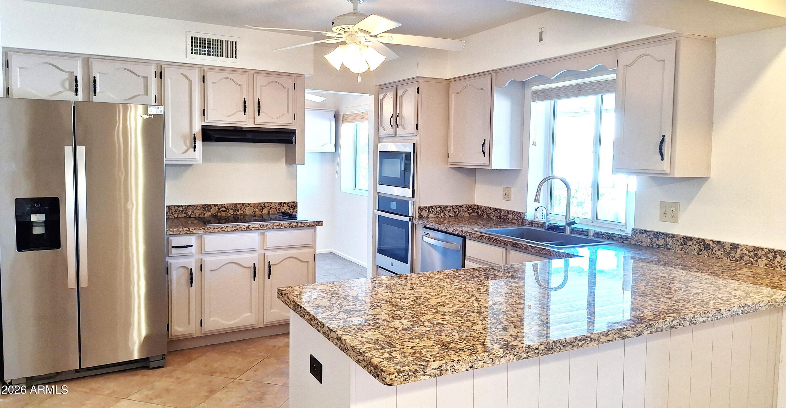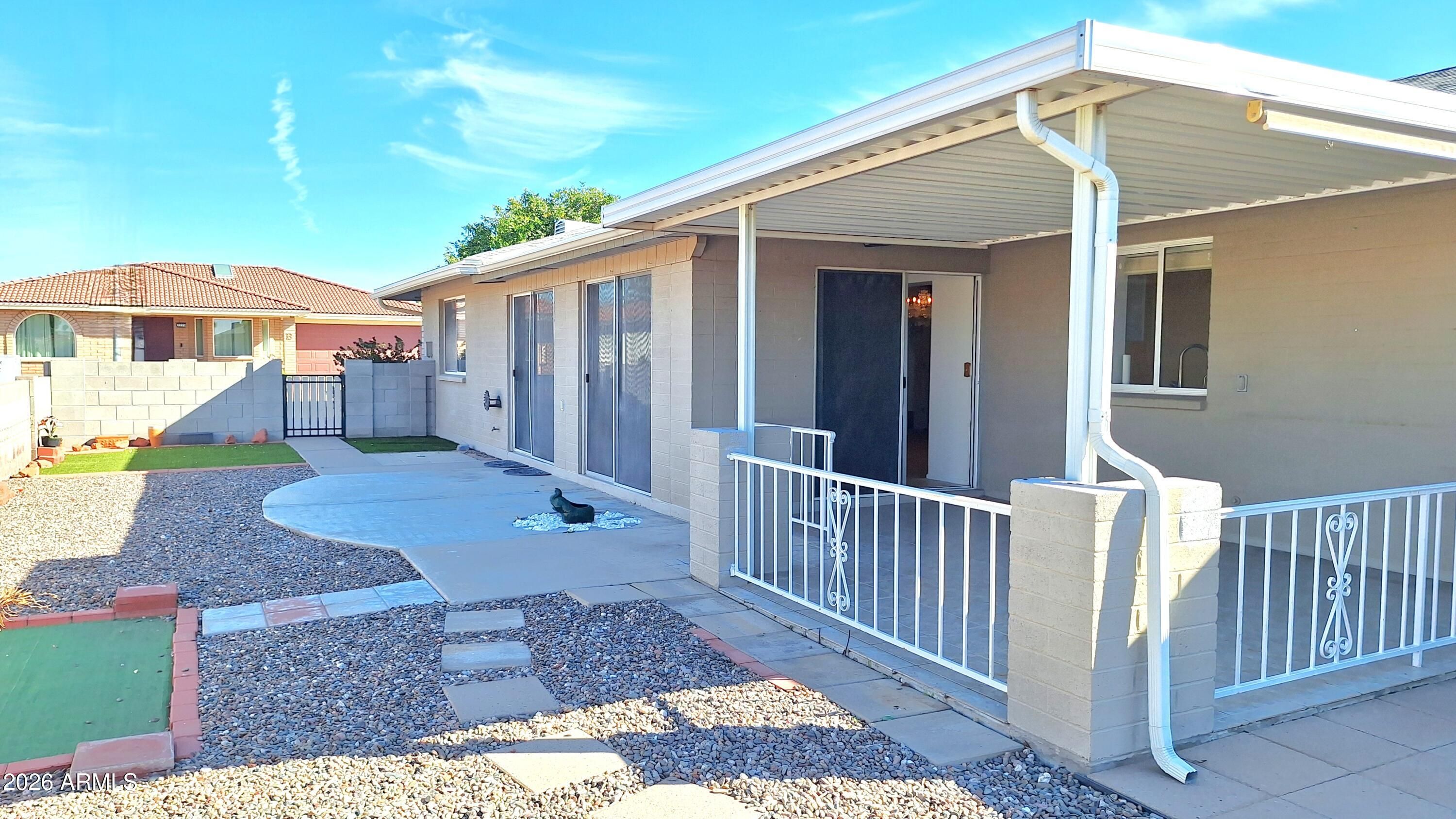 This gorgeous corner-lot is a rare find, offering three bedrooms and beautiful curb appeal. A large covered, tiled front patio welcomes you into a spacious living room featuring diagonally laid tile flooring. The upgraded, open-concept kitchen shows lots of raised-panel cabinets, granite countertops, a breakfast bar, stainless steel appliances, a flat-top stove, and a large pantry. The master bedroom and second bedroom feature new carpeting and beautiful tiled showers. A spacious tiled Arizona room with central heating and air conditioning provides versatile living space, ideal for a family room or entertaining area. The backyard includes a large covered patio with tiled flooring, low-maintenance synthetic turf, and is fully enclosed by a block wall. Additional upgrades include the roof air conditioning and heating systems, hot water heater, and more.
