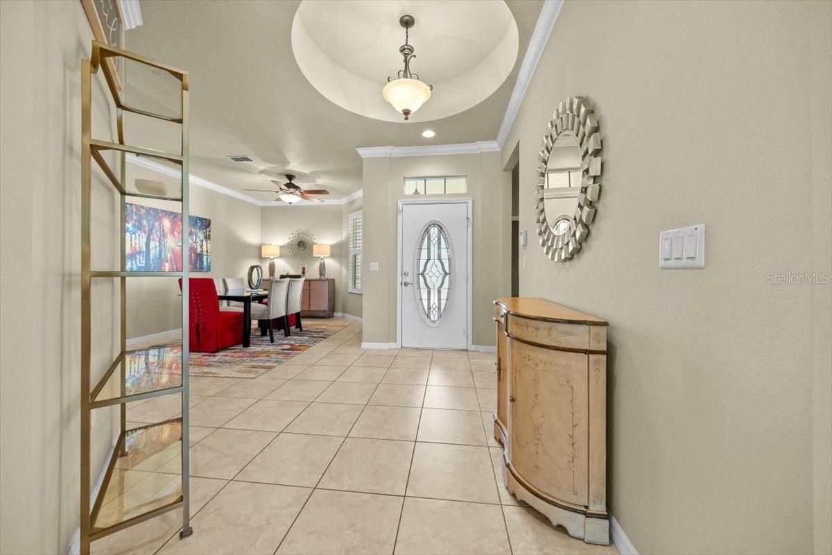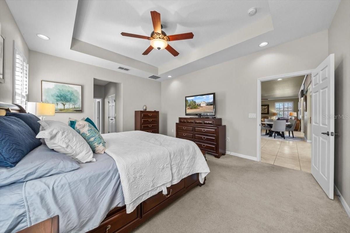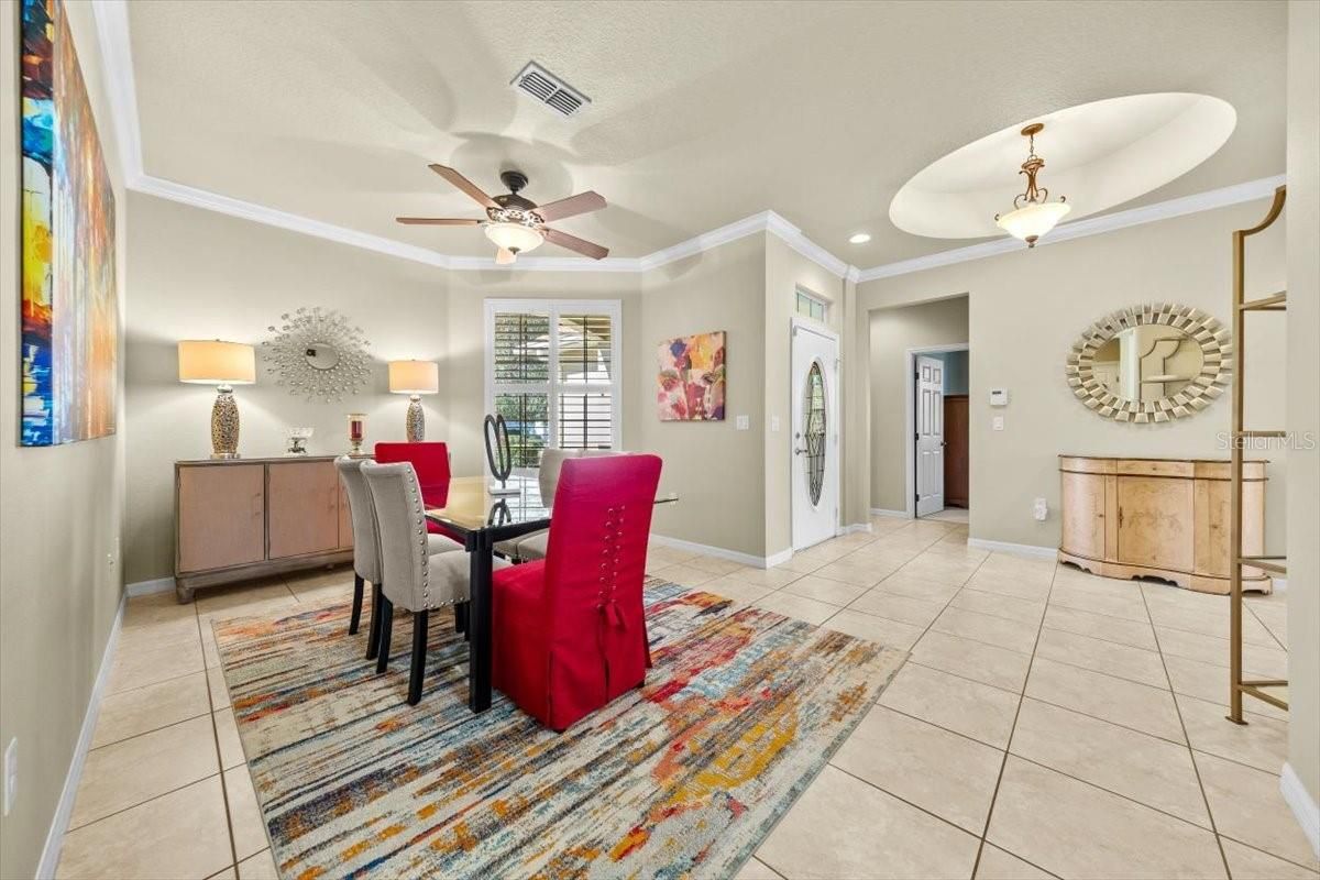 - Attic Ventilator, Ceiling Fan(s), Crown Molding, Eat-in Kitchen, High Ceilings, Open Floorplan, Main Level Primary, Solid Surface Counters, Solid-Wood Cabinets, Split Bedrooms, Tray Ceiling(s), Walk-In Closet(s), Window Treatments