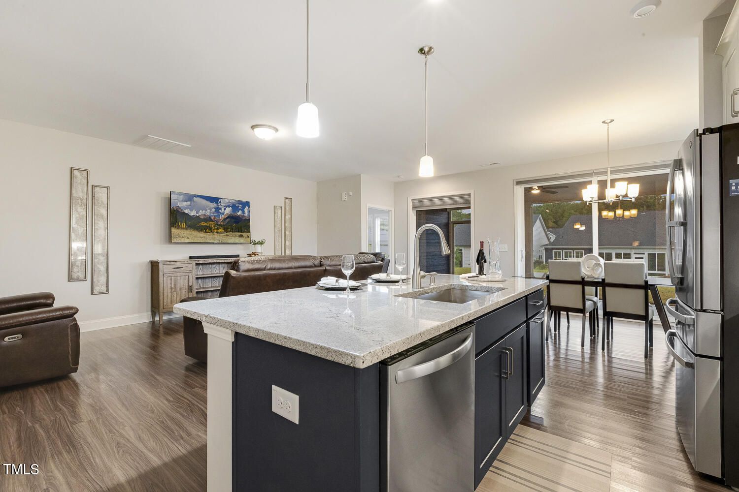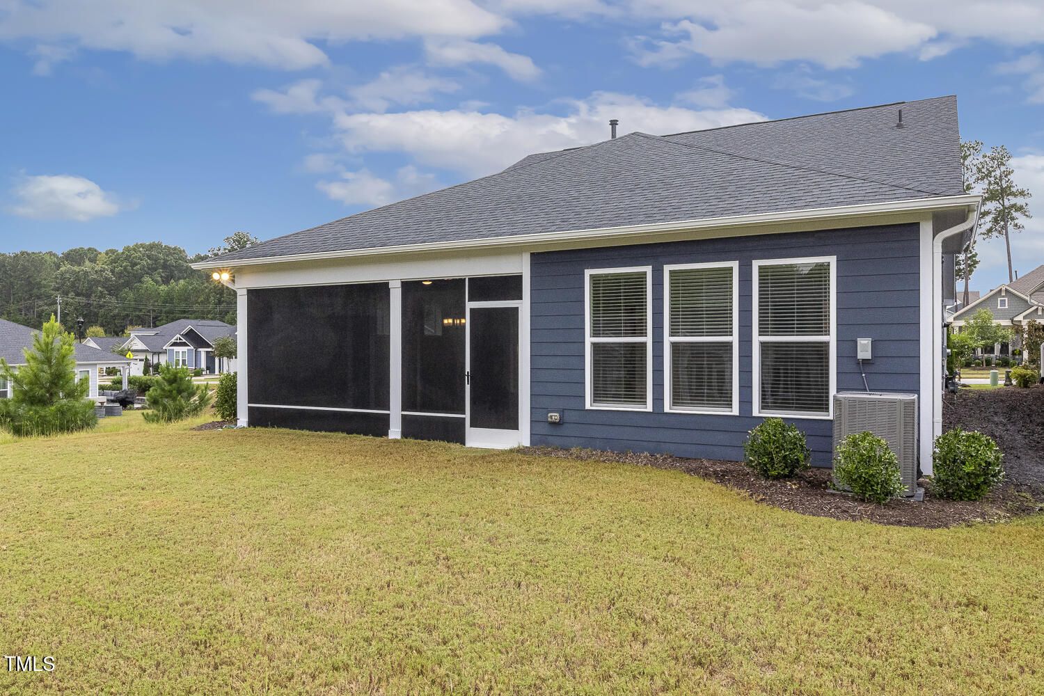 Enjoy low-maintenance living in the coveted Encore 55+ section of Wendell Falls! Built in 2021 by David Weekley, this Wake floorplan offers 3 bedrooms, 3 full baths, a private study with French doors, and a spacious second-floor loft with guest suite and abundant walk-in storage. The open concept design features a bright great room, dining area, and gourmet kitchen with granite countertops, stainless steel appliances, gas range, large single-bowl sink, extra recessed lighting, and a generous island ideal for gathering. The first-floor owner's retreat includes a spa-like bath with a zero-entry shower, double sink quartz vanity and a walk-in closet that connects directly to the laundry room for everyday convenience. An additional downstairs & upstairs guest suite add even more flexibility. Relax on your screened porch with privacy screening (you can see out, they can't see in), overlooking your landscaped yard. This home is equipped with a tankless water heater, hyper-efficient R-8 HVAC ductwork, and beautiful laminate plank flooring that shines like new. Encore residents enjoy exclusive amenities—clubhouse, pickleball courts, pool, firepit seating, and a full calendar of social events—plus access to all of Wendell Falls' resort-style offerings. With lawn care included, you'll spend more time enjoying the lifestyle you've been waiting for.