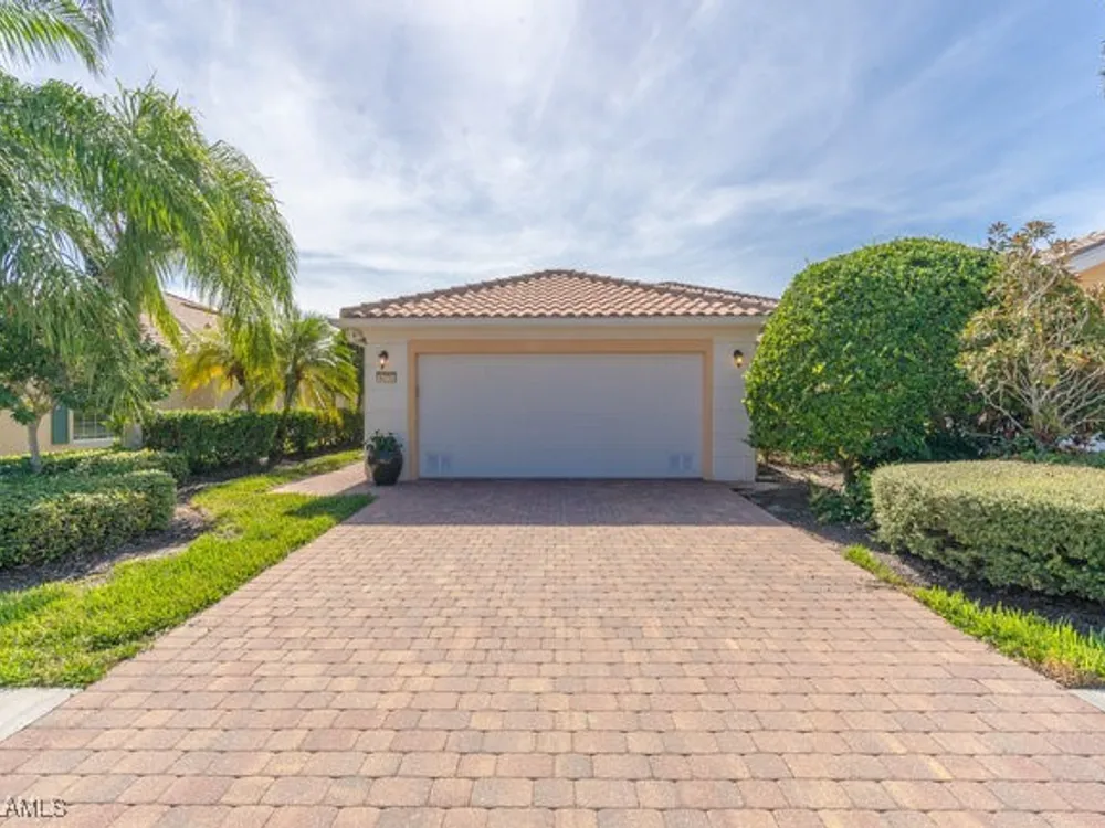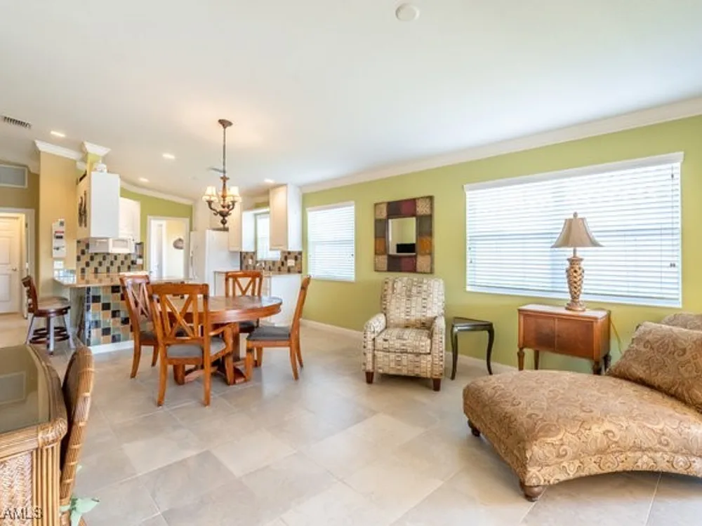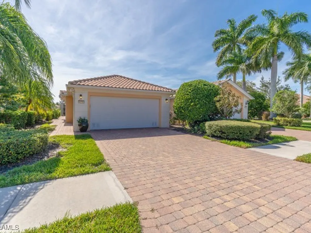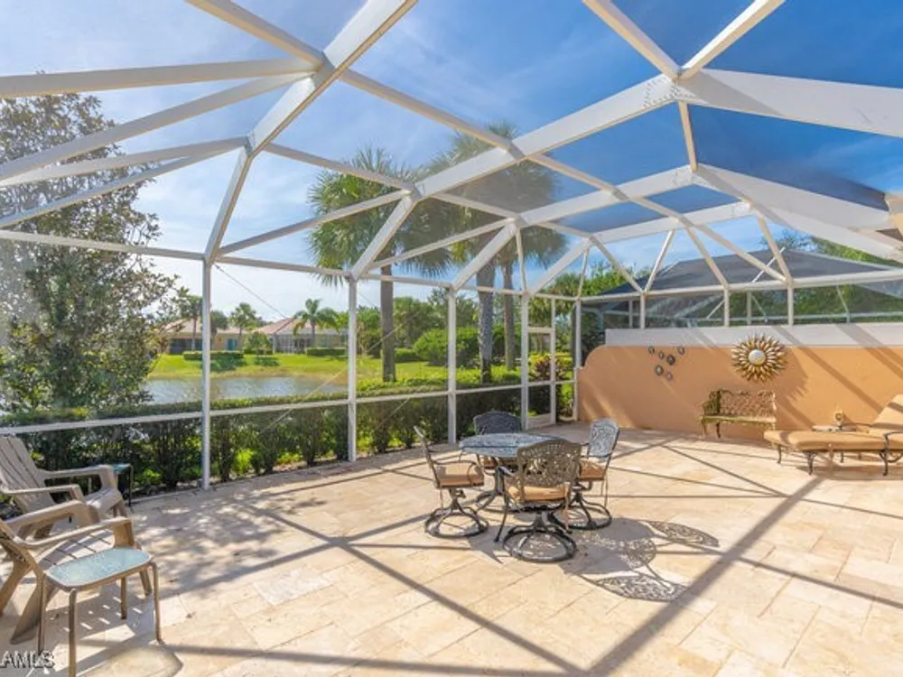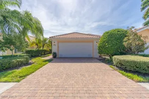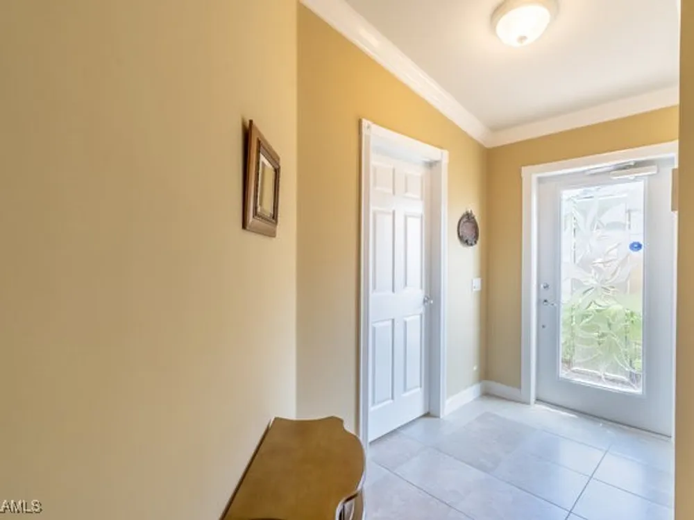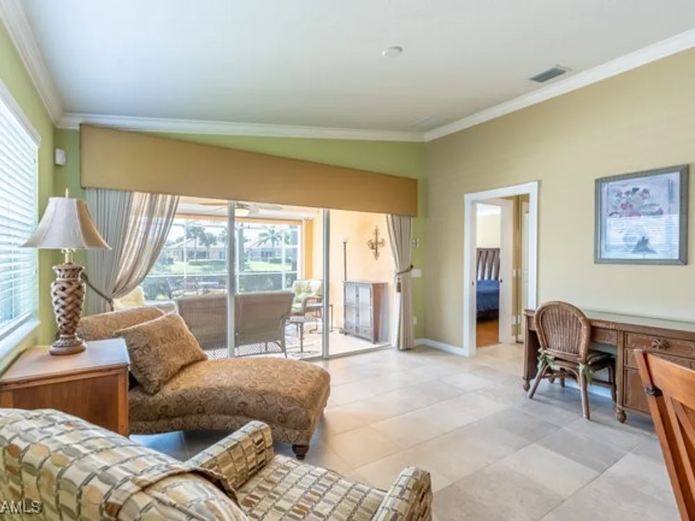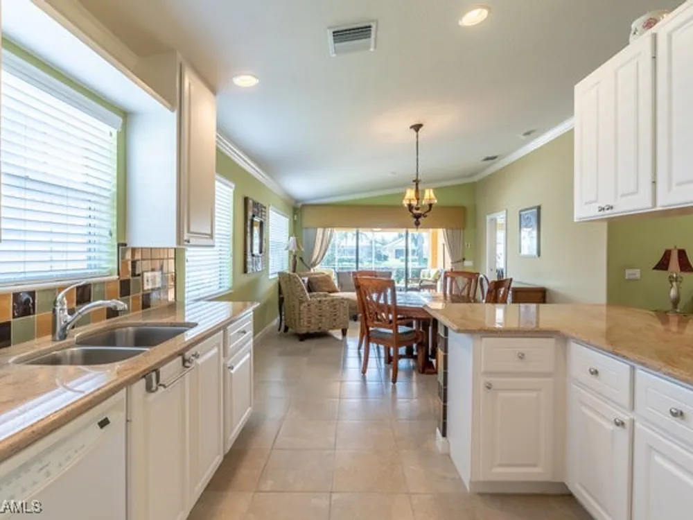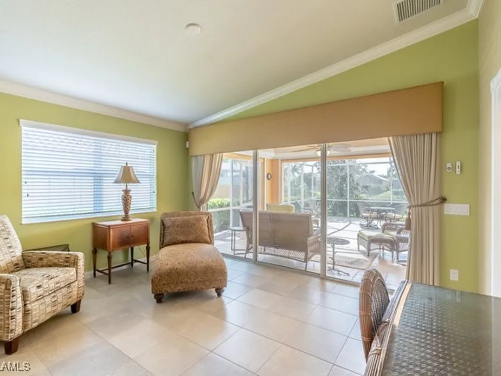 THIS HOME IS IN BEAUTIFUL CONDITION A MUST SEE TO HAVE THIS Two-bedroom with den/two bath Capri attached villa located in the gated community of Veronawalk. A full glass, decorative paned entry door opens into the unit that offers vaulted ceilings wrapped in crown molding. The contemporary, split floor plan places each bedroom and bath on opposite sides of the home to allow privacy when entertaining overnight guests. Tile floors are throughout the home, with the exception of wood in the bedrooms. A centrally located white kitchen offers an abundance of cabinetry. Rich colored granite counters and a colorful tile backsplash that matches the breakfast bar surround gives an added pop of color. There is a NEWER HOT WATERHEATER and A/C, REF,WASHER AND DRYER ETC units in place. A bank of sliding doors opens onto a lovely, covered lanai. Enjoy the water view from your extended, screen enclosed, travertine tiled patio. This home is storm ready with electric storm shutters on lanai and accordion shutters on rear master window. Being offered furnished, you could be moved in and enjoying the Naples lifestyle this coming season.