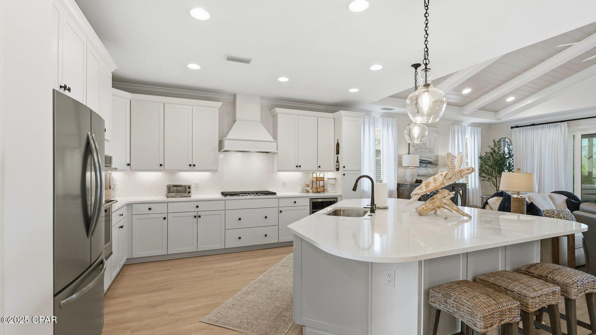This stunning Breeze Bay w/pool overlooking a preserve with neighboring pond views is a MUST SEE in the resort-style living community of Latitude Margaritaville Watersound, a 55+ & Better community nestled along the Intracoastal Waterway and just 7 miles from the sugary white sands of the Gulf of Mexico. Step inside this beautifully furnished, open-concept living home and discover sophistication, warmth and style throughout offering coastal living for inside and outside enjoyment. After noticing the beautiful custom coffered ceilings w/tongue & groove and custom chandeliers as you enter, you will see the expansive glass slider doors leading to your outdoor oasis featuring a custom heated saltwater pool with three waterfall spillers, tanning ledge, Edison lighting, Cooleroo sunshade, custom pavers, and an impressive Minka fan—all perfect for entertaining, relaxing or enjoying morning coffee or an afternoon cocktail with the soothing sound of cascading water. The gourmet kitchen overlooking the main living area is a showstopper with 42'' upgraded upper cabinets with crown molding and under-cabinet lighting, Level 4 quartz countertops and backsplash, pots-and-pans drawers, pullout organizers, garbage disposal button on the oversized island, custom hardware, and premium KitchenAid appliances—including a convection/steamer/broiler microwave and a five-burner gas cooktop. A stainless steel counter-depth Frigidaire refrigerator and wine cooler both remain. The dining room features a tongue-and-groove accent wall, extra can lights, and a chic chandelier. The oversized living room boasts custom beams with tongue-and-groove inlay, designer draperies, floor outlet, a hi-jack for wireless TV mounting, and a striking Monte Carlo ceiling fan. The primary suite is a serene retreat with custom draperies and blackout shades, tray ceiling, closet organizers in his & her closets, dual vanities, custom cabinetry with pull out shelving, Level 5 quartz counters, Level 5 tile, zero-entry shower and an upgraded soaking tub. Both spacious secondary bedrooms include upgraded fans, blackout shades, and custom sheers, with wood shelving and custom storage solutions carried throughout their closets and adjoining baths. All guest baths include upgraded cabinetry, dovetail drawers, custom hardware, quartz counters, and Level 5 tile all the way up shower walls. The laundry room offers upper cabinetry, custom knobs, sink, Level 4 quartz, and a built-in ironing board. Latitude Margaritaville Watersound offers a plethora of amenities: Town Square boasts a Bandshell, Barkaritaville Dog Park, Bar & Chill 2 story restaurant offering views of the Intracoastal Waterway, resort-style community pool, tennis and pickle ball courts, fitness center with/indoor lap pool, music Fri. & Sat. nights, kayak launch, game lawn area with corn hole, ping pong, putting area, pool table, bocce ball, pet grooming shop, theater, workshop, pottery shop and numerous walking/golf cart trails. Publix is coming. Future development is underway on a public marina and commercial area for restaurants, shopping and entertainment. Additional features include: Garage with dedicated 20-amp refrigerator outlet, extra outlets for golf cart charging, storage cabinets, epoxy floor, 2 fans, decked attic storage; extra storage in HVAC room; Smart-enabled garage opener w/camera. This smart home is impeccably maintained and packed with upgrades—including custom paint, crown molding, oil-rubbed bronze hardware, 8' doors and commercial-grade 20-mil LVP flooring. A long list of enhanced lighting features includes added can lights in multiple rooms, 23 dimmer switches, additional outlets throughout the home and lanai, and exterior floodlights. Wi-Fi-enabled systems allow you to control the pool, thermostat, front door, and garage from your phone, while the whole-house Air Essentials scent system (Miami scent) adds a luxurious finishing touch. With over $180,000 in upgrades, this home is truly move-in re