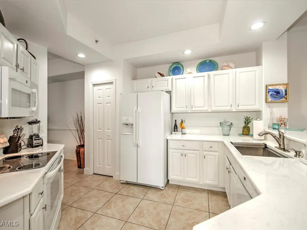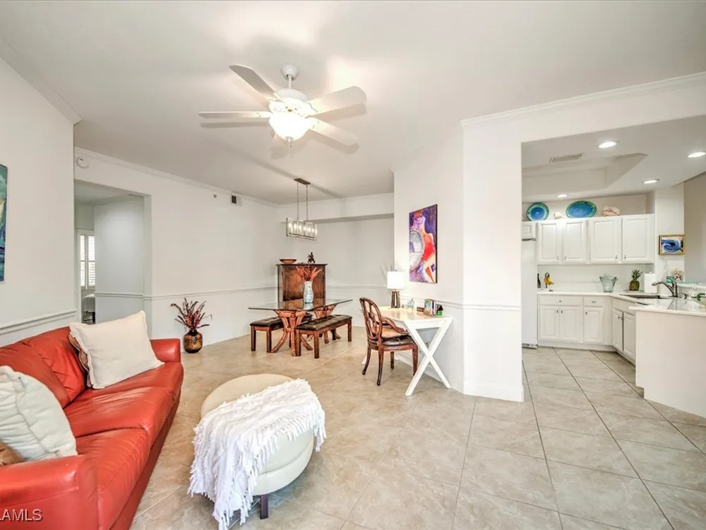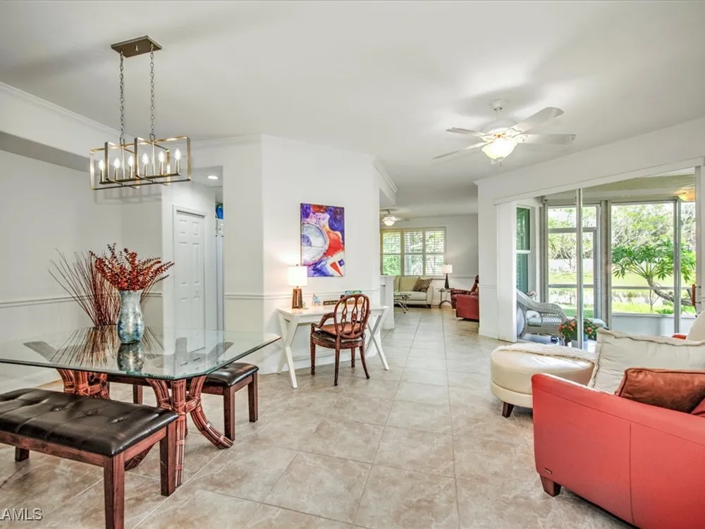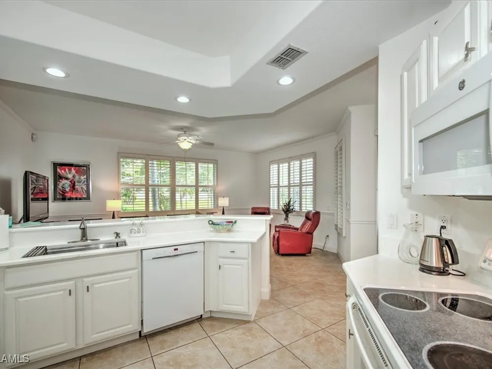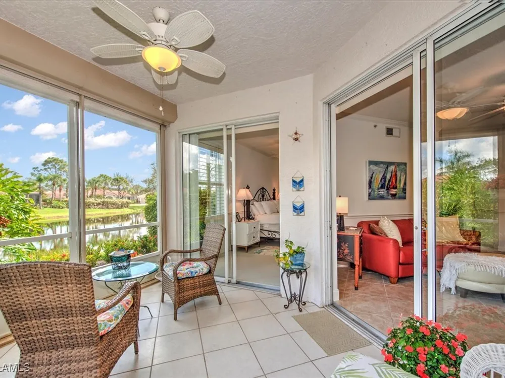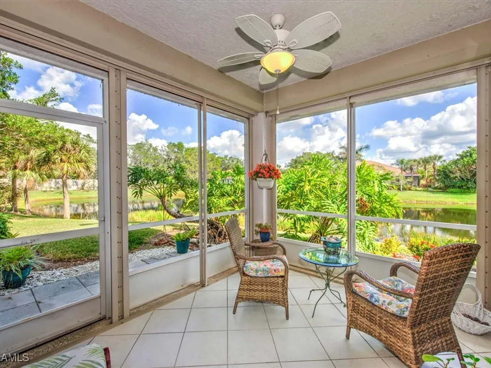 Beautiful, Corner Unit on Serene Pond with Screened Lanai and attached one-car garage. This freshly painted, light and bright unit features 2 bedrooms and 2 bathrooms plus den; newer quartz counters, freshly painted cupboards, new microwave in open kitchen; beautiful new chandelier in dining room; new LV floors in bedroom areas and tile in living areas; new counters and new lighting in both bathrooms; brand-new LC washer and dryer in laundry room. Great, friendly, small community with pool. Whisper Trace is located in Fiddler's Creek, a 5+ amenities rich membership community with 2 pools, 2 restaurants, state-of-the-art gym, tennis courts, pickleball courts, classes, events and more! Golf Club membership is additional. Start living the Fiddler's Creek Lifestyle as an end user or investment opportunity.
