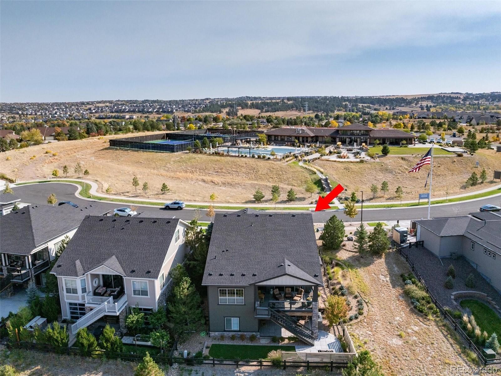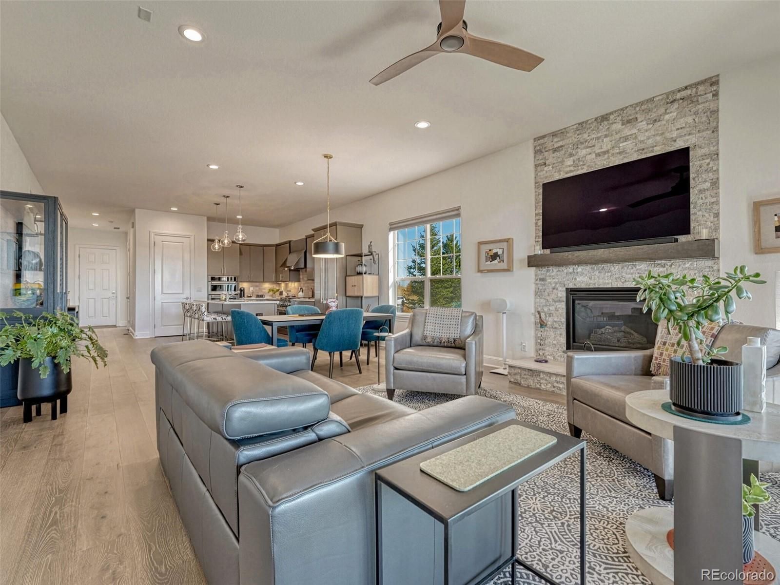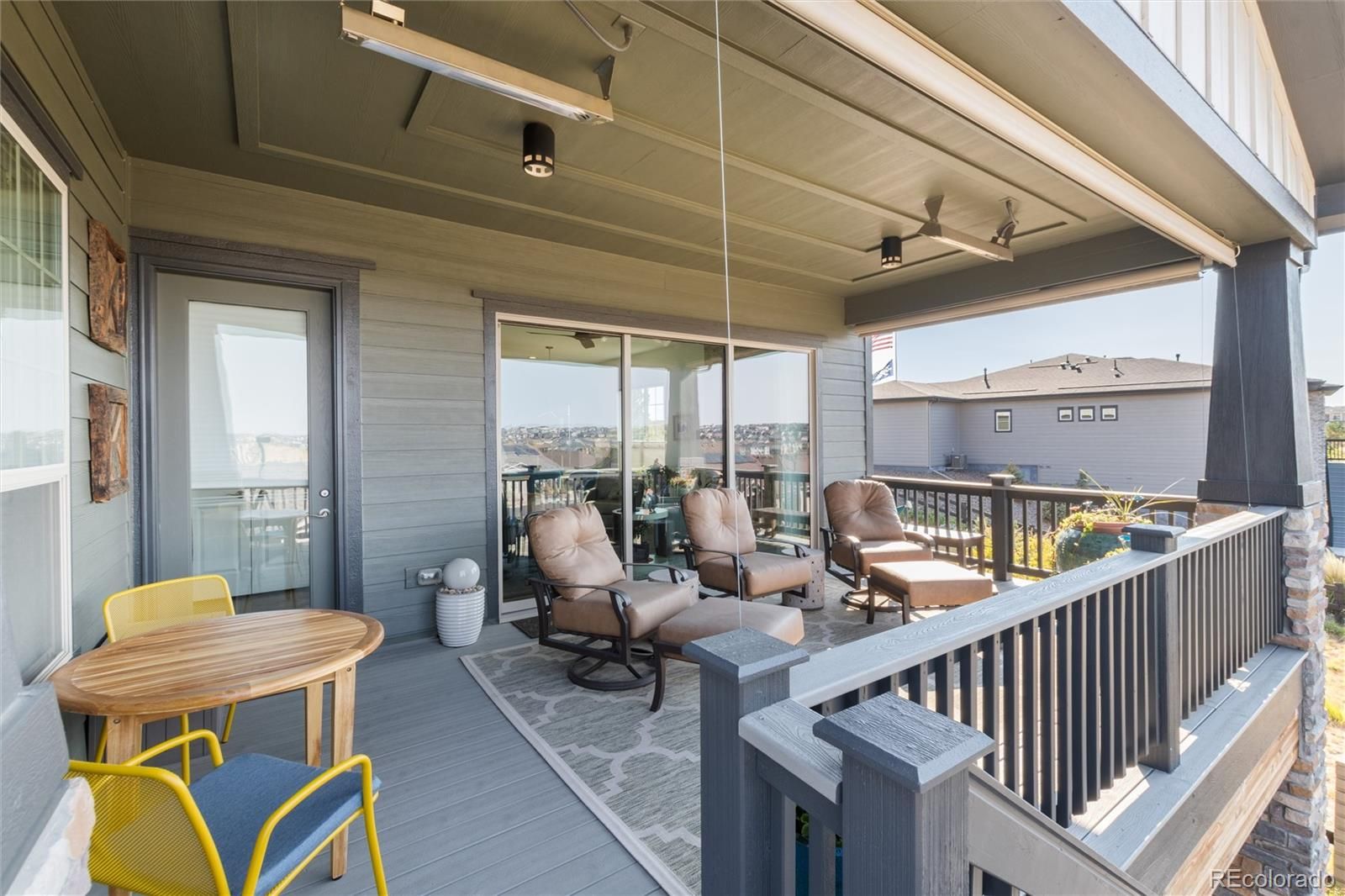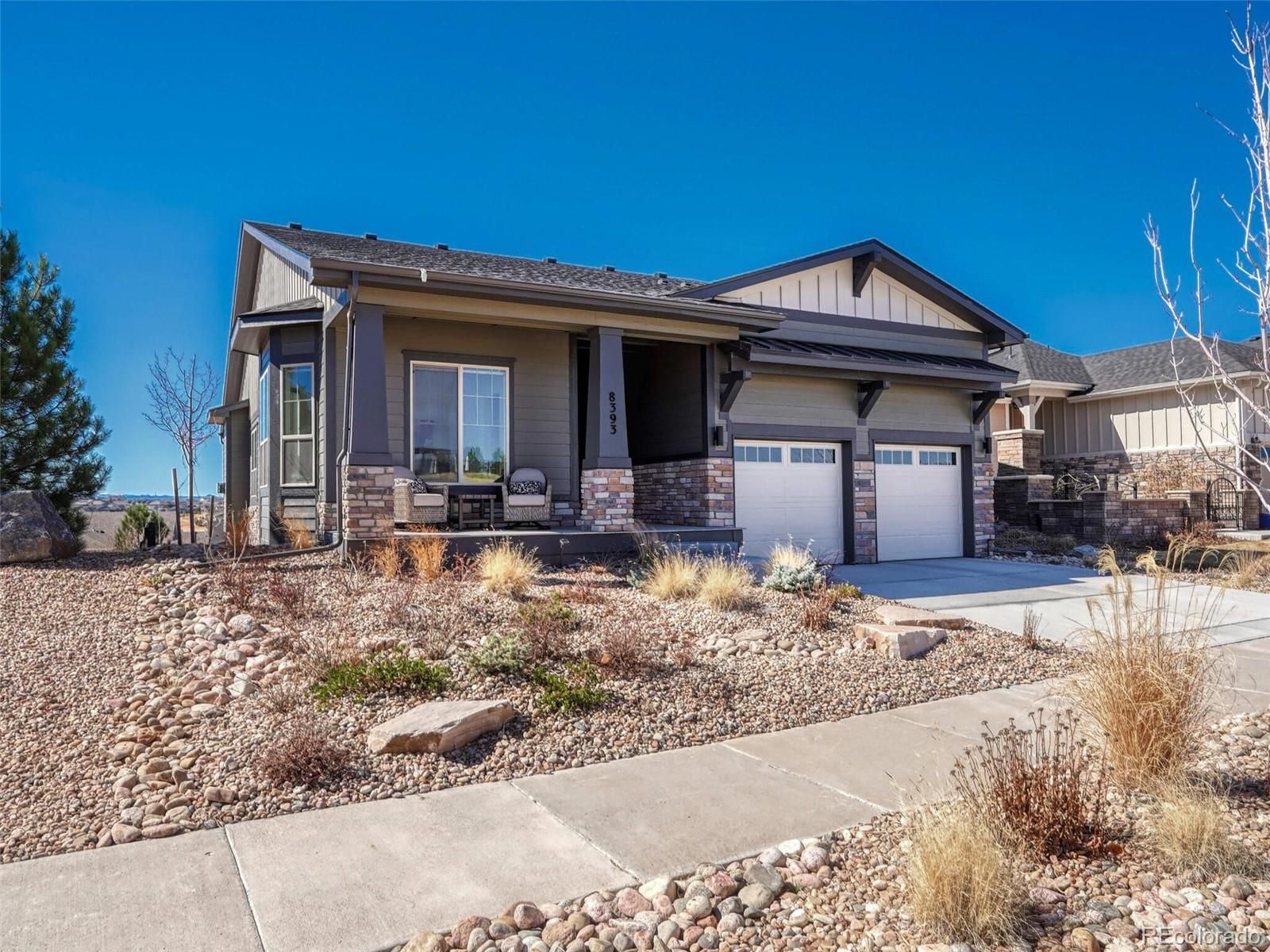 Have you ever heard of location-location-location? Well, this home is all about the location and views! Welcome to this exceptional Toll Brothers former model home on the most coveted street within the Inspiration 55+ community. One of the best features is your access to the clubhouse/pool right out your front door. The open floor plan seamlessly connects the living and dining areas with soaring 10-foot ceilings. The gourmet kitchen is a chef's dream, boasting a huge island, a spacious walk-in pantry, two ovens, and a beautiful hood over the gas cooktop. The living area has a floor-to-ceiling stone gas fireplace and an eight-foot stacker sliding door leading to the expanded heated deck, bringing the outdoors in. Imagine watching the weather roll over the mountains and enjoying the spectacular sunsets. The front and back yard is xeriscaped, and no mowing is needed; enjoy the cozy firepit and a built-in gas grill with family and friends. An easement, both behind and on one side of the home, provides an enjoyable space between homes. Electric custom sun shades on both the upper deck and lower patio provide comfort for outdoor relaxation, and electric heaters keep you cozy to enjoy the deck almost year-round. Retreat to the "expanded" luxurious primary bedroom and en suite, which features two walk-in closets, dual vanities, and an upgraded tile shower with a bench. Wake up to stunning views right from your bed! The versatile layout includes a study, guest suite, and full bathroom. A walkout basement ready to finish, the potential for additional living space is limitless. Newer roof, exterior paint, and lighting are just some upgrades. Location is key—just steps from your front door to the clubhouse, pool, workout facilities, and pickleball/tennis courts. Enjoy easy access to all amenities and soak in the sounds of concerts from your front porch. Don't miss your chance to experience this beautifully appointed home with views and amenities at your fingertips!