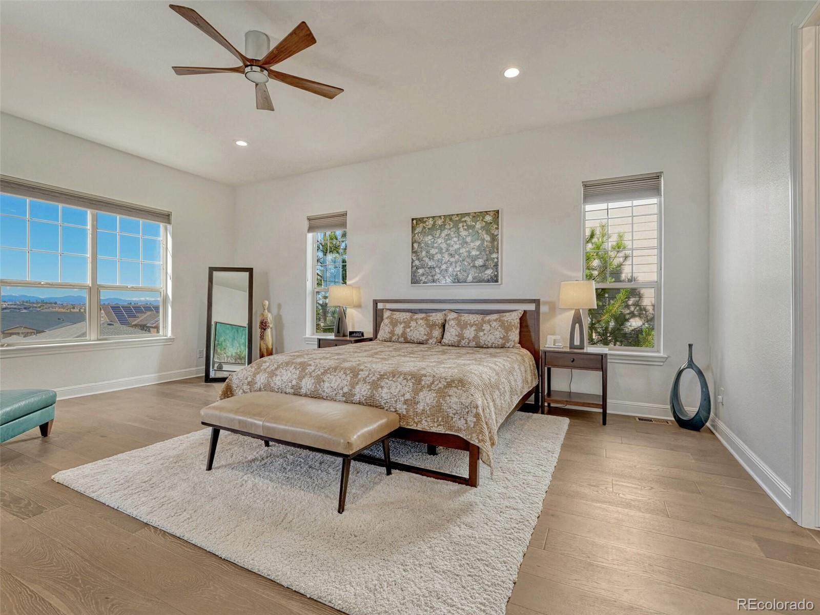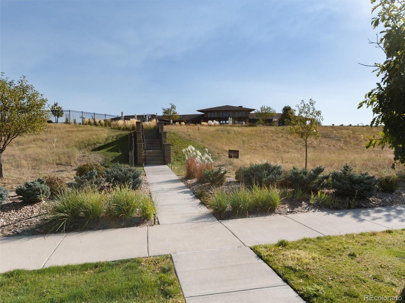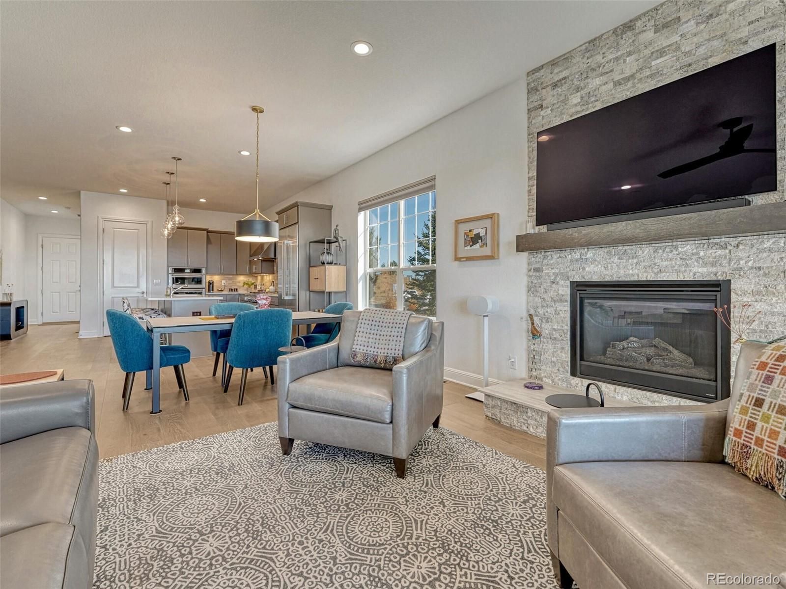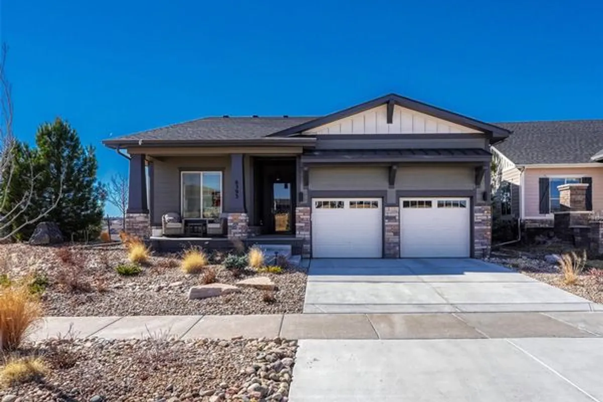 Have you ever heard of location-location-location? Well, this home is all about the location and views! Welcome to this exceptional Toll Brothers former model home on the most coveted street within the Inspiration 55+ community. One of the best features is your access to the clubhouse/pool right out your front door. The open floor plan seamlessly connects the living and dining areas with soaring 10-foot ceilings. The gourmet kitchen is a chef's dream, boasting a huge island, a spacious walk-in pantry, two ovens, and a beautiful hood over the gas cooktop. The living area has a floor-to-ceiling stone gas fireplace and an eight-foot stacker sliding door leading to the expanded heated deck, bringing the outdoors in. Imagine watching the weather roll over the mountains and enjoying the spectacular sunsets. The front and back yard is xeriscaped, and no mowing is needed; enjoy the cozy firepit and a built-in gas grill with family and friends. An easement, both behind and on one side of the home, provides an enjoyable space between homes. Electric custom sun shades on both the upper deck and lower patio provide comfort for outdoor relaxation, and electric heaters keep you cozy to enjoy the deck almost year-round. Retreat to the "expanded" luxurious primary bedroom and en suite, which features two walk-in closets, dual vanities, and an upgraded tile shower with a bench. Wake up to stunning views right from your bed! The versatile layout includes a study, guest suite, and full bathroom. A walkout basement ready to finish, the potential for additional living space is limitless. Newer roof, exterior paint, and lighting are just some upgrades. Location is key—just steps from your front door to the clubhouse, pool, workout facilities, and pickleball/tennis courts. Enjoy easy access to all amenities and soak in the sounds of concerts from your front porch. Don't miss your chance to experience this beautifully appointed home with views and amenities at your fingertips!