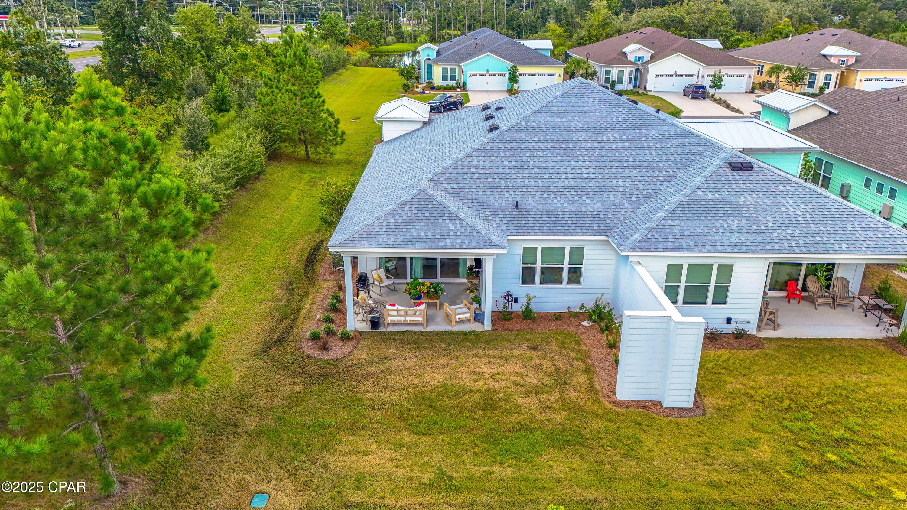 Welcome to Latitude Margaritaville Watersound, a luxurious 55+ gated community on Panama City Beach! This home is conveniently located in phase 3 near all amenities, home is on an end lot with plenty of privacy. This beautifully-designed, single-level, Barbuda Bay Villa offers 2 bedrooms, 2 baths, a den, covered lanai, 2 car garage and 1,787 square feet of living space. This 2023-built, highly-upgraded Villa is so welcoming and you'll love enjoying the indoor-outdoor living we love in Florida for all months of the year. As you step into this Villa, you'll find 9' ceilings, luxury LVP flooring throughout, and an open concept kitchen, living and dining area. An extended oversized kitchen island with beautiful Quartz countertops and upgraded Kitchen Aid suite stainless appliances is perfect for entertaining guests and sipping on margaritas...because it's always 5 o'clock somewhere! The living room features a tray ceiling to 10' and a large sliding glass door to the covered lanai. Just off the living room you'll find a true retreat. This primary suite offers views of your beautiful back yard, tray ceilings to 10' and a spacious primary suite bath with double vanities, a zero-entry tiled shower and a closet you've always dreamed of! This true split floor plan makes it great for guests to come visit and offers a full bedroom and bathroom on the front of the home. An added den is also great for flexibility for those who wish to work at home, have a bonus room for crafts or even additional sleeping space if desired. The laundry room is large and offers upgraded cabinetry and a laundry sink with access to the 2-car garage. This home offers the following as upgrades: hurricane rated impact windows, impact hurricane rated garage door, golf cart charging power supply for golf cart, LVP flooring, custom honeycomb window coverings, glass kitchen cabinets, pull out drawers in the kitchen cabinets, Kitchen Aid stainless appliances, natural gas range, Quartz countertops, tile to ceiling in showers, glass shower enclosure in primary suite, makeup vanity area in primary suite, undermount sinks, custom vanity mirrors, 8' doors, recessed lighting throughout, designer lighting, cabinet hardware, white shaker cabinetry and higher electrical outlets for TVs. Do not miss this opportunity to live in this gated community and start living your best life in Latitude Margaritaville Watersound! This community offers remarkable amenities where you'll enjoy a fitness center, movie theater, pet spa, business center, workshop, restaurants, resort-style community pool with beach entry and swim-up bar, tennis and pickle ball courts, bocce ball courts, kayak launch & more. Ideally located just minutes from the sandy beach, this Jimmy Buffet inspired community is a destination where it's always 5 o'clock somewhere! Inquire today to begin living your best life!