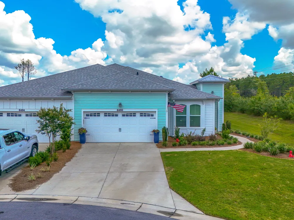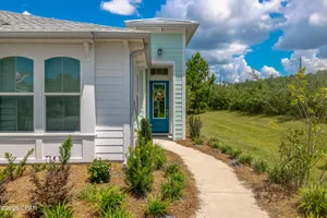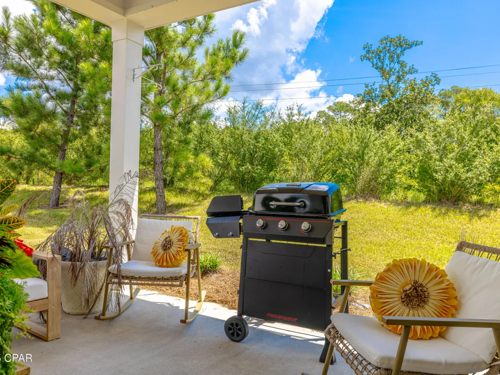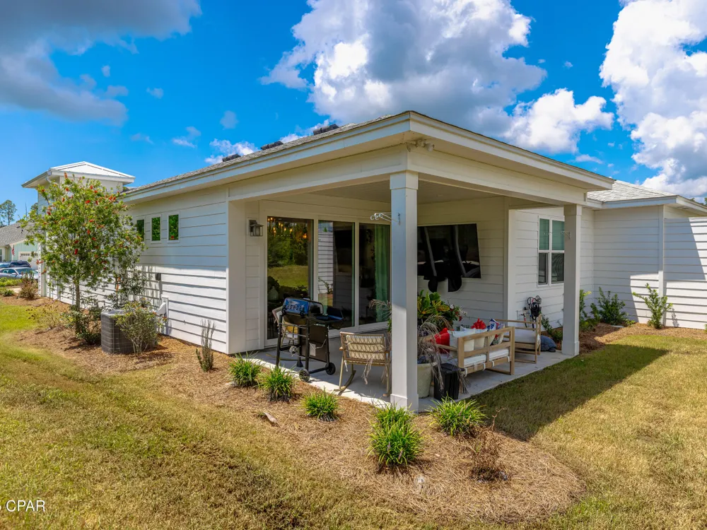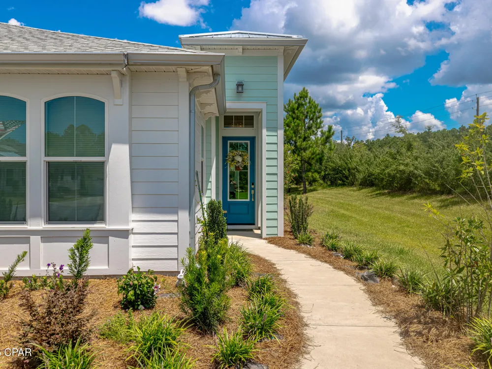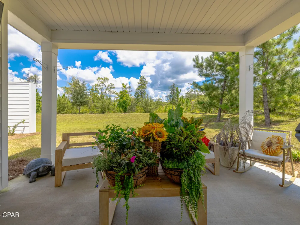 Motivated seller! Ask about FREE appraisal and NO lender fees (Total savings $1495)! EASY COASTAL LIVING IN PHASE 3 - LATITUDE AT WATERSOUND! A light-filled Florida-cottage home with the sought-after Barbuda Bay floor plan welcomes you with an open great room, raised/coffered ceilings, and a cook's kitchen featuring a gas range, generous island, pantry, and recessed lighting. The split layout creates a calm primary suite with a walk-in closet, double vanities, and a spacious shower, while a guest room and flexible den offer space for visitors, hobbies, or a home office. Quality touches include tile and luxury vinyl plank flooring, hurricane-rated impact windows and garage door, double-pane/storm protection, and tasteful window treatments, plus an attached garage and long driveway for easy coming and going. Step beyond the living area to discover what makes this home special: a private outdoor setting at the end of a quiet cul-de-sac. With thoughtful landscaping and a covered back porch, it's the perfect backdrop for slow mornings, evening grilling, and laid-back weekend gatherings—your own tucked-away retreat without leaving home. Residents enjoy gated entry and a suite of resort amenities: fitness center, pool, pickleball and tennis, dog park, theater, game room, pavilions, shuffleboard, fishing spots, sidewalks, and a lively calendar of activities. With quick access to Hwy 79 for shopping, dining, and beach days, this address pairs everyday convenience with a peaceful, private place to unwind.