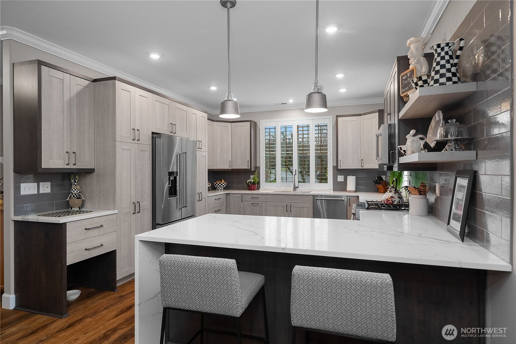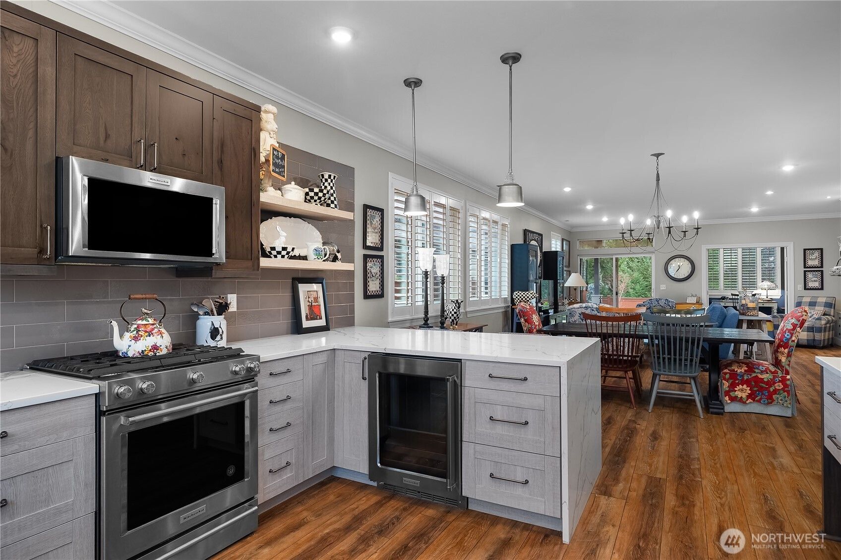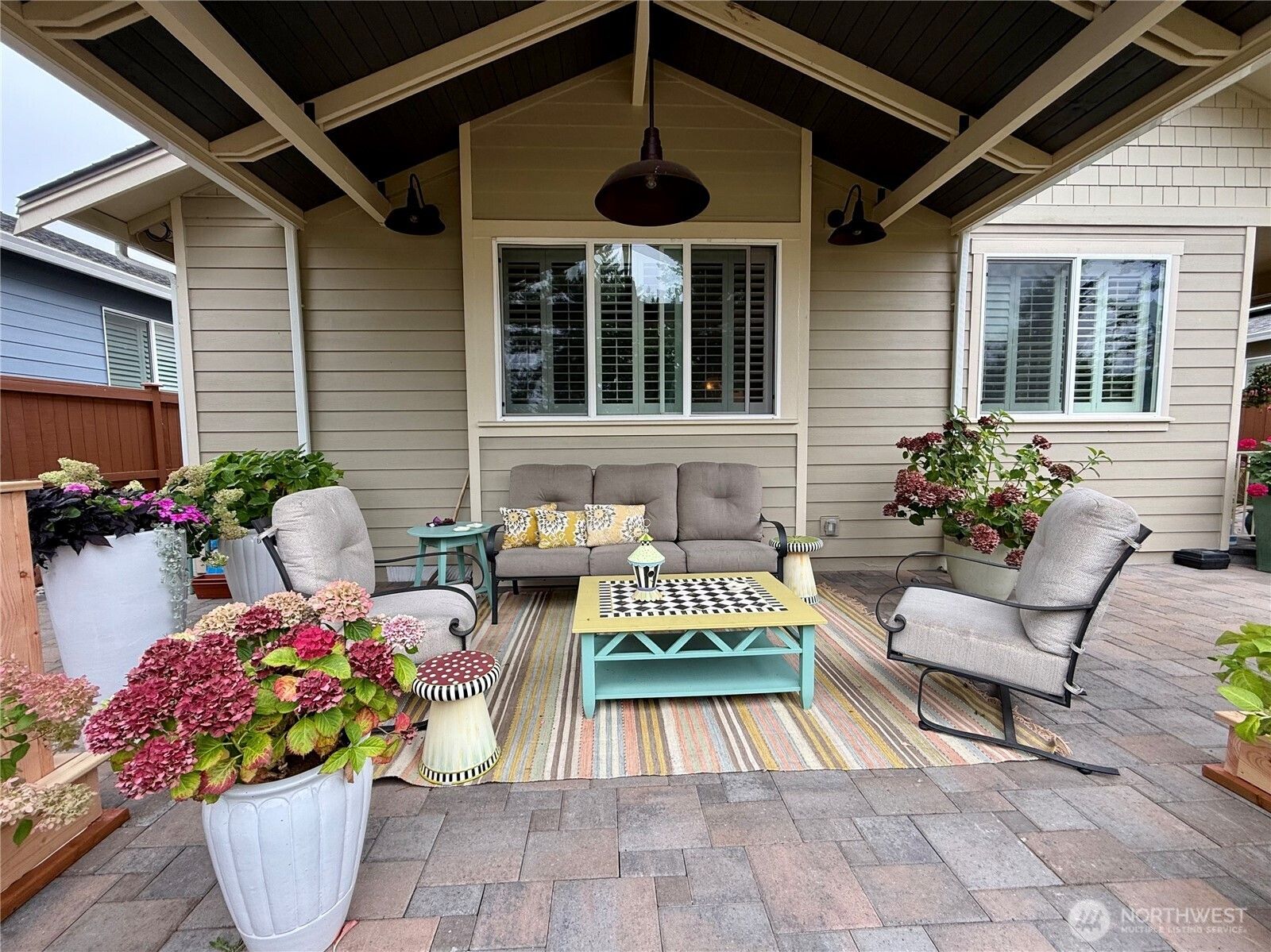 This CUSTOM Woodlands floorplan offers over $200,000 in upgrades with elevated design & functionality throughout. New Roof (2025), LVP flooring, crown molding, wood shutters, & California Closet system enhance the home. The remodeled kitchen features hickory-wrapped cabinetry, quartz waterfall countertops, subway tile backsplash, under-cabinet lighting, upgraded appliances, & a wine cooler. The living area showcases a fireplace with floor-to-ceiling stone & a reclaimed wood mantle. The primary bath includes a curbless tiled shower, frameless glass, floating vanity w/quartz countertops, & a transom window. Enjoy a redesigned backyard with expanded paver patio, custom patio cover with decorative lighting, & raised irrigated garden beds.