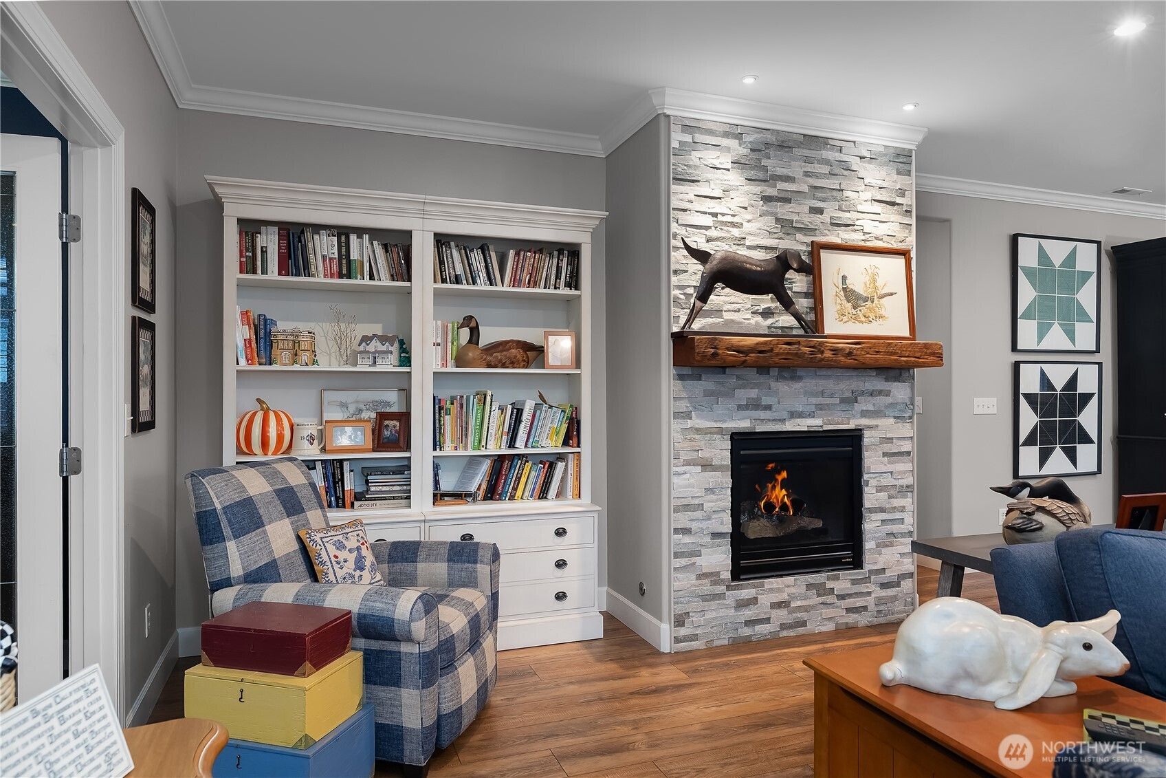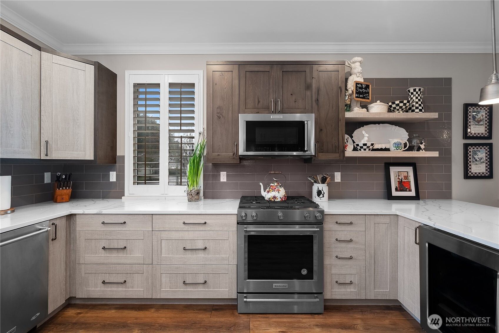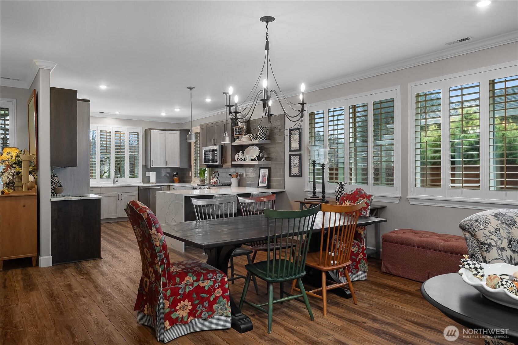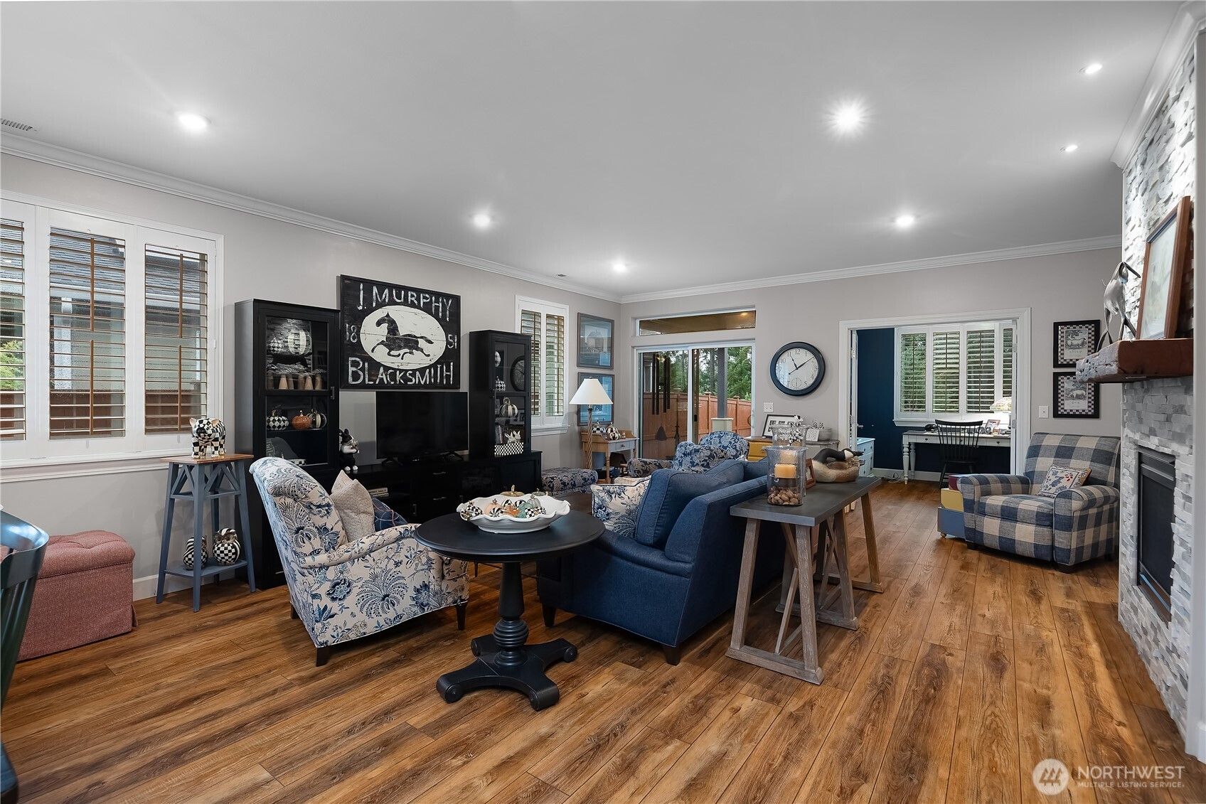 This CUSTOM Woodlands floorplan offers over $200,000 in upgrades with elevated design & functionality throughout. New Roof (2025), LVP flooring, crown molding, wood shutters, & California Closet system enhance the home. The remodeled kitchen features hickory-wrapped cabinetry, quartz waterfall countertops, subway tile backsplash, under-cabinet lighting, upgraded appliances, & a wine cooler. The living area showcases a fireplace with floor-to-ceiling stone & a reclaimed wood mantle. The primary bath includes a curbless tiled shower, frameless glass, floating vanity w/quartz countertops, & a transom window. Enjoy a redesigned backyard with expanded paver patio, custom patio cover with decorative lighting, & raised irrigated garden beds.